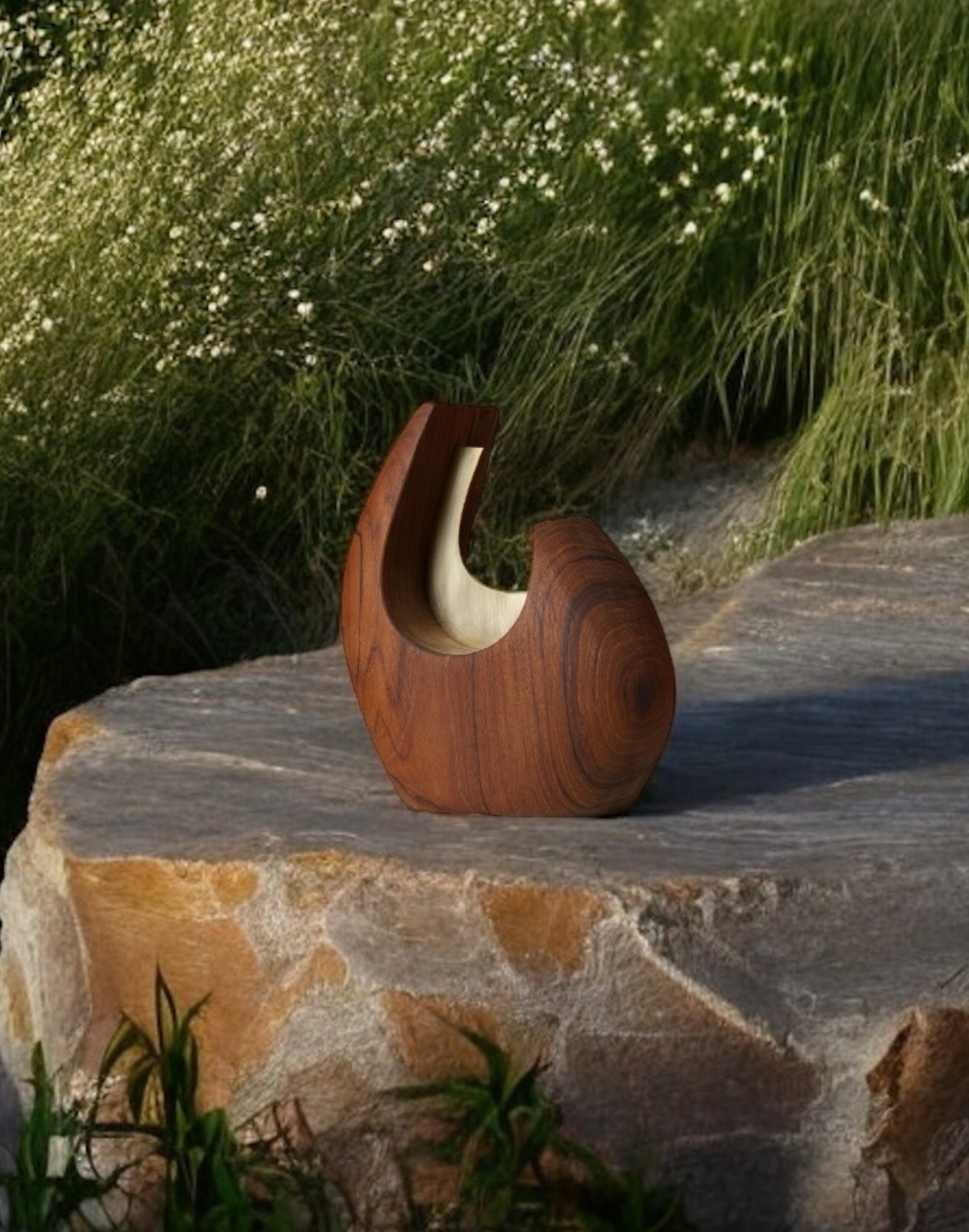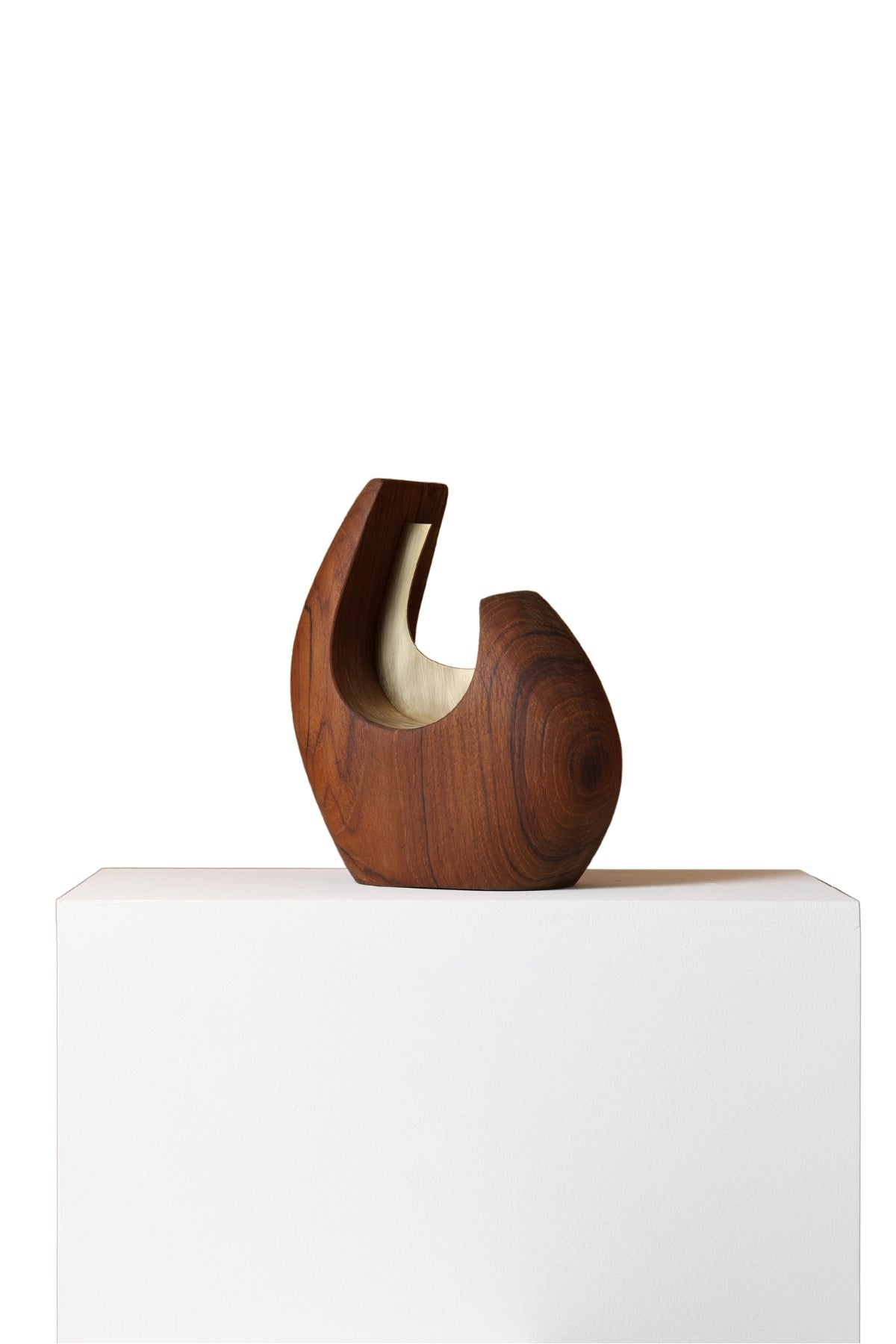 ADIRA 01 is a minimal and sculptural object crafted from seasoned teak wood and brass. Its compact form is defined by a gentle curve and a carved interior that reveals a soft brass lining, offering subtle contrast without interrupting the flow of the silhouette.