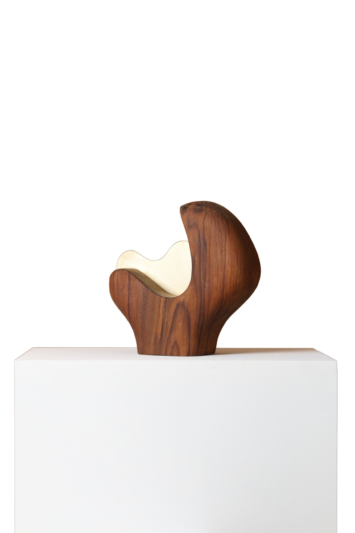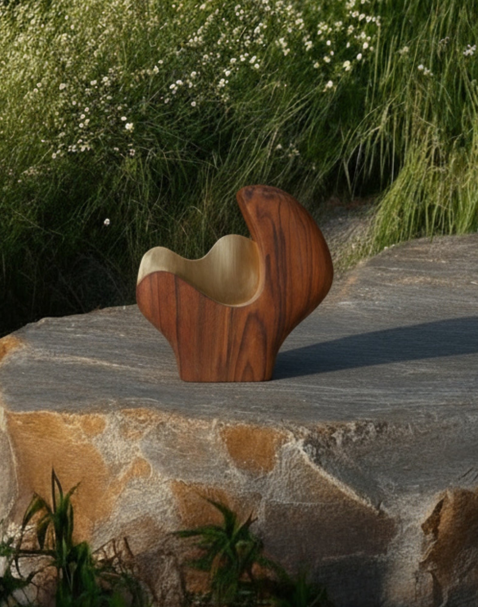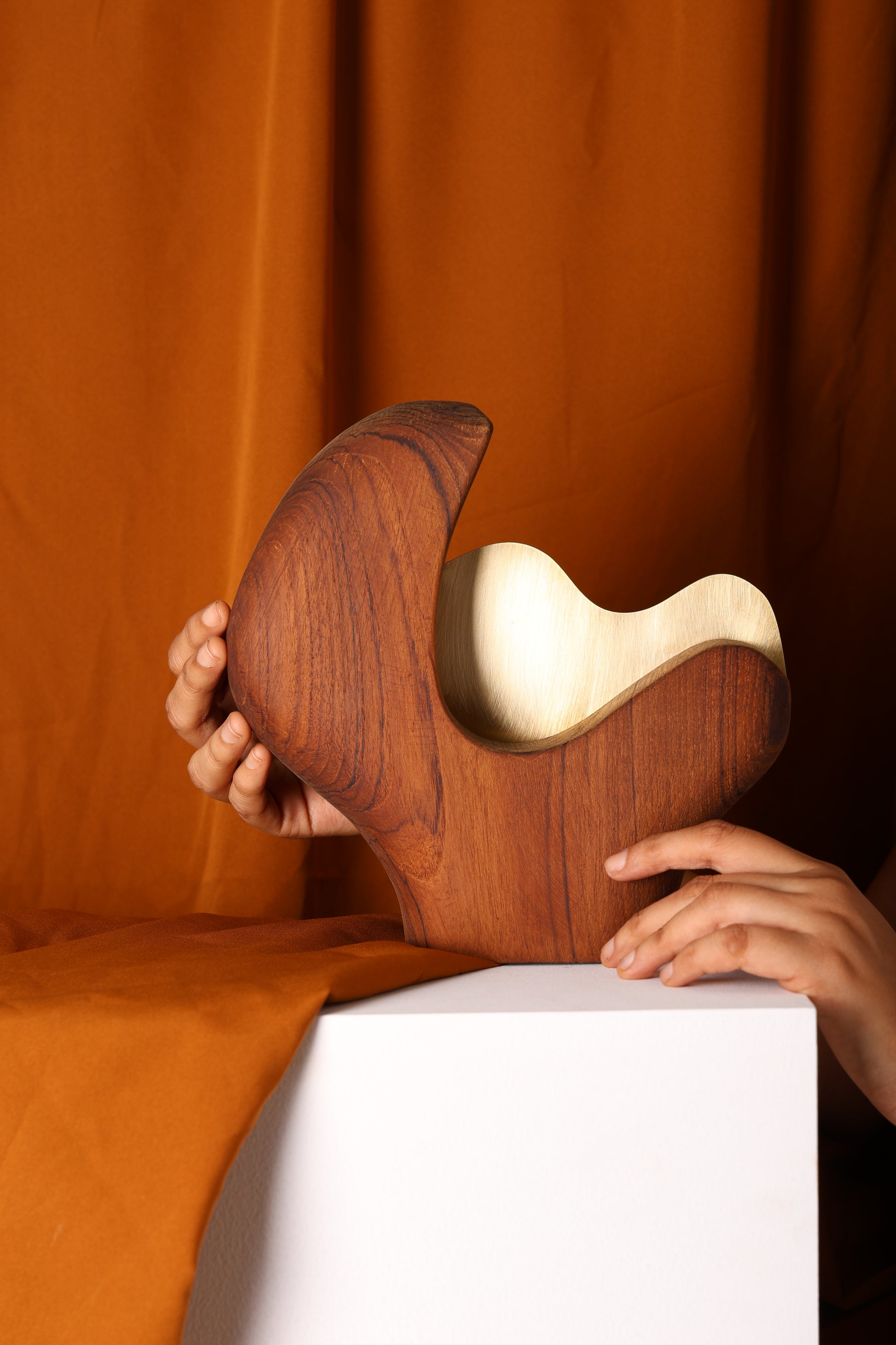 Handcrafted from teak wood and brass, its soft taper and sweeping curve draw the eye. A gentle brass detail adds contrast without overpowering.