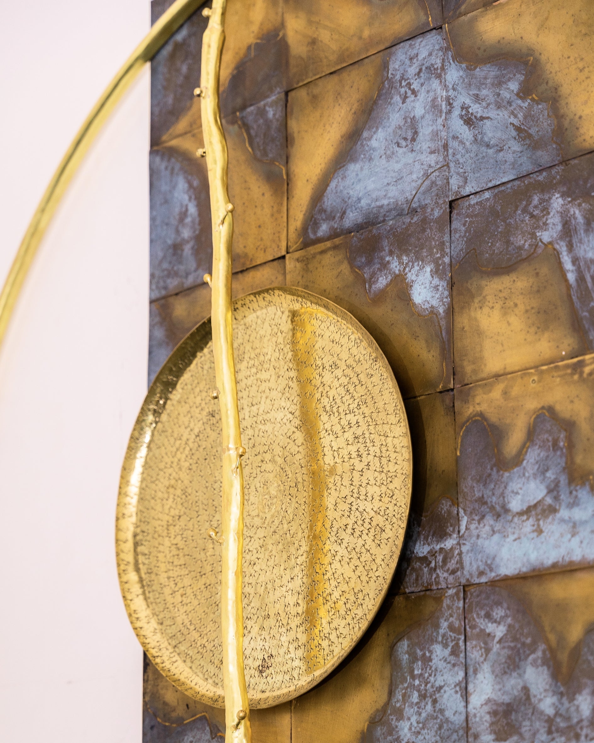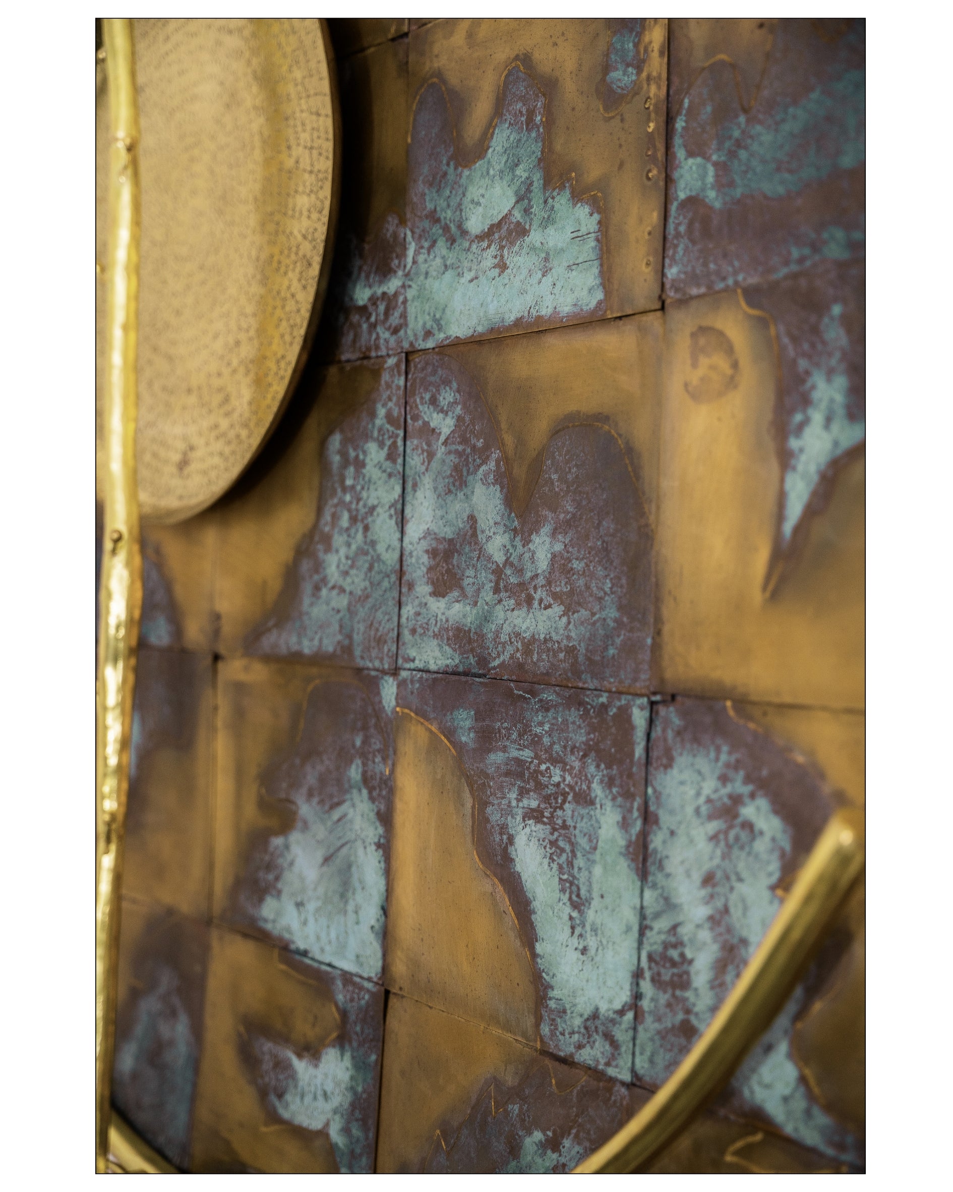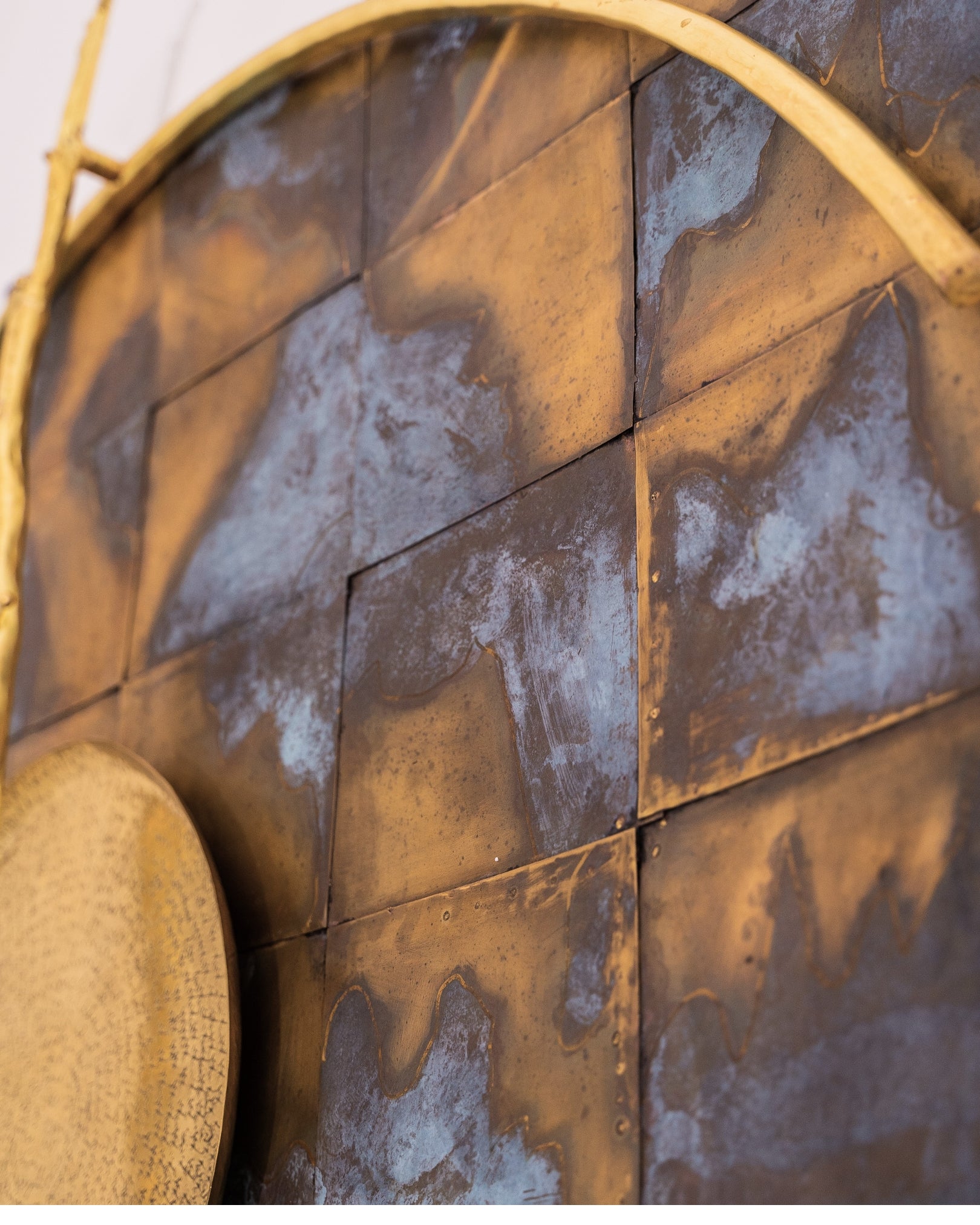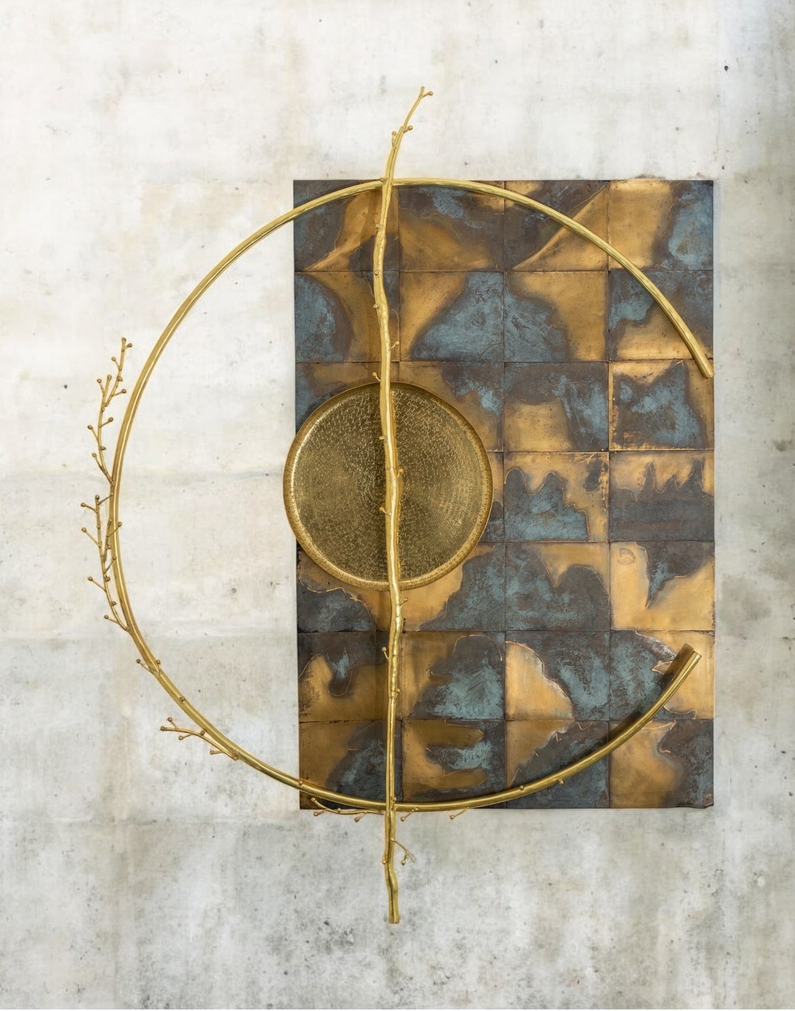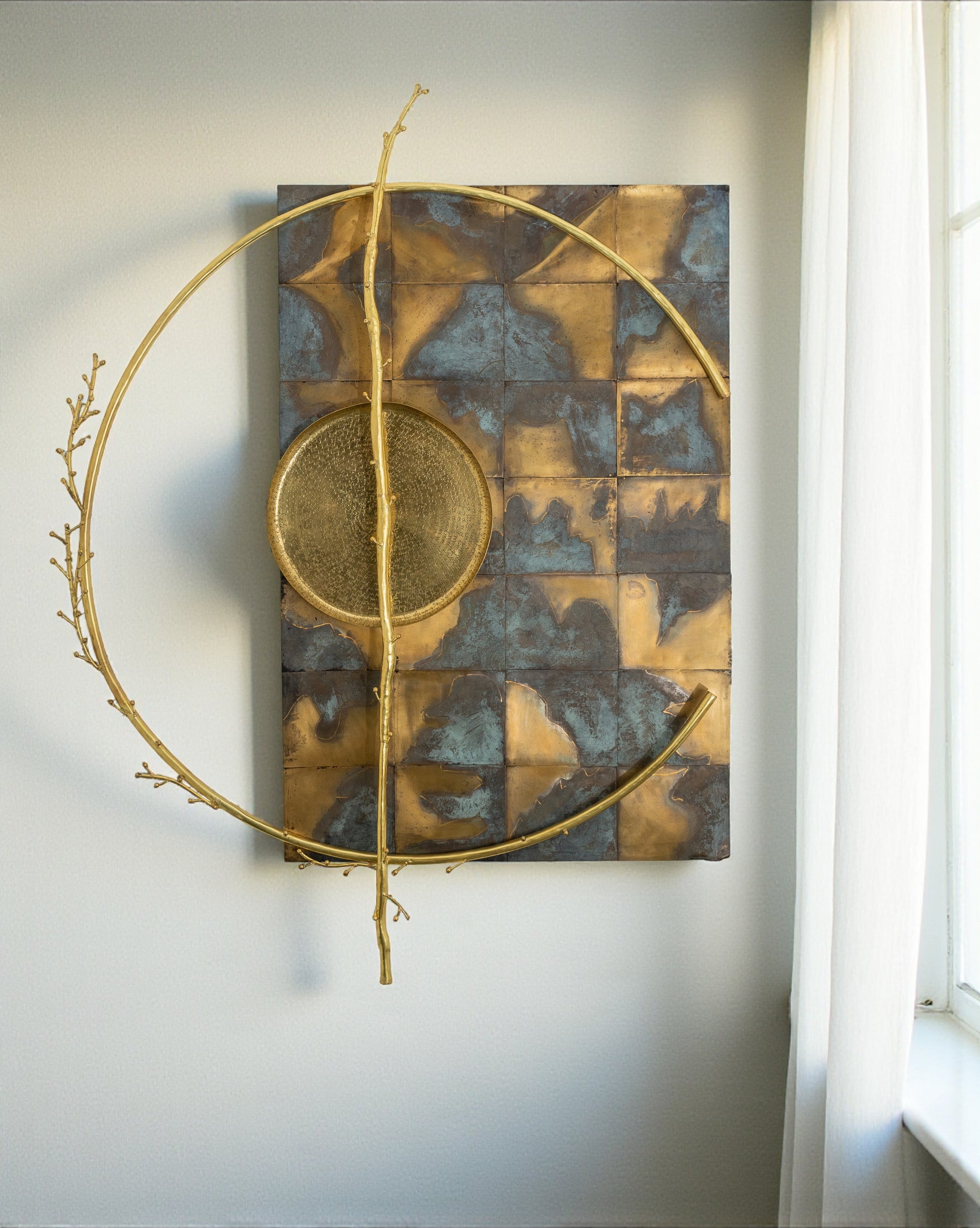 This handcrafted wall art in brass and patina is a striking blend of geometry and organic form. The circular frame, branch-like detailing, and textured center disc create a harmonious balance between nature and design.