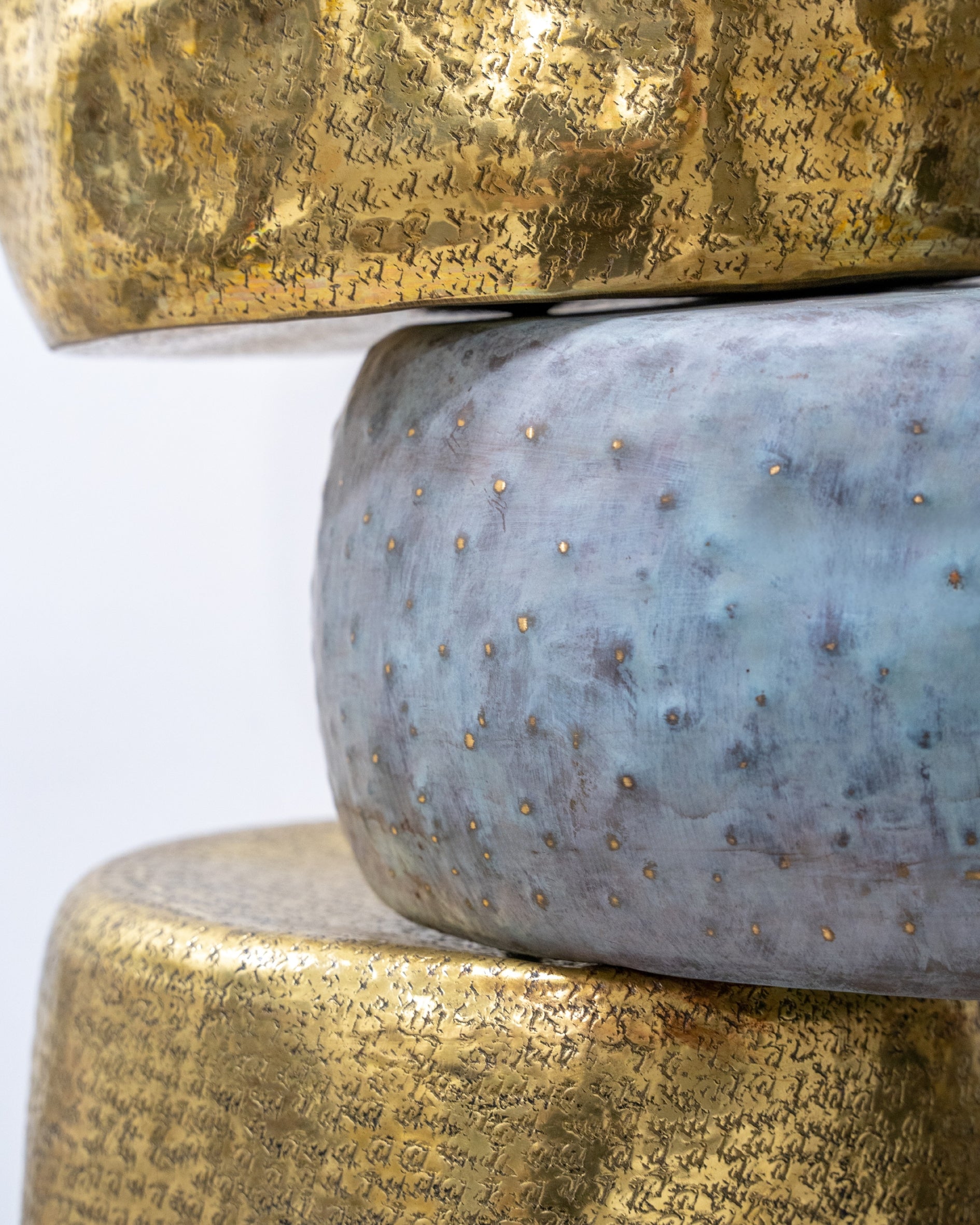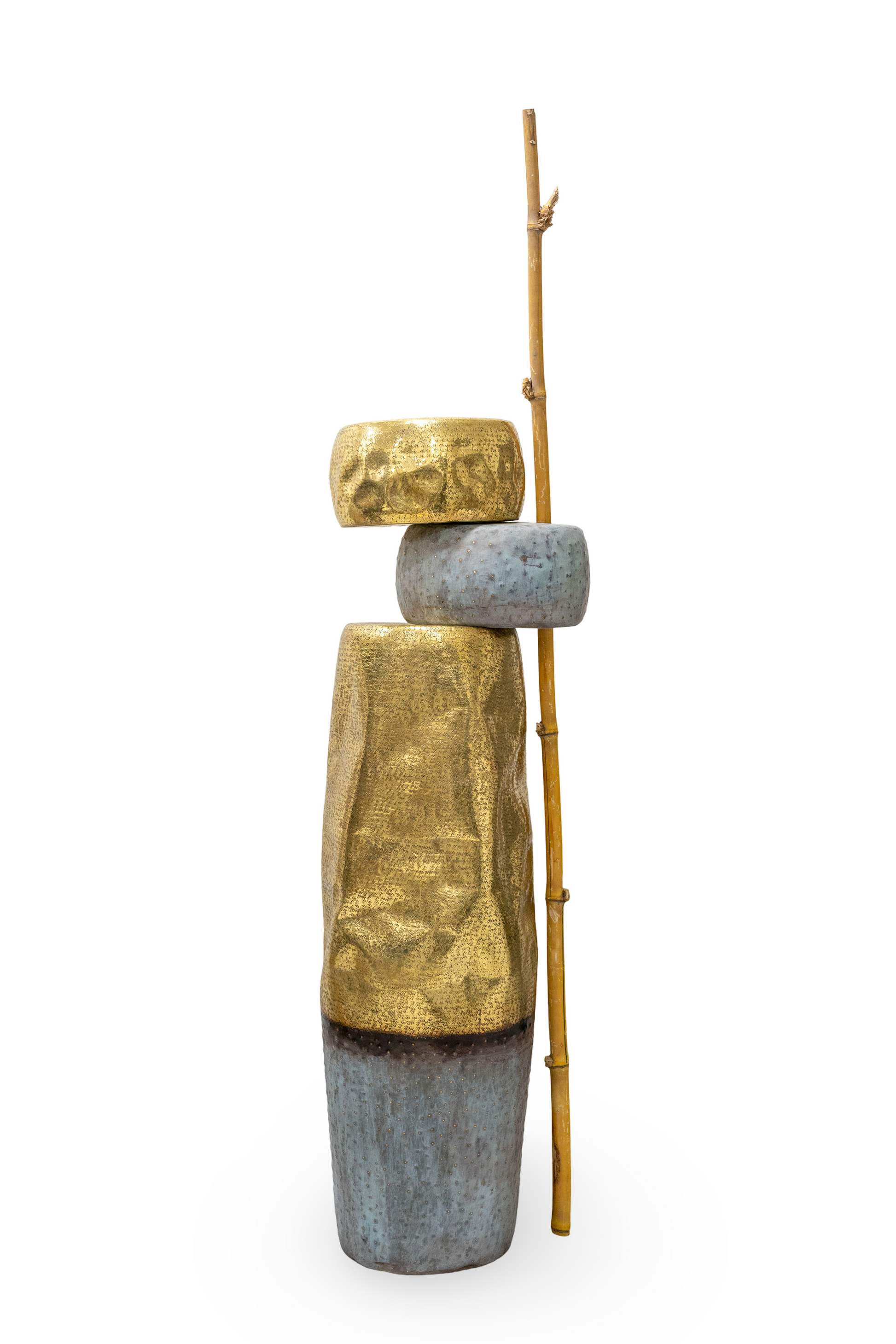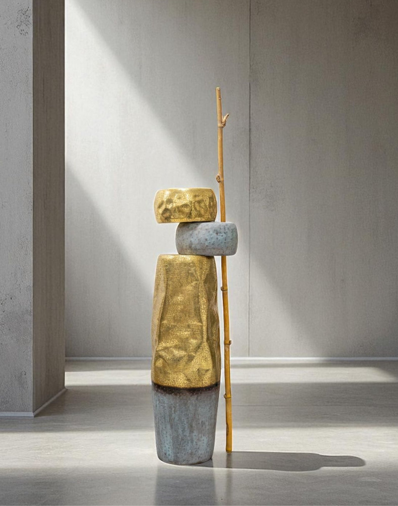 A contemporary brass and patina sculpture inspired by balance and nature, featuring textured stacked forms with a branch-like detail for a striking modern accent.