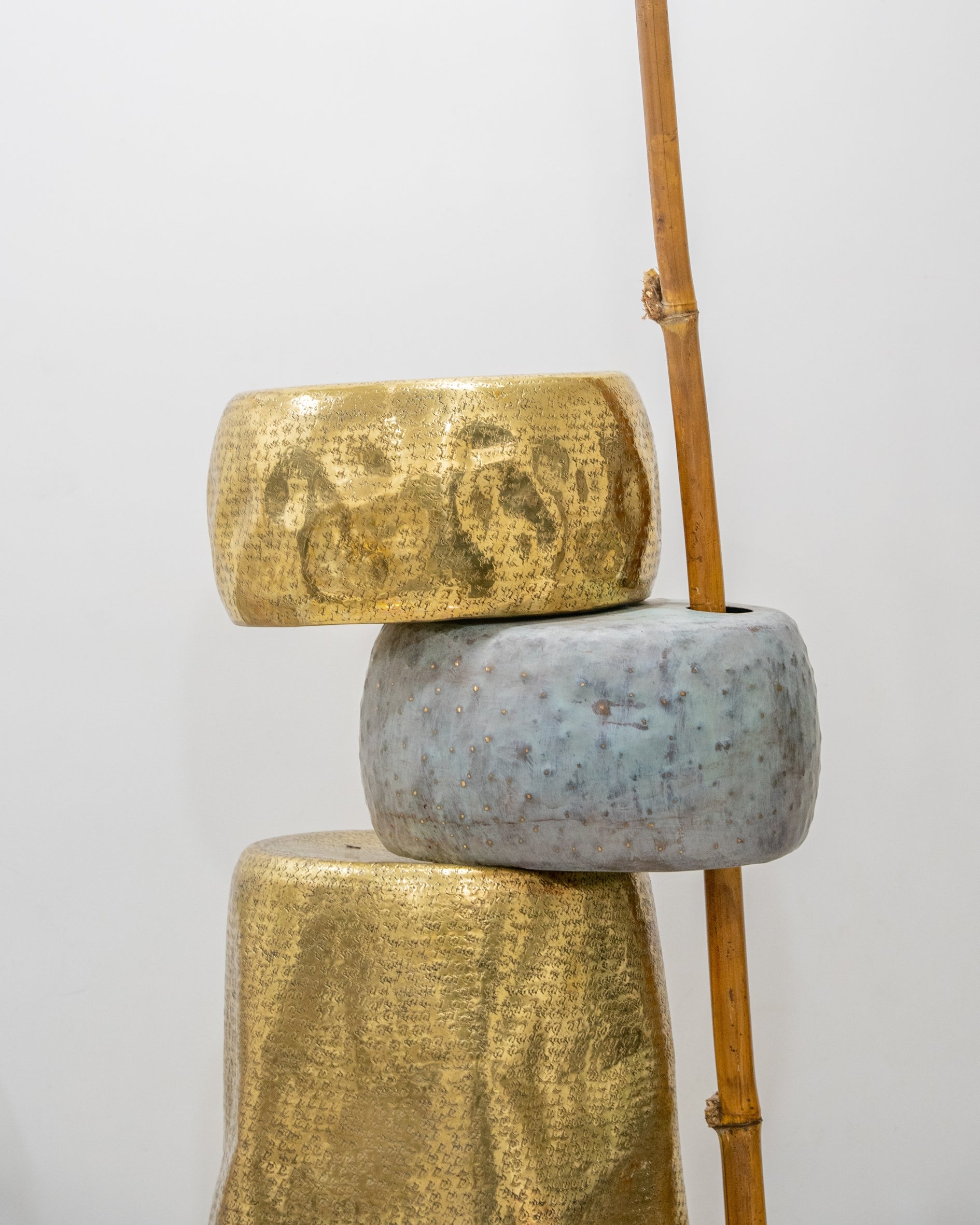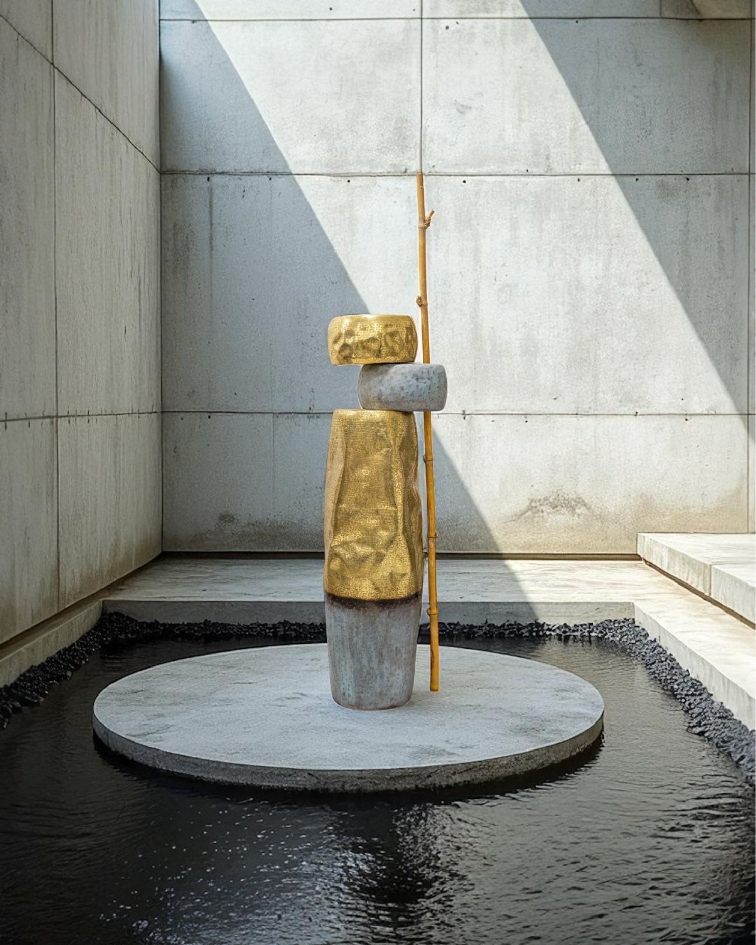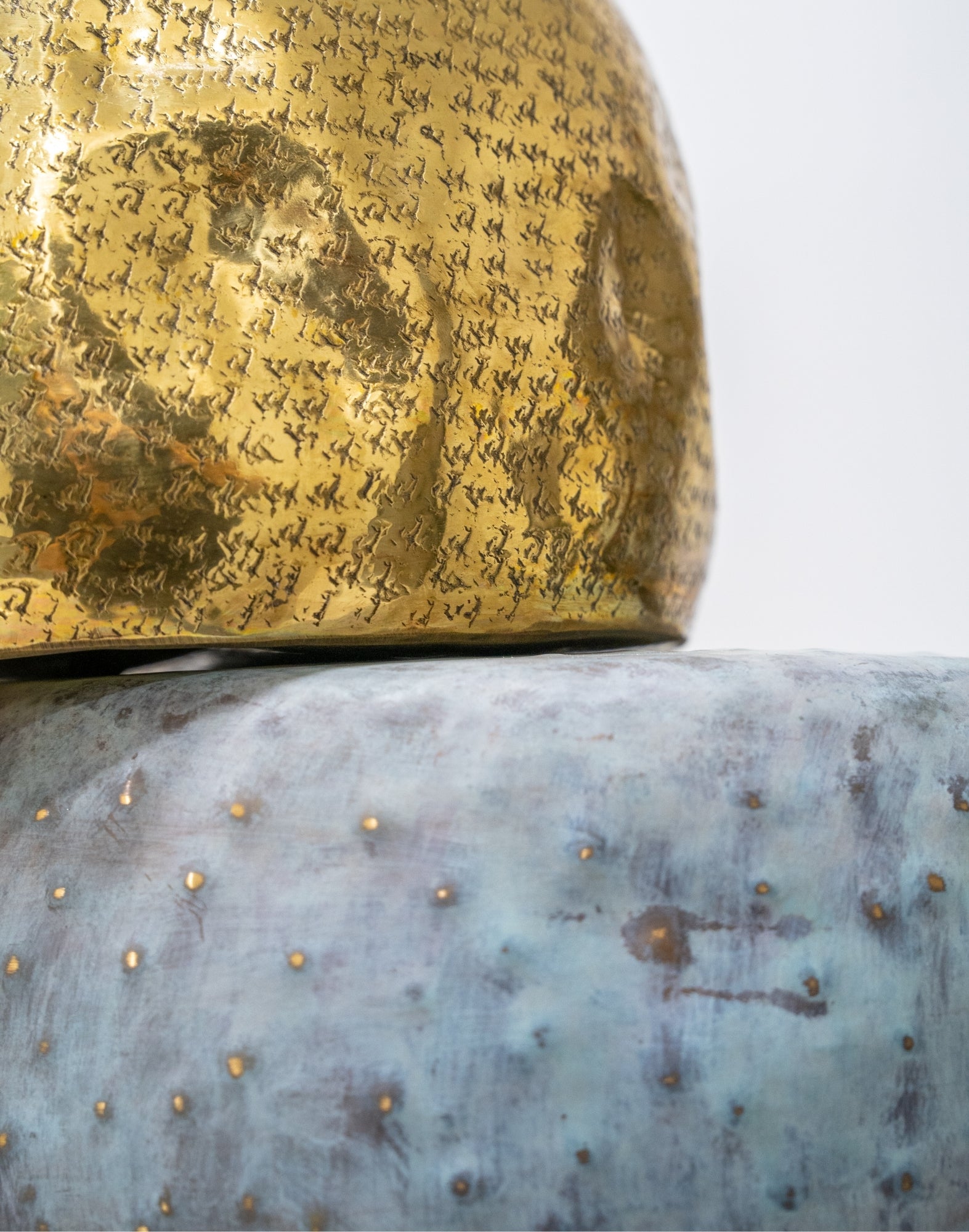 A contemporary brass and patina sculpture inspired by balance and nature, featuring textured stacked forms with a branch-like detail for a striking modern accent.
