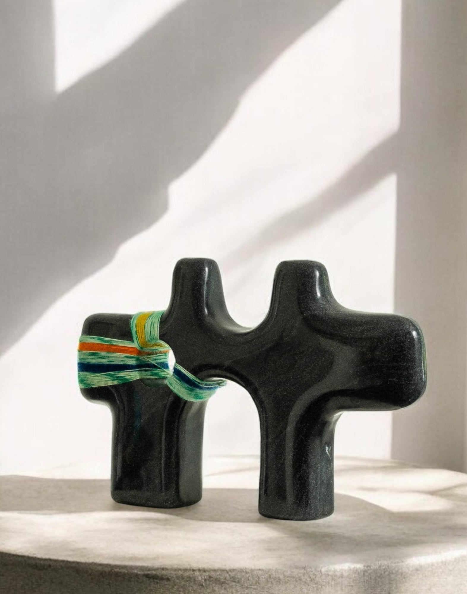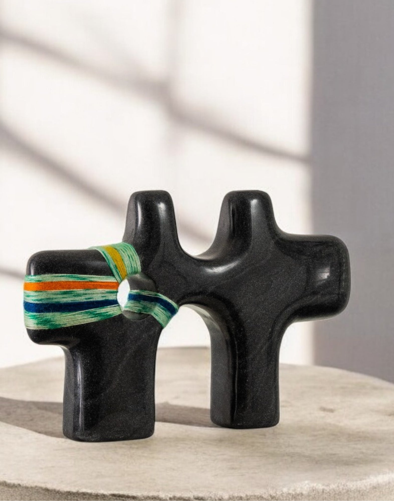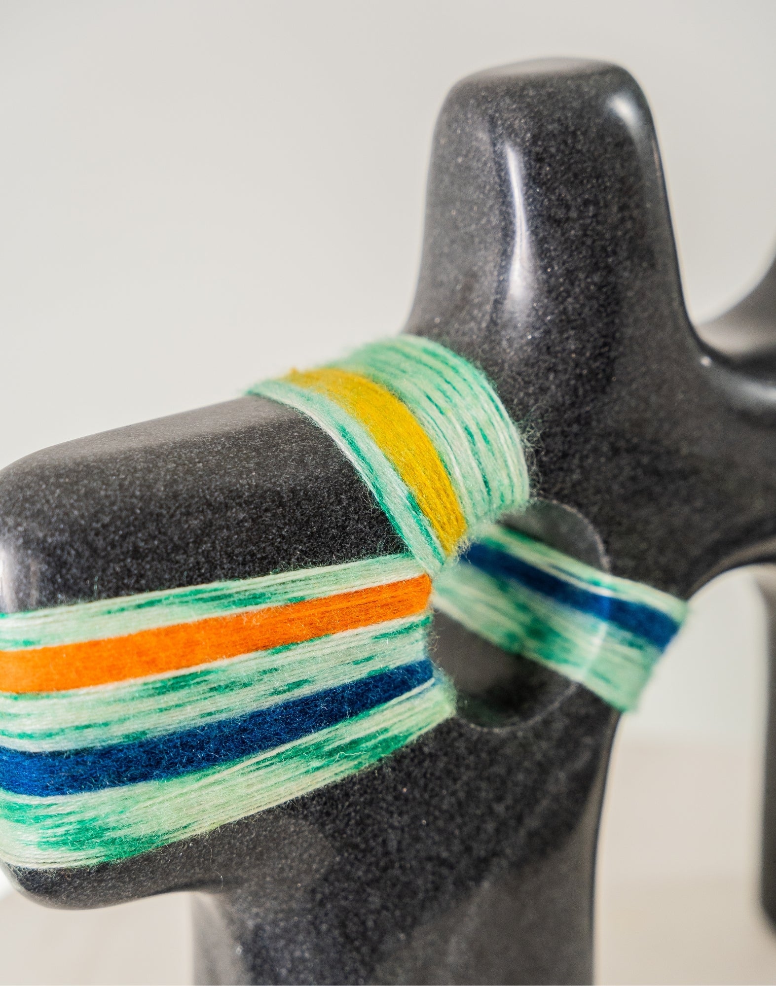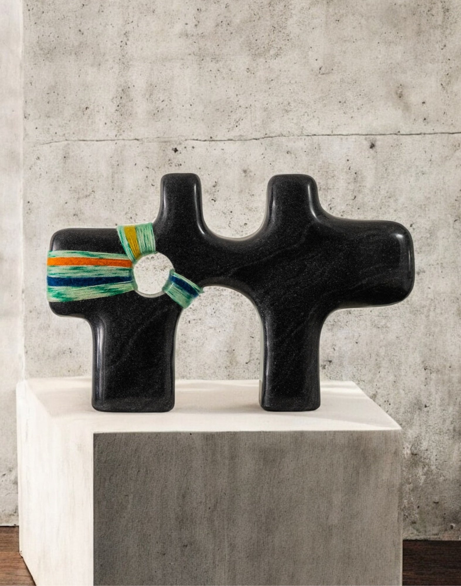 Carved from black marble and paired with hand-woven yarn, this piece merges raw earth and natural craft. The solid stone structure anchors the form with mass and depth, while the woven element adds texture and lightness, suggesting movement across an otherwise static surface.
