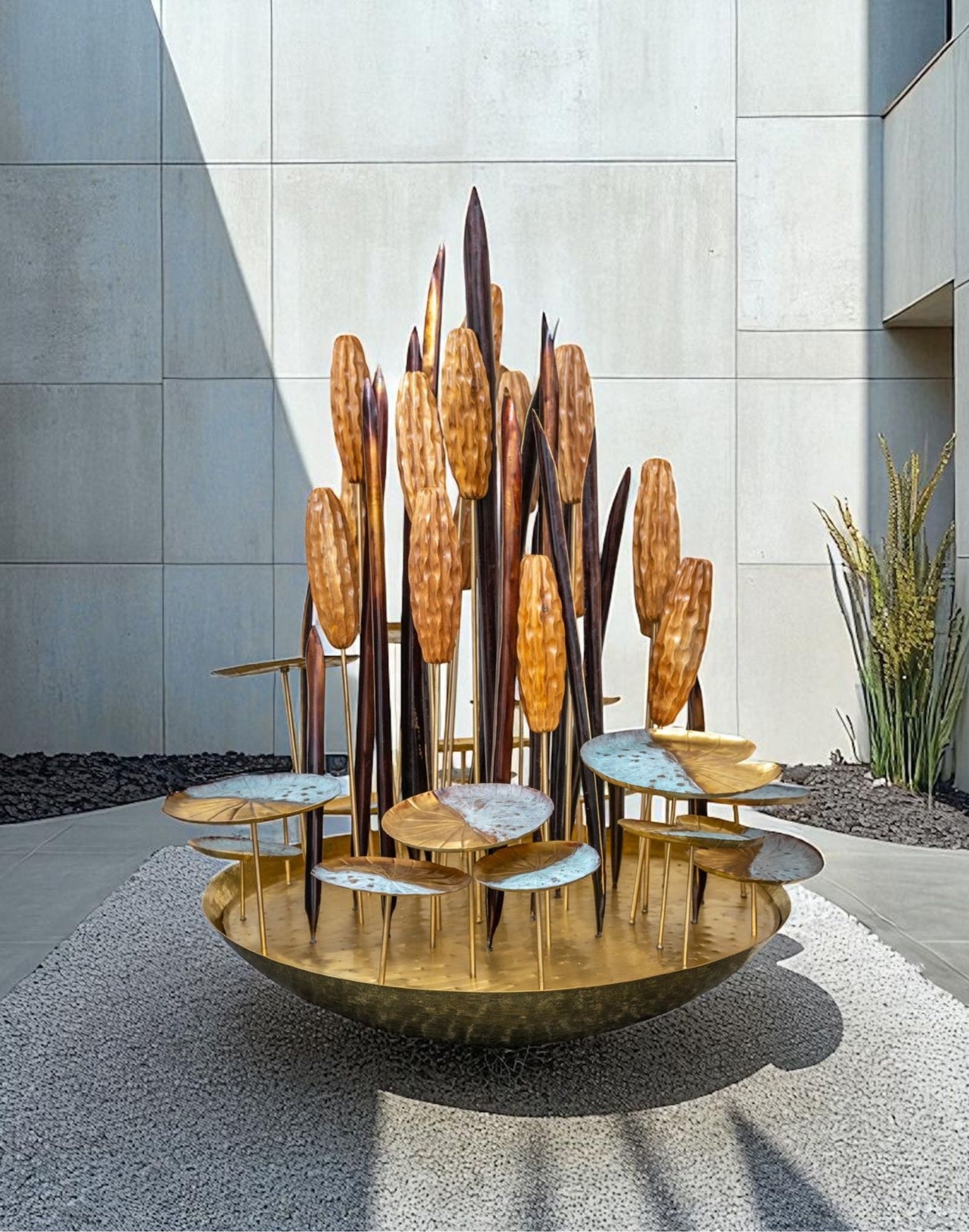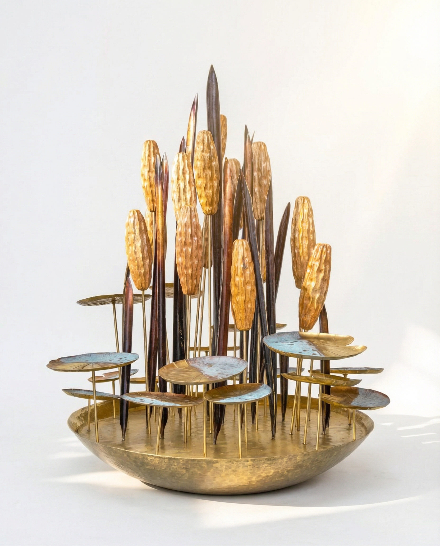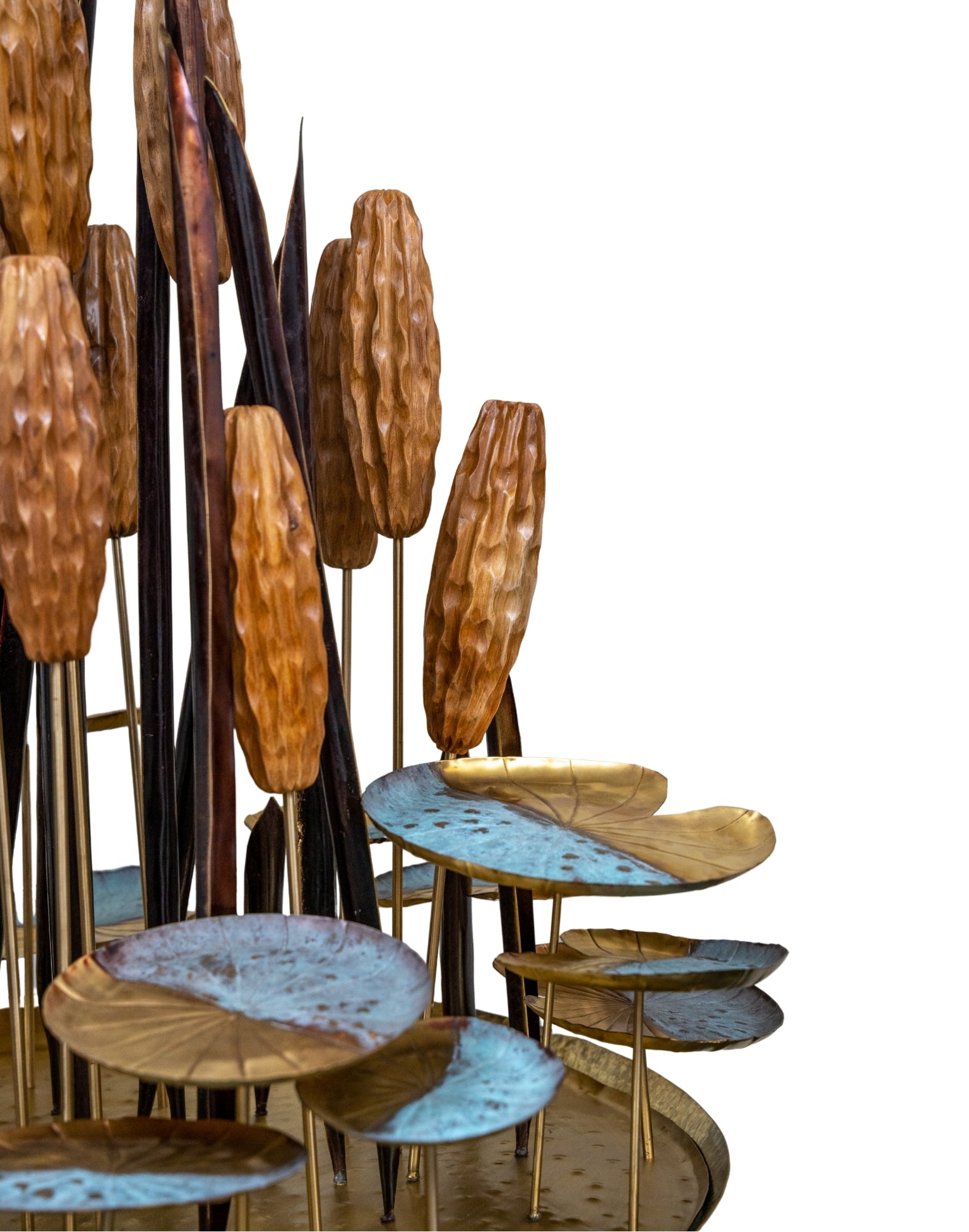 This sculpture draws inspiration from the stillness of a lotus pond. Elongated stems rise vertically, crowned with textured seed pods and delicately curved leaves that fan outward like ripples on water.