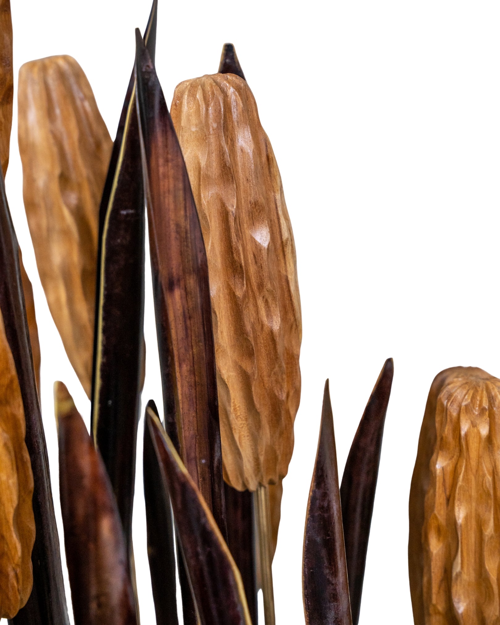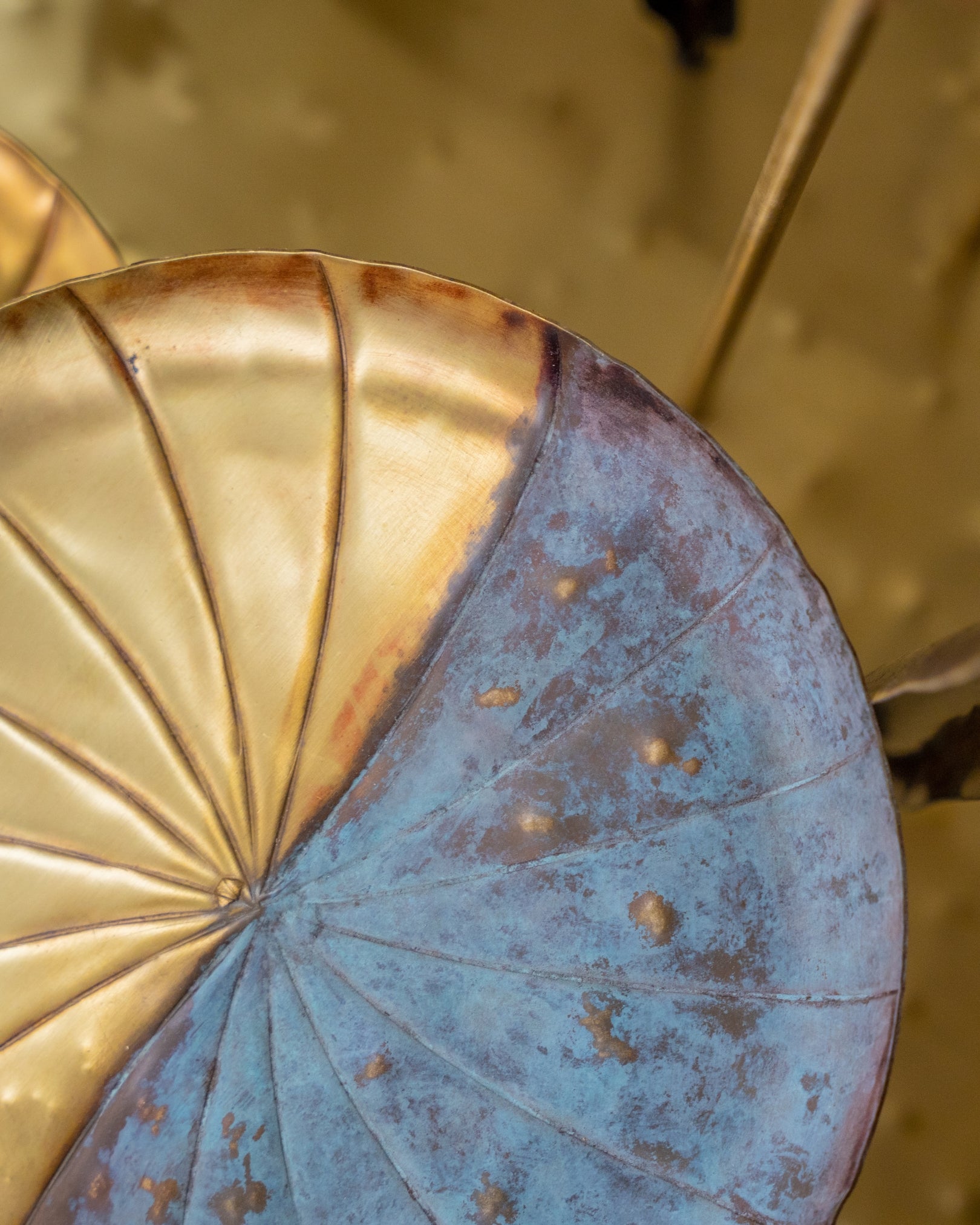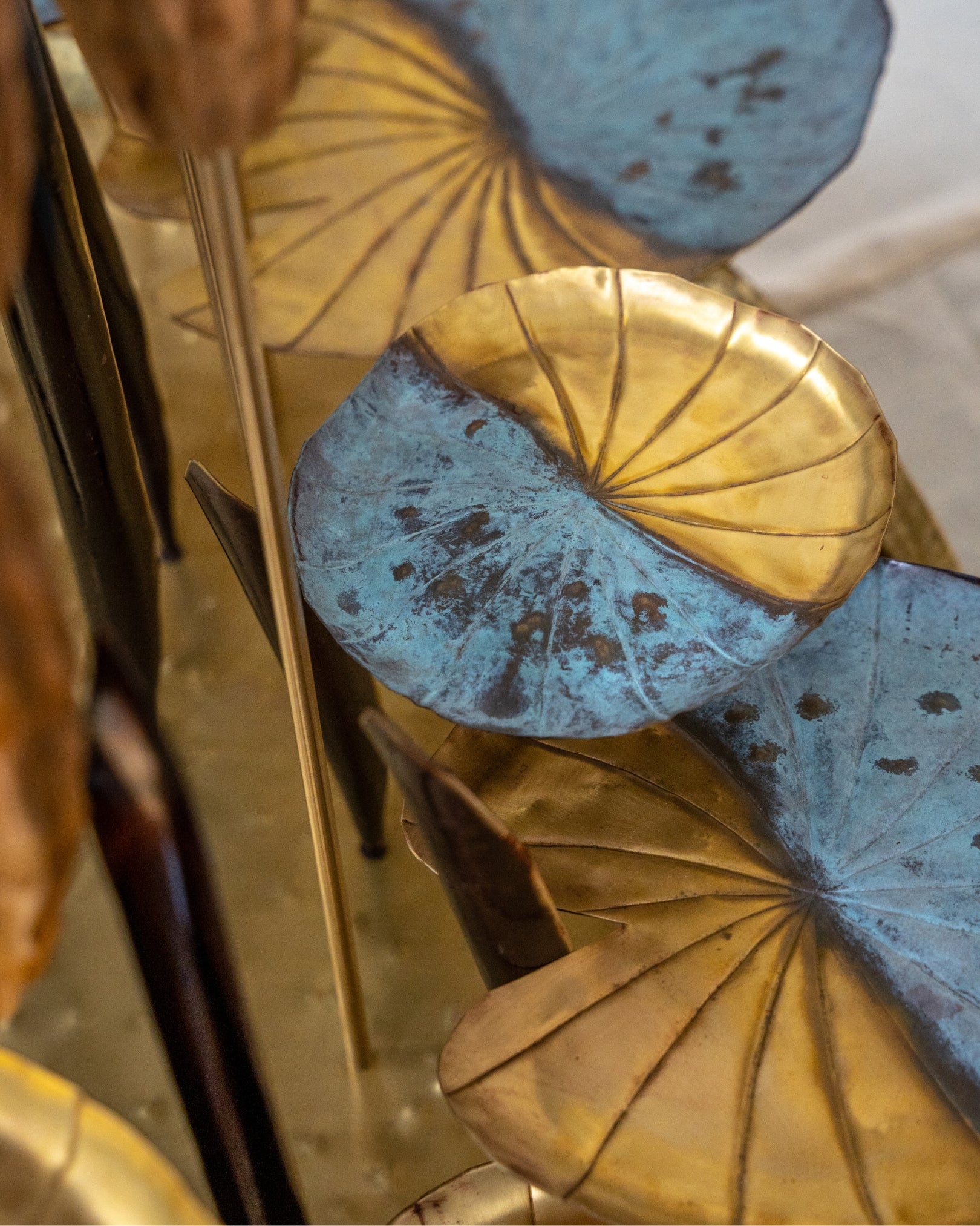 This sculpture draws inspiration from the stillness of a lotus pond. Elongated stems rise vertically, crowned with textured seed pods and delicately curved leaves that fan outward like ripples on water.