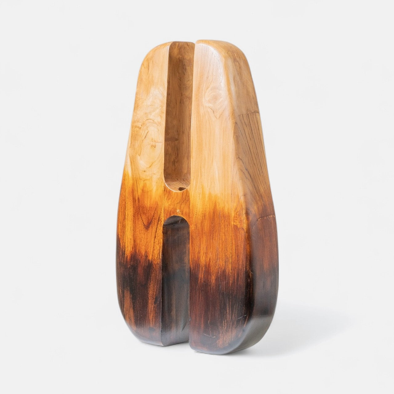This sculptural form is carved from solid teak wood. Defined by its symmetrical vertical split and softly tapered edges, it conveys structural precision.