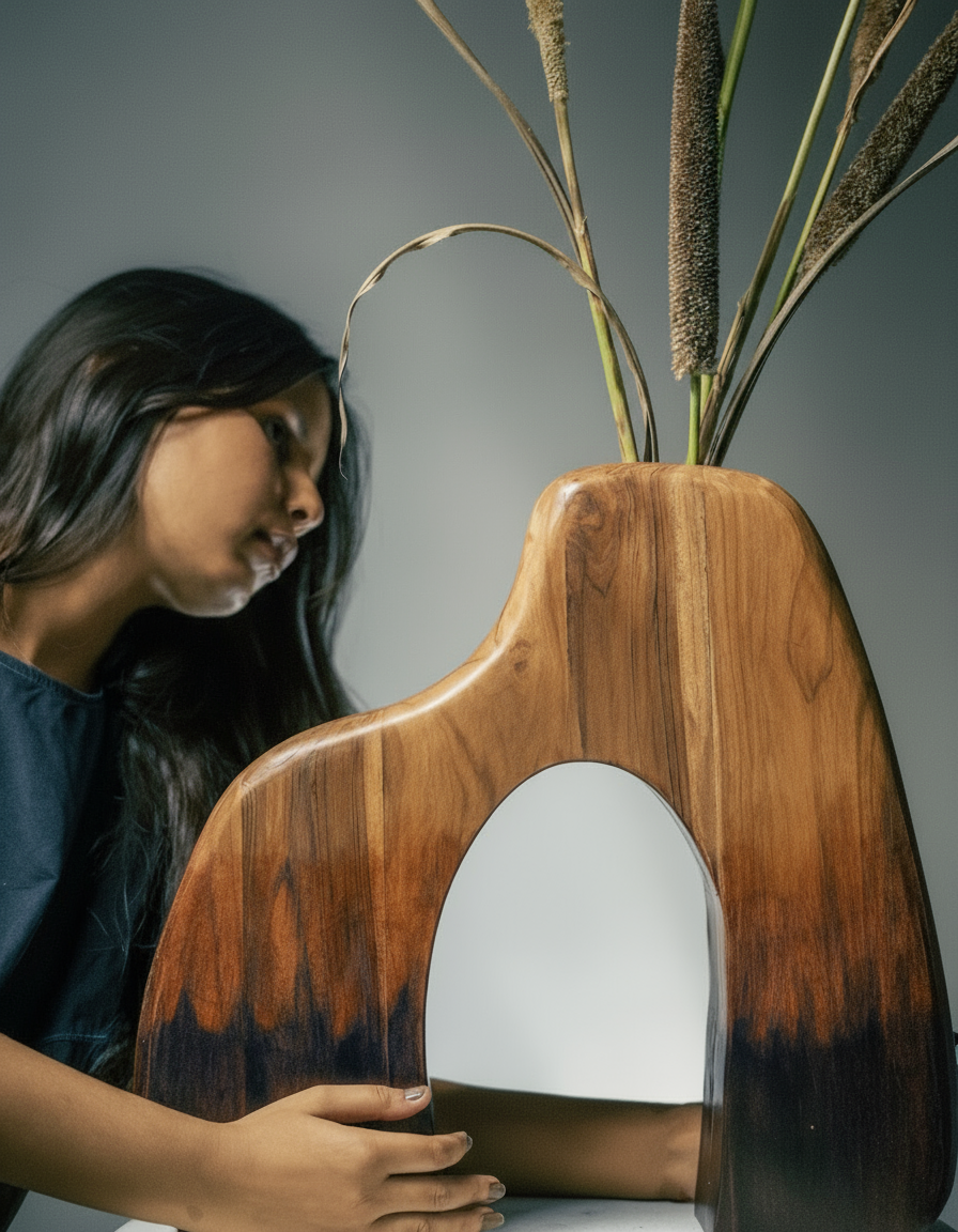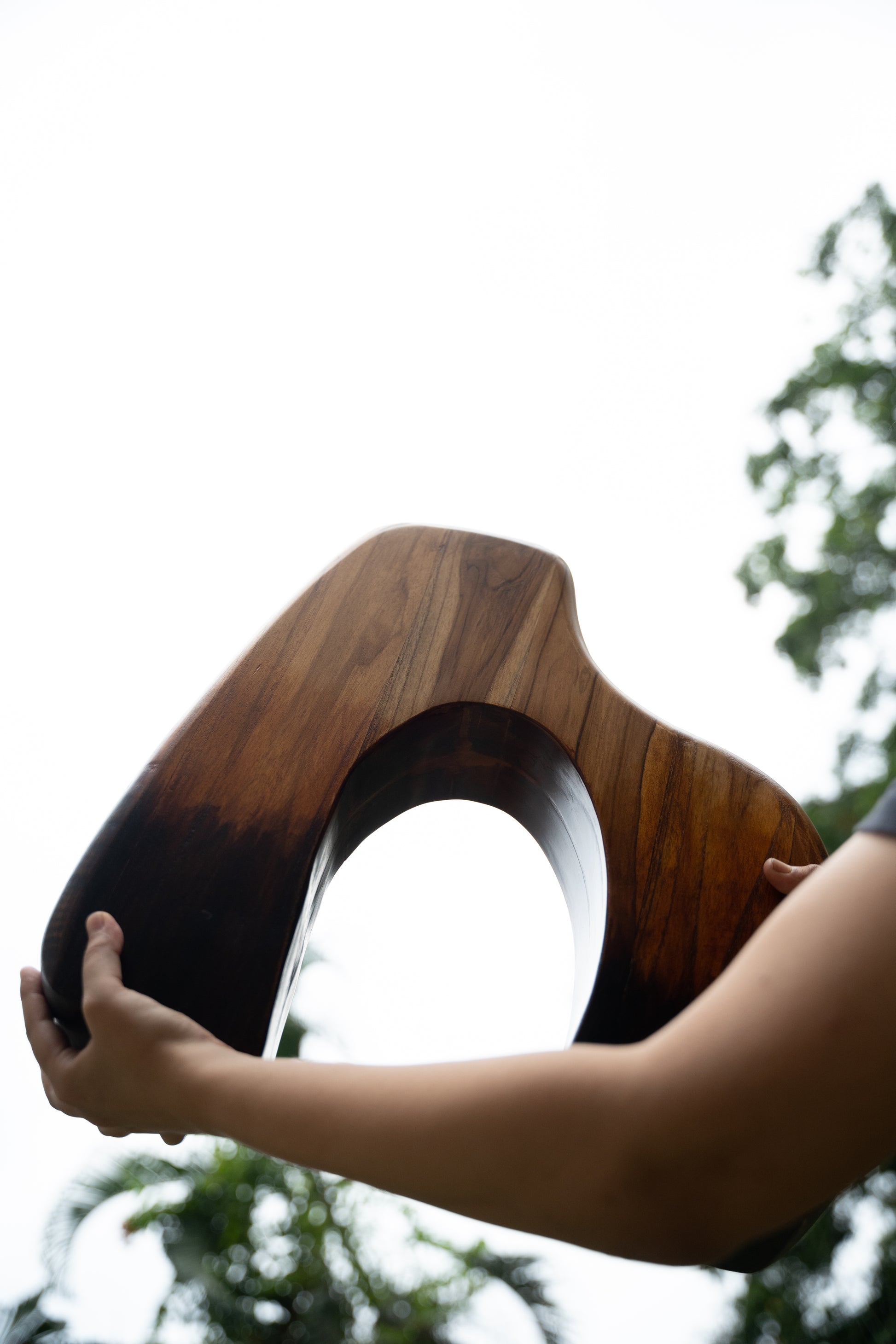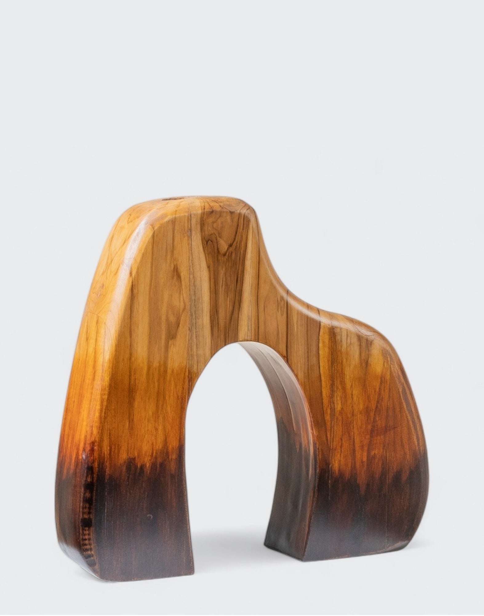 This sculptural piece is crafted from solid teak wood with a smooth, hand-finished surface that emphasizes the grain’s natural movement. A brushed brass insert is embedded within the central void, introducing a subtle material contrast.