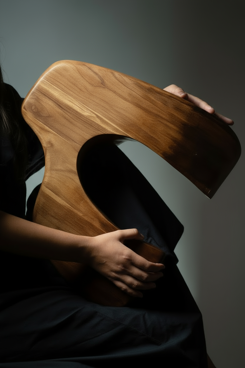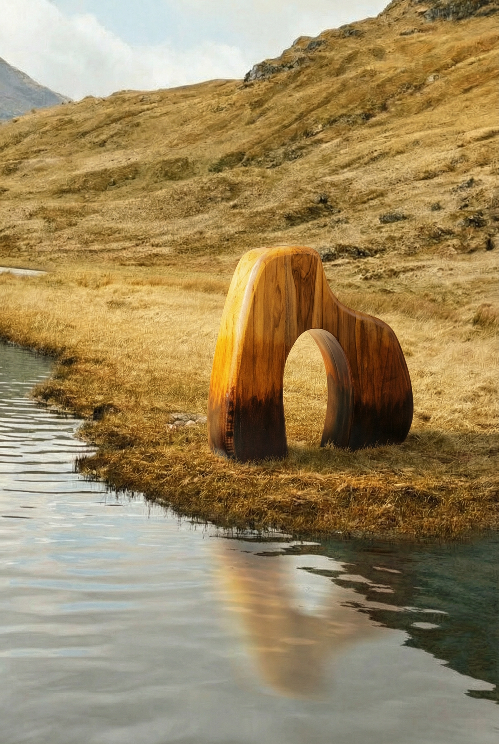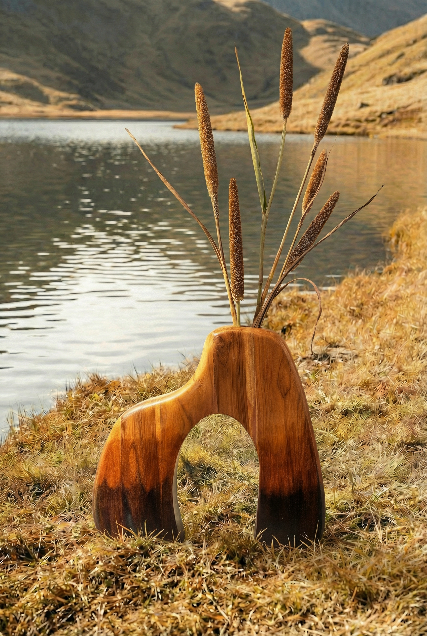 This sculptural piece is crafted from solid teak wood with a smooth, hand-finished surface that emphasizes the grain’s natural movement. A brushed brass insert is embedded within the central void, introducing a subtle material contrast.