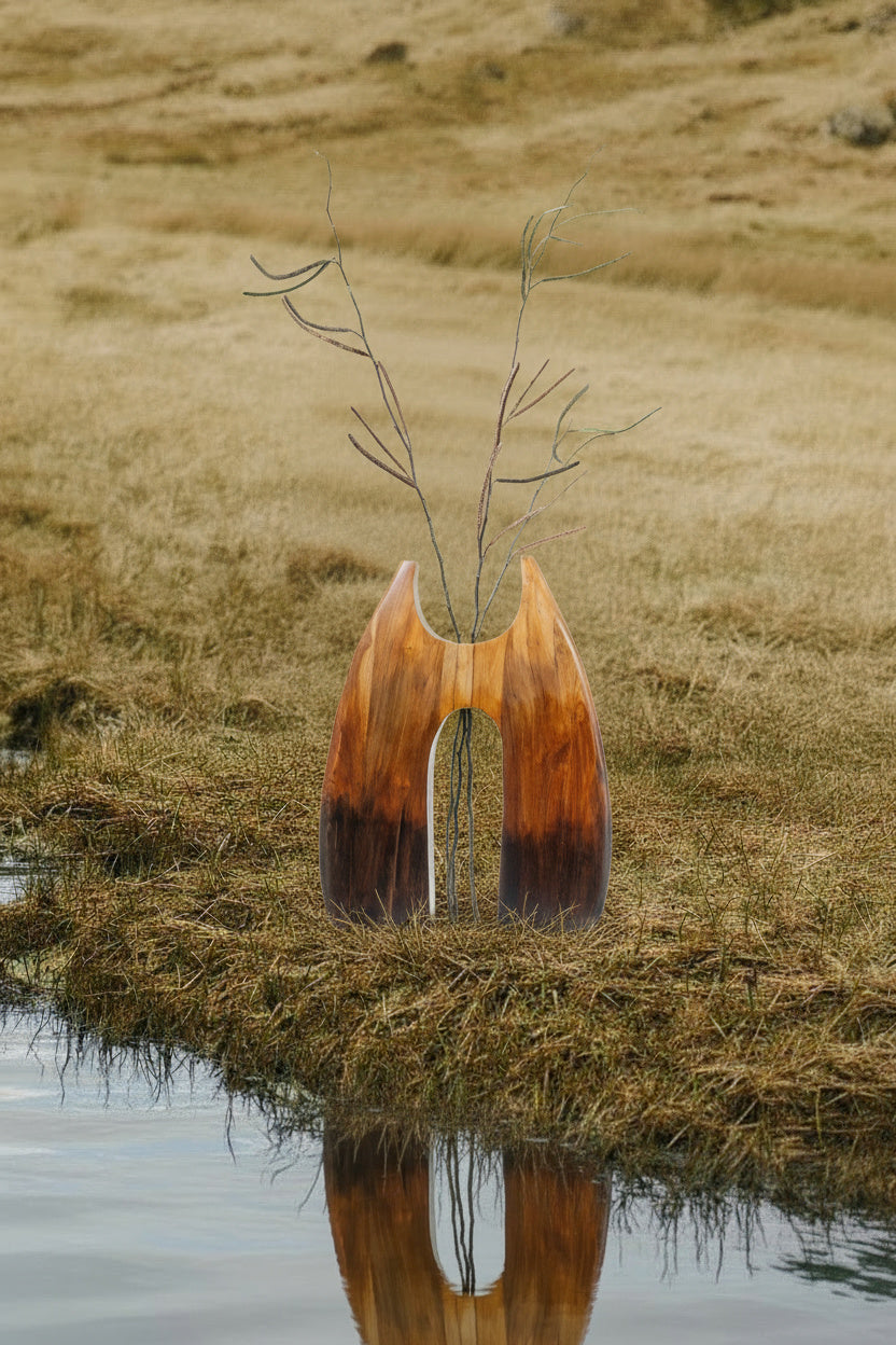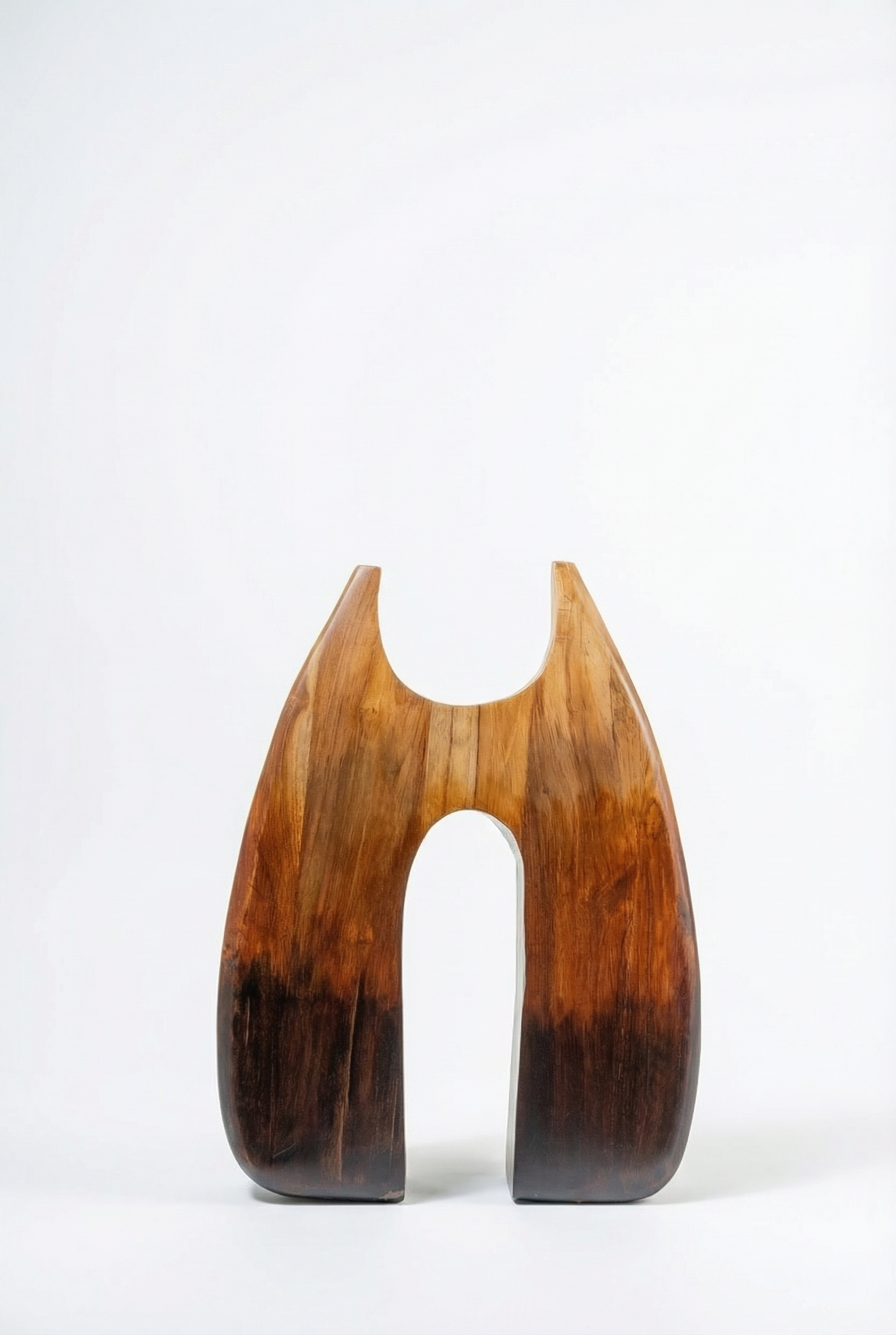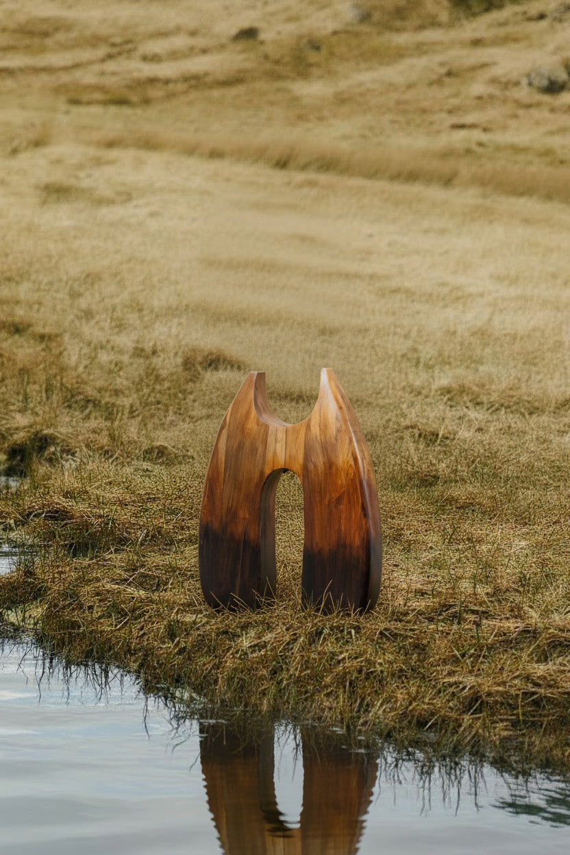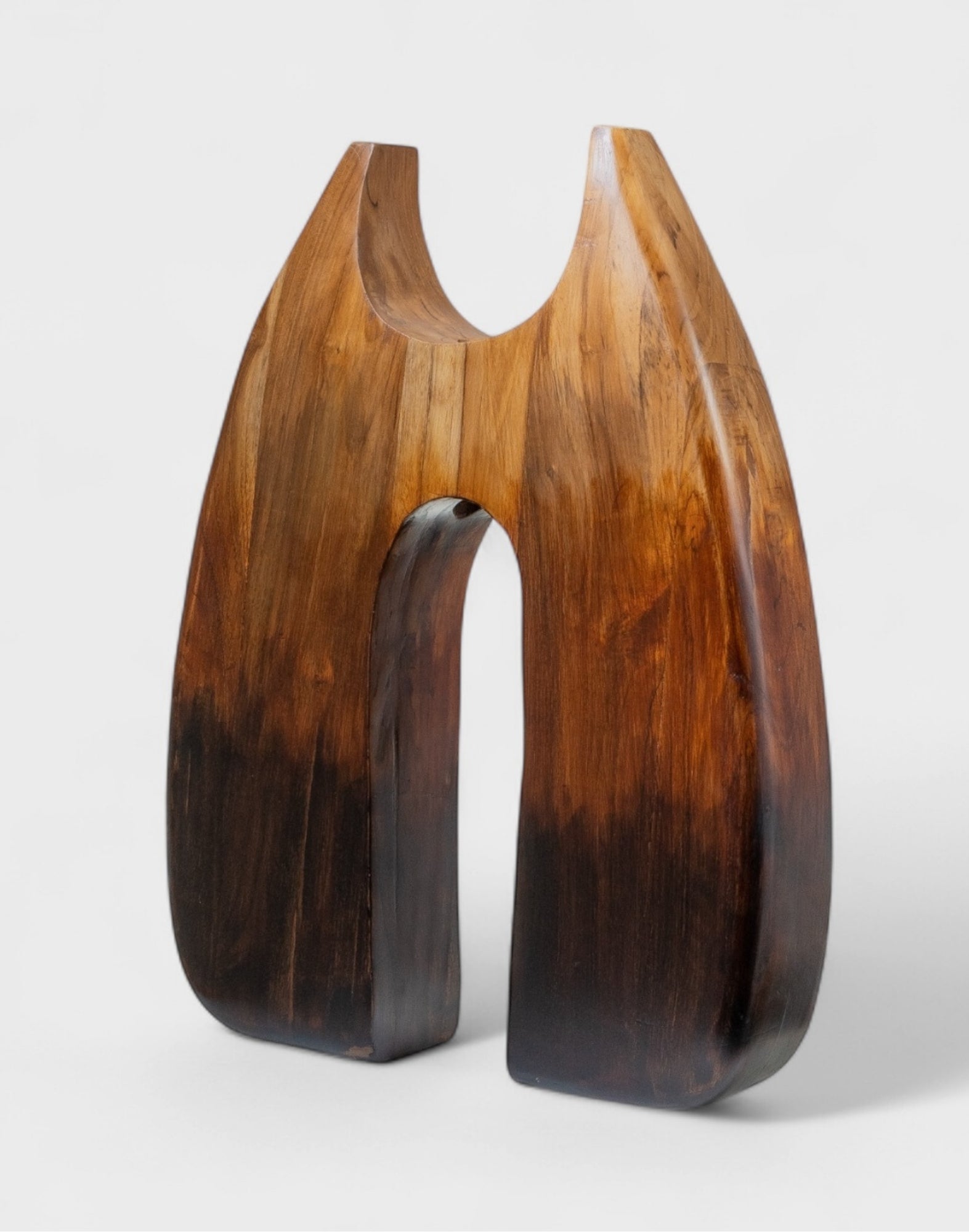 Crafted from solid teak wood, this sculptural form merges organic curves with contrast. The wide, tapering silhouette features a central opening that invites light through its core, framing space as much as mass.