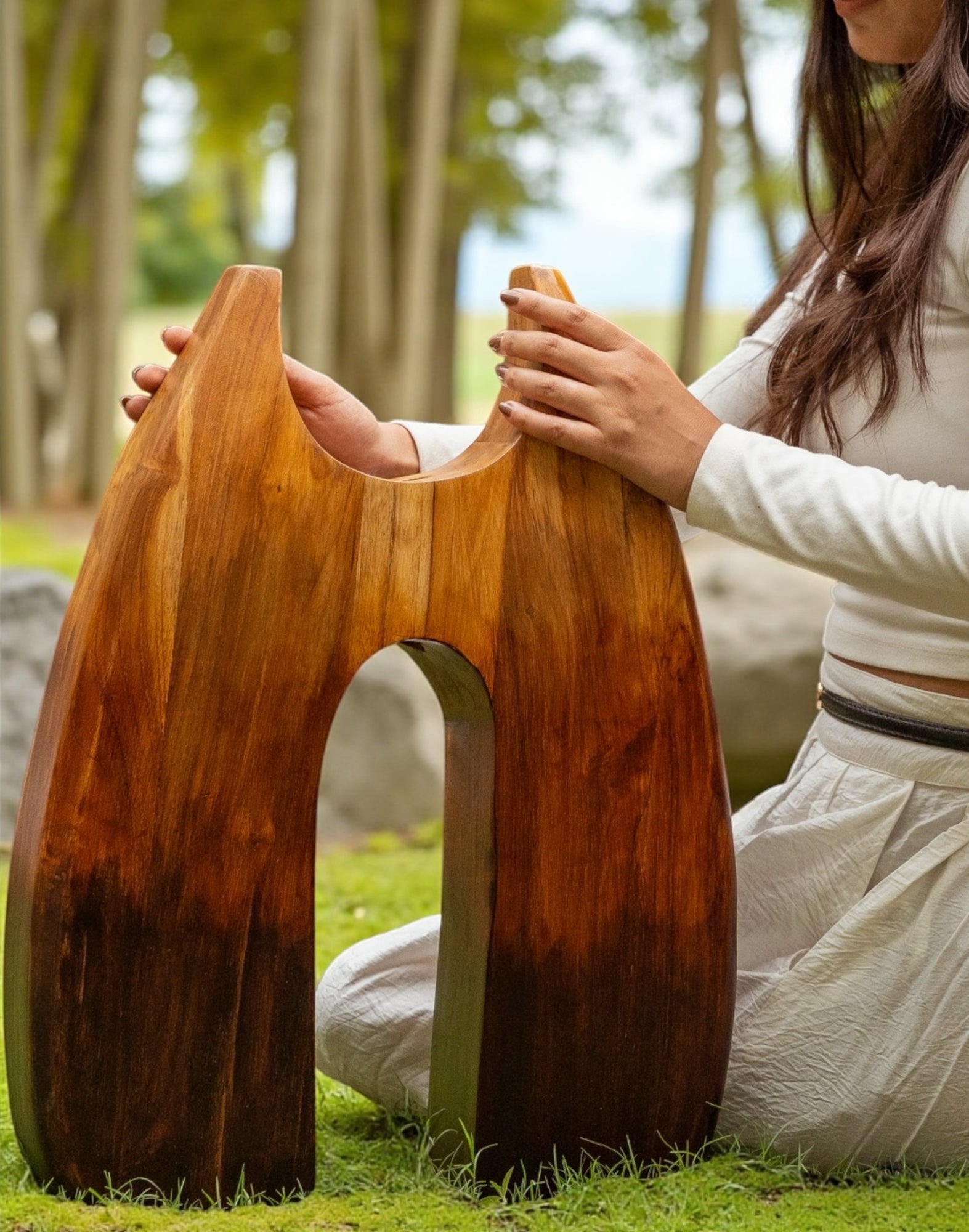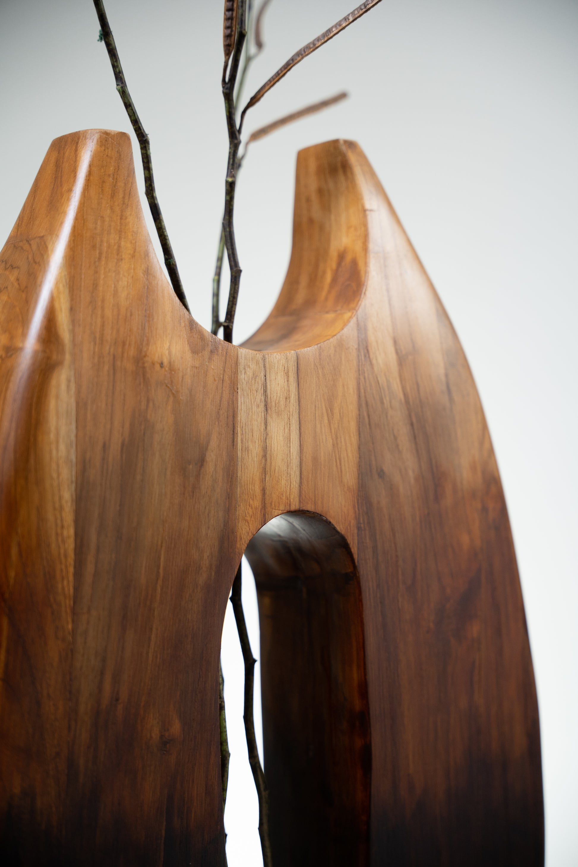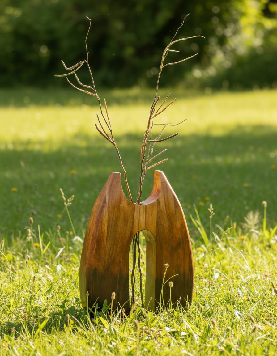 Crafted from solid teak wood, this sculptural form merges organic curves with contrast. The wide, tapering silhouette features a central opening that invites light through its core, framing space as much as mass.