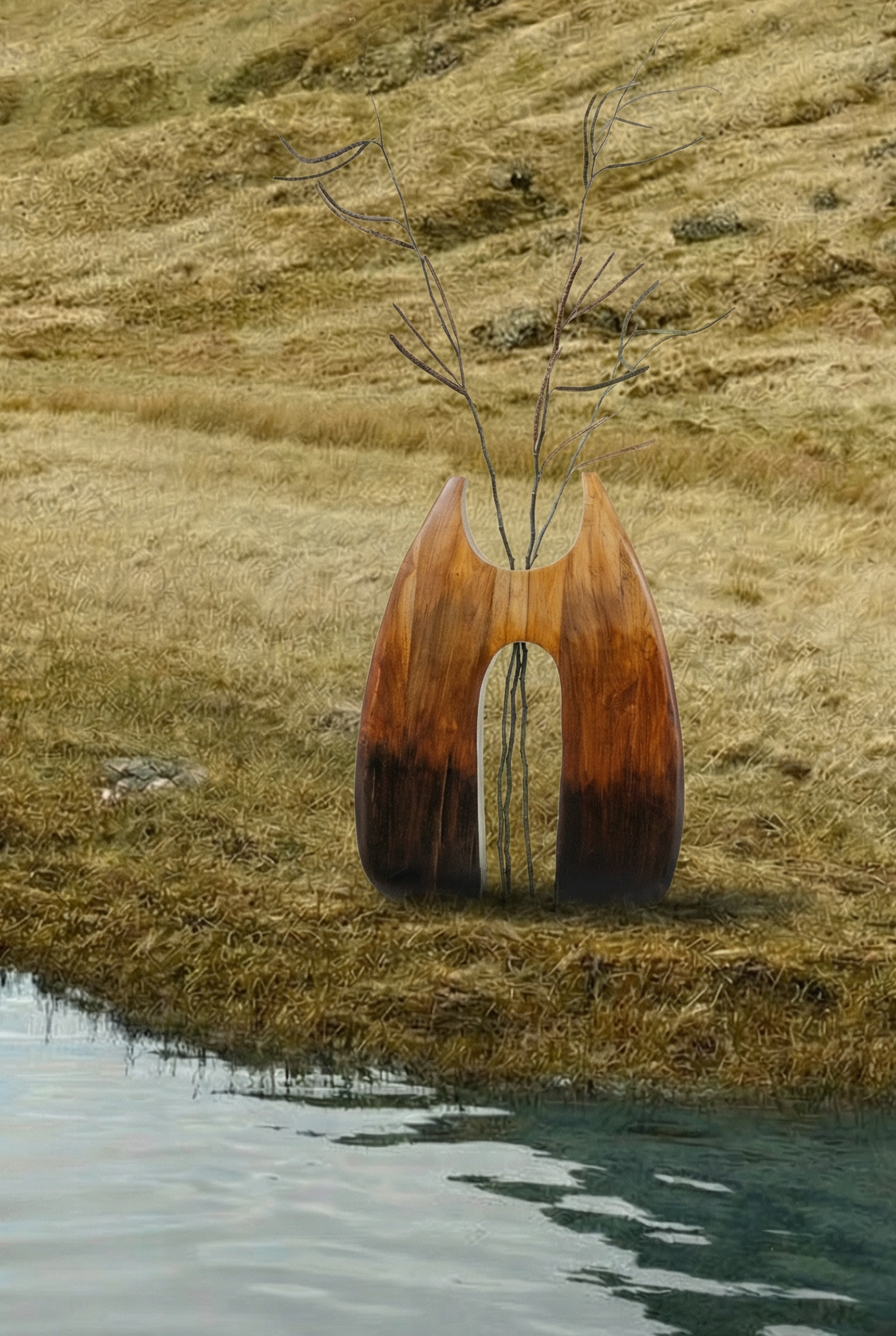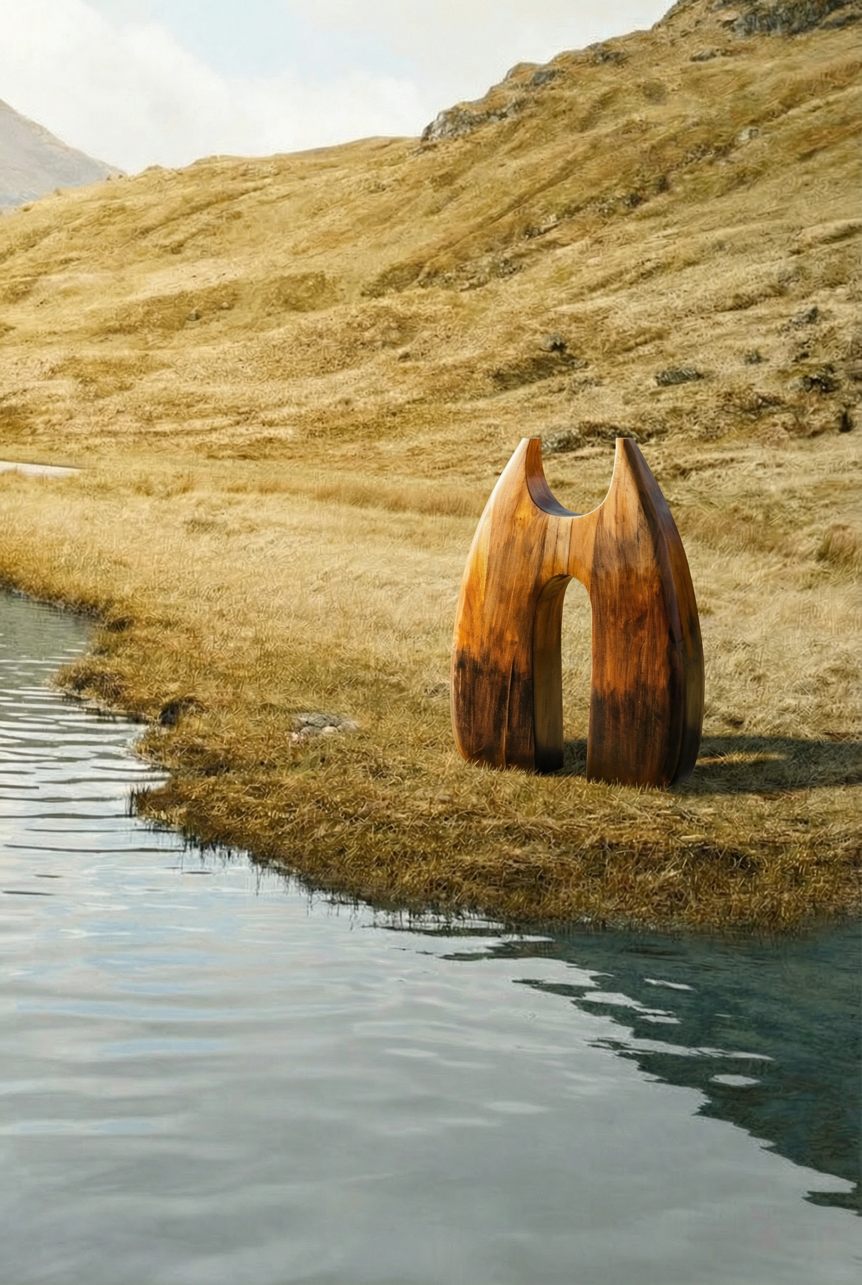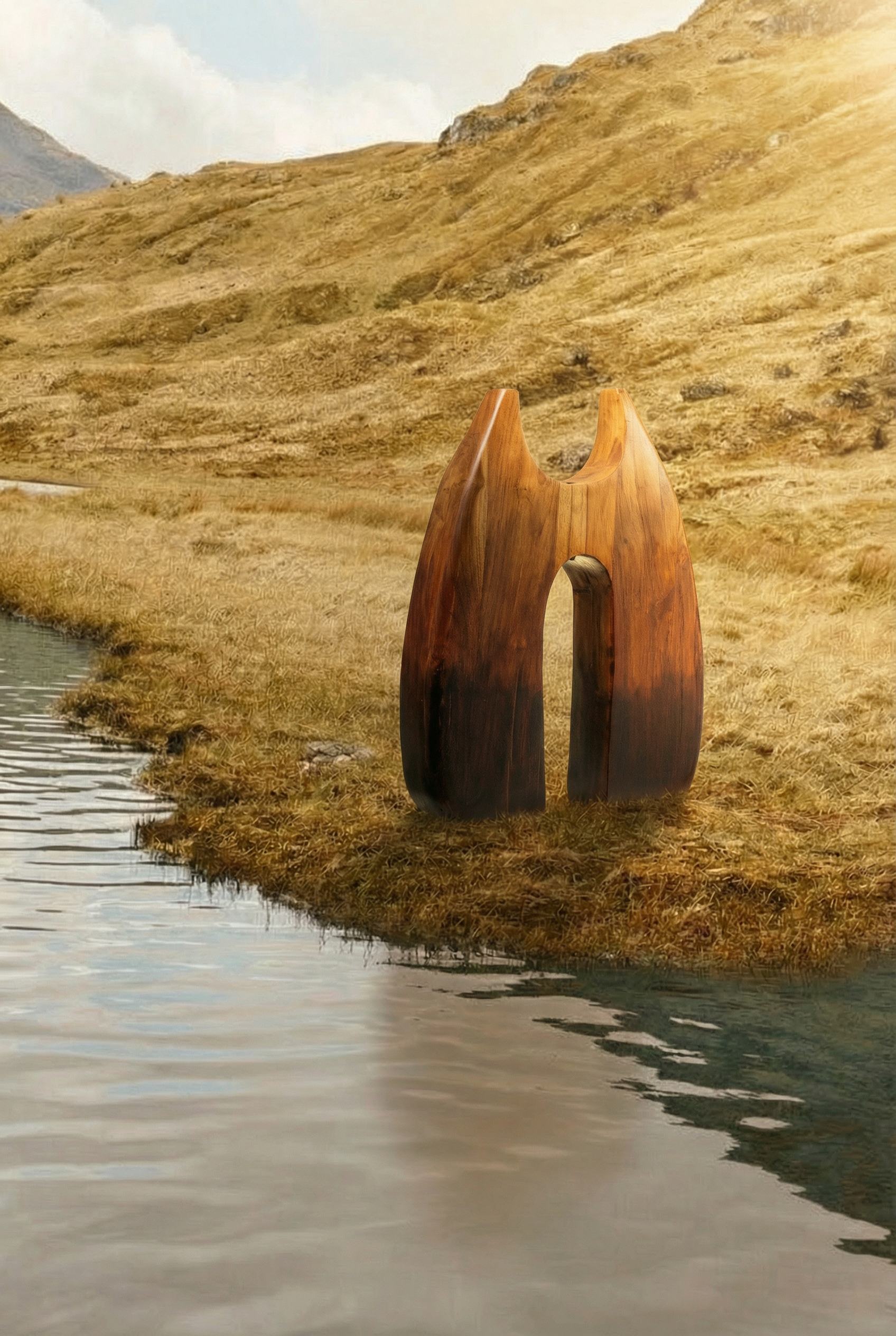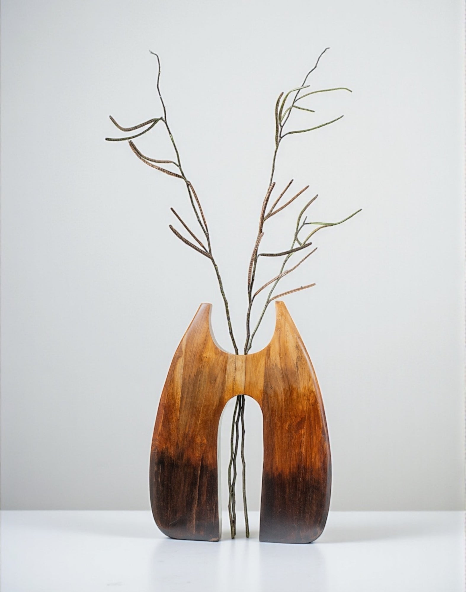 Crafted from solid teak wood, this sculptural form merges organic curves with contrast. The wide, tapering silhouette features a central opening that invites light through its core, framing space as much as mass.