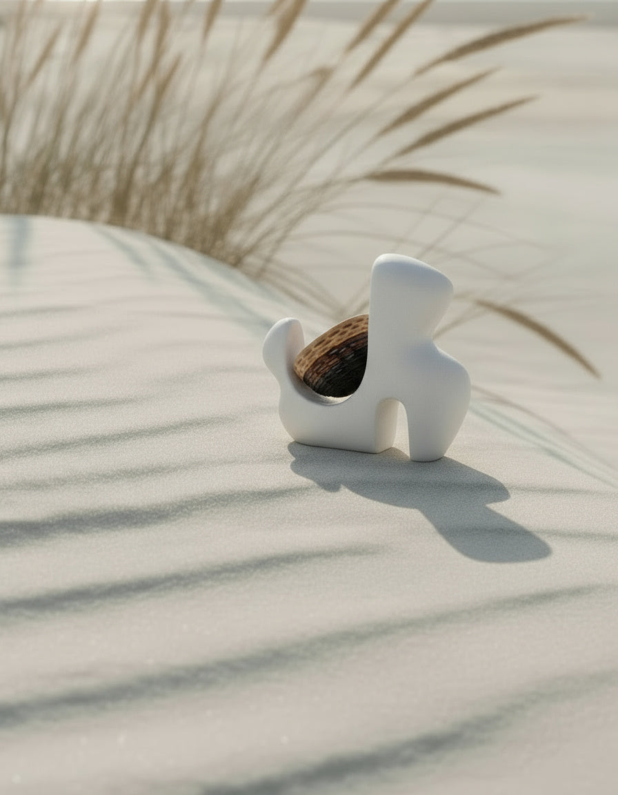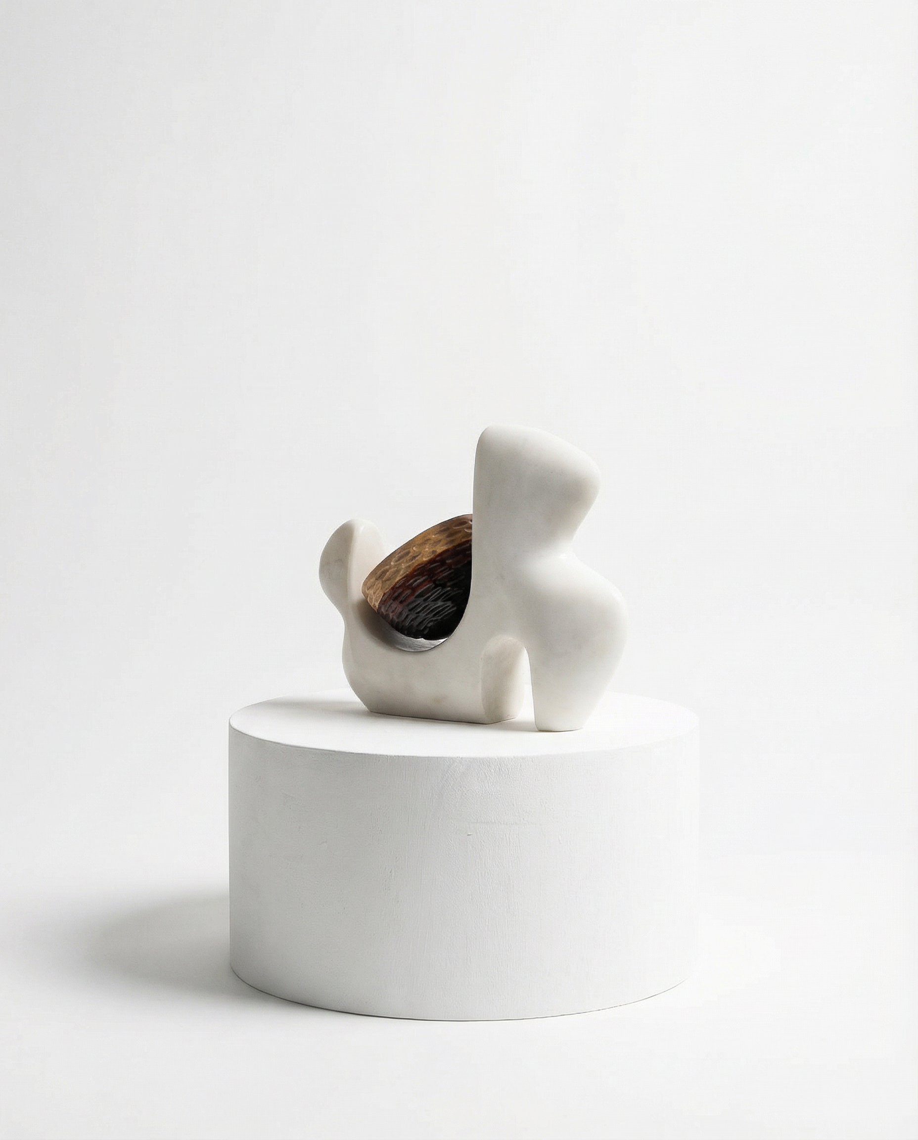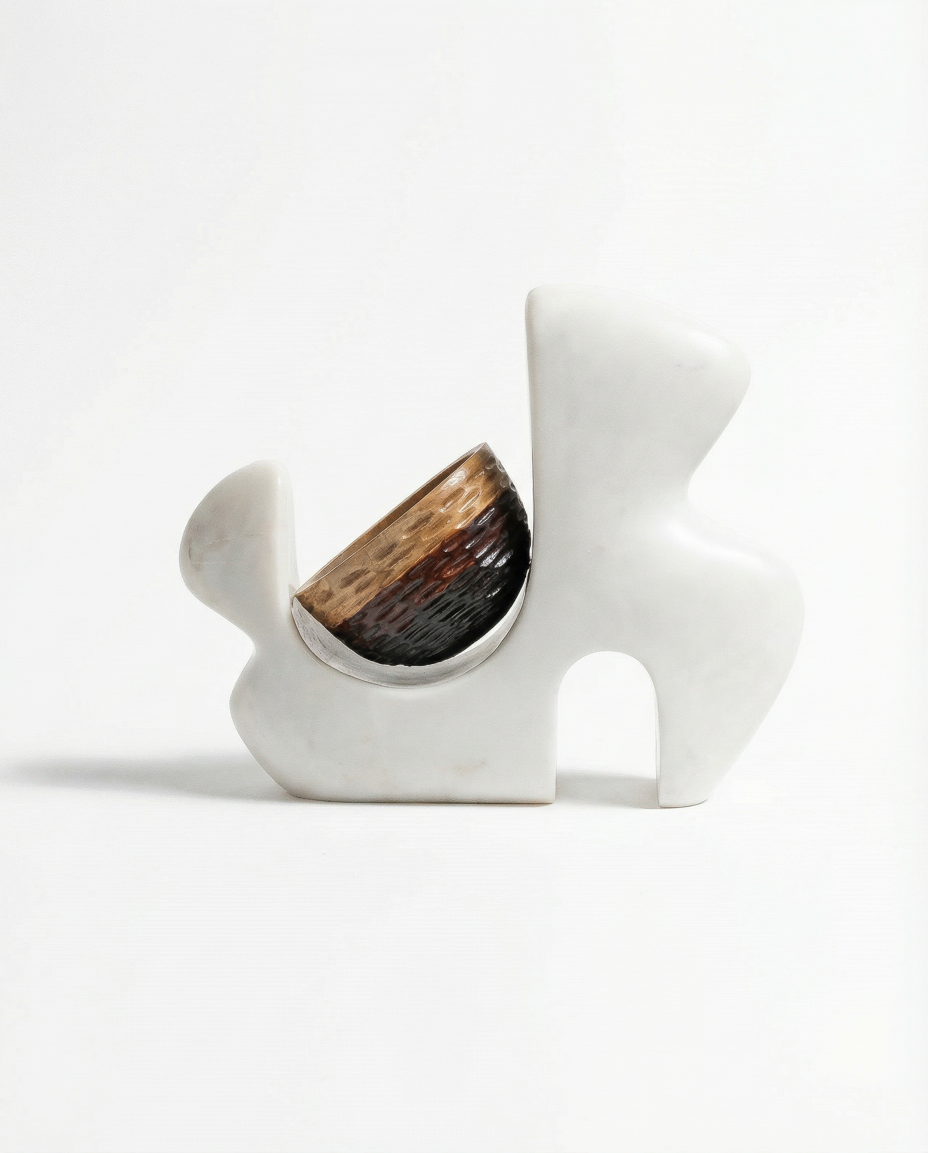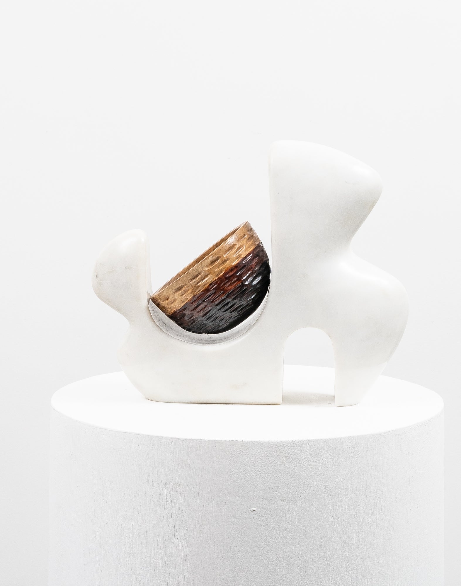 This sculptural vessel combines a carved marble base with a hand-shaped wooden bowl. The hollowed stone form suggests an abstracted hand silhouette, holding and protecting the vessel as a gesture of nurturing nature.