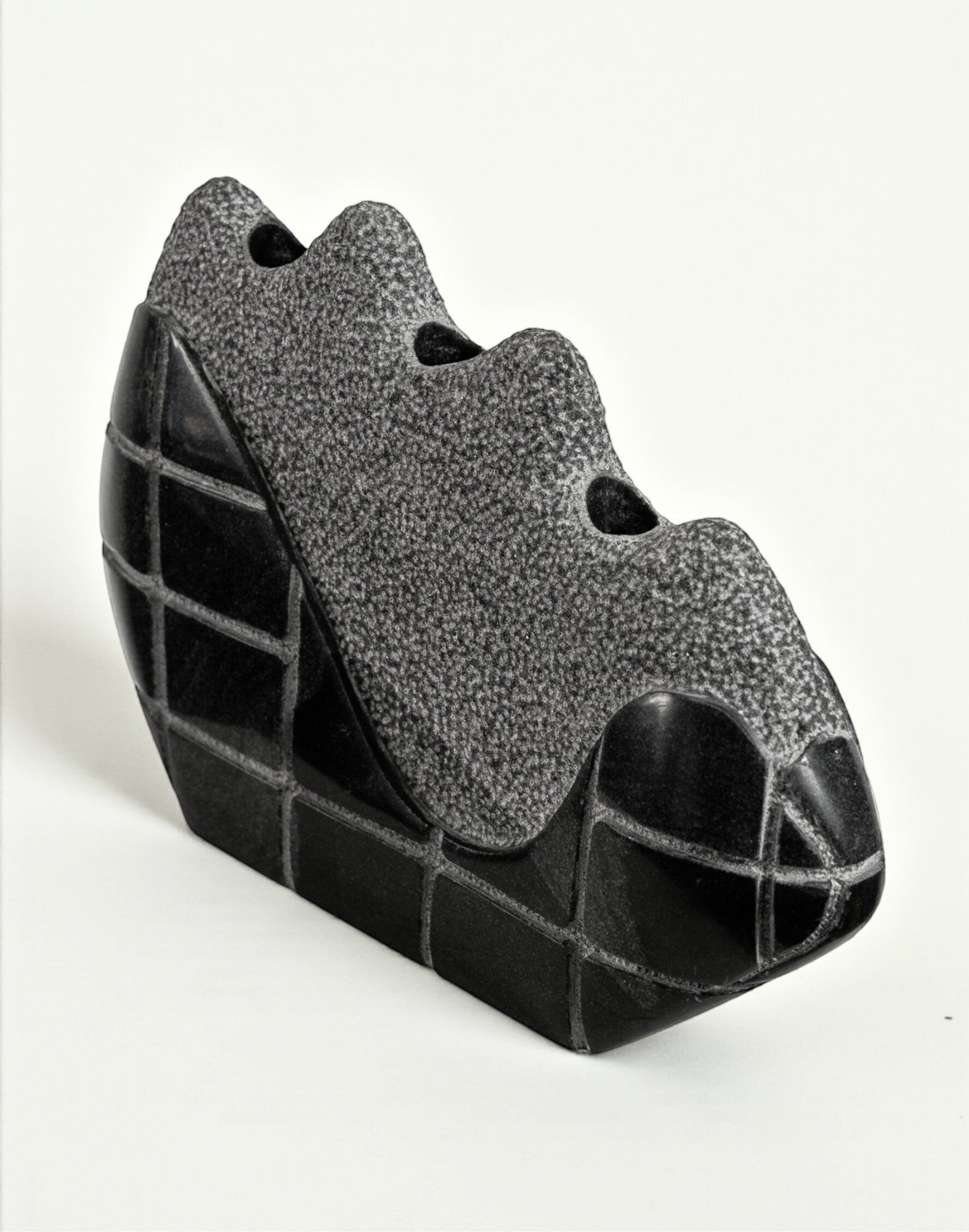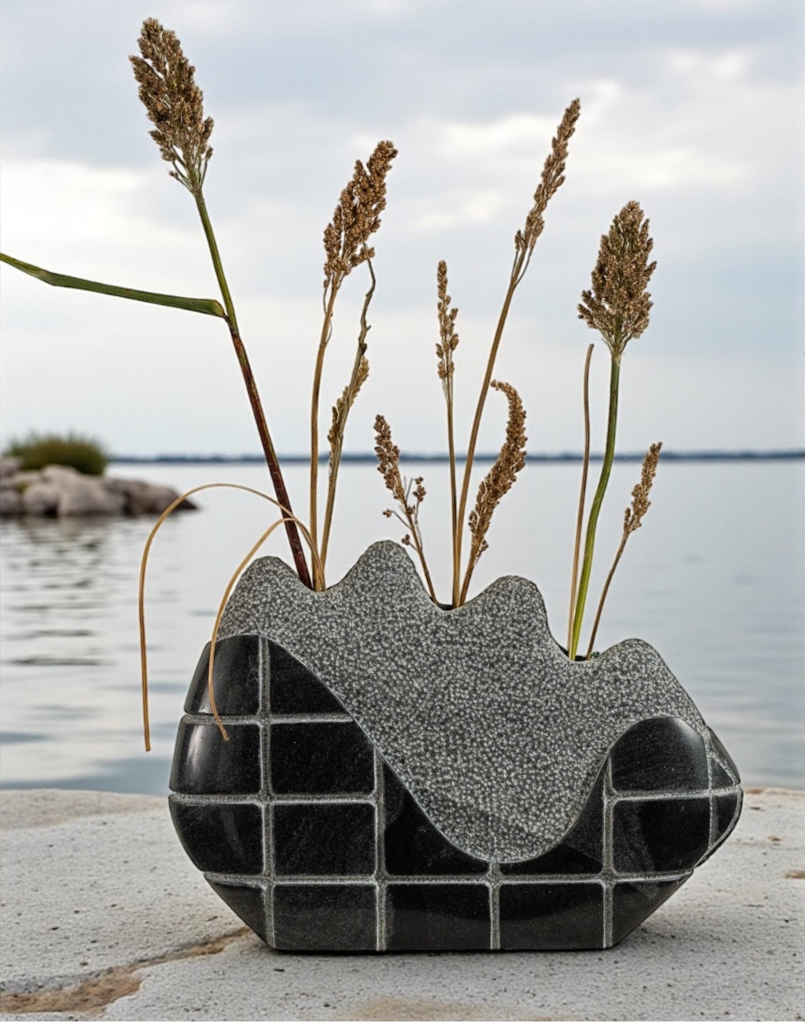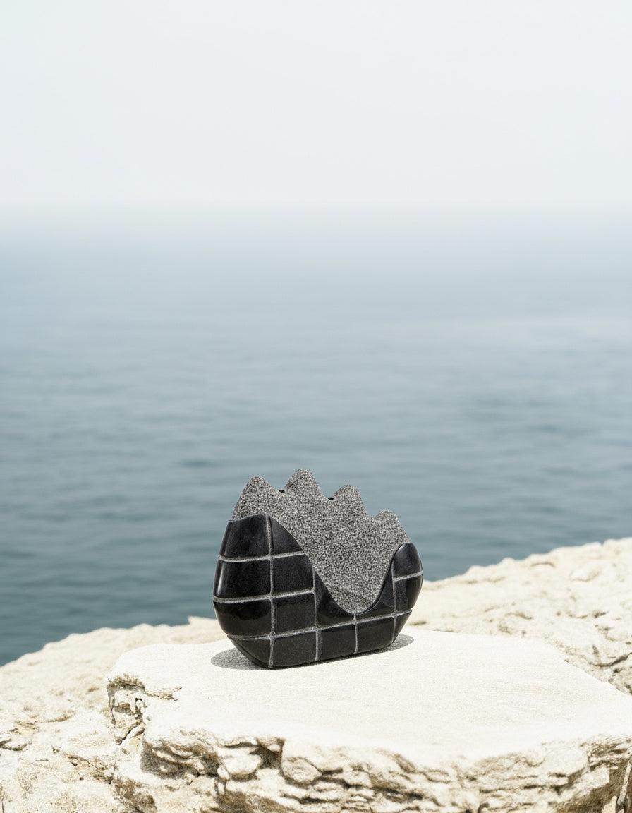The polished black stone creates a structured, gridded base, while a textured stone surface flows over it like a natural formation. The design explores the tension between structure and spontaneity, where geometric precision meets organic fluidity.