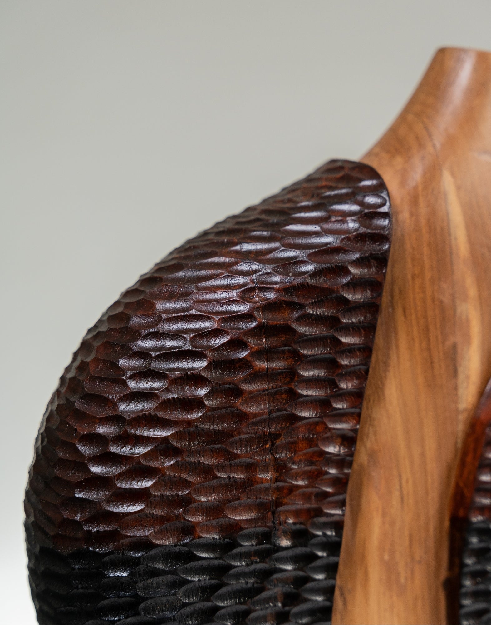 Carved from teak wood, this sculptural piece juxtaposes a smooth, linear surface with a highly textured, faceted exterior. The contrast between the refined grain and the intricate hand-carved pattern emphasizes both material richness and artisanal precision.