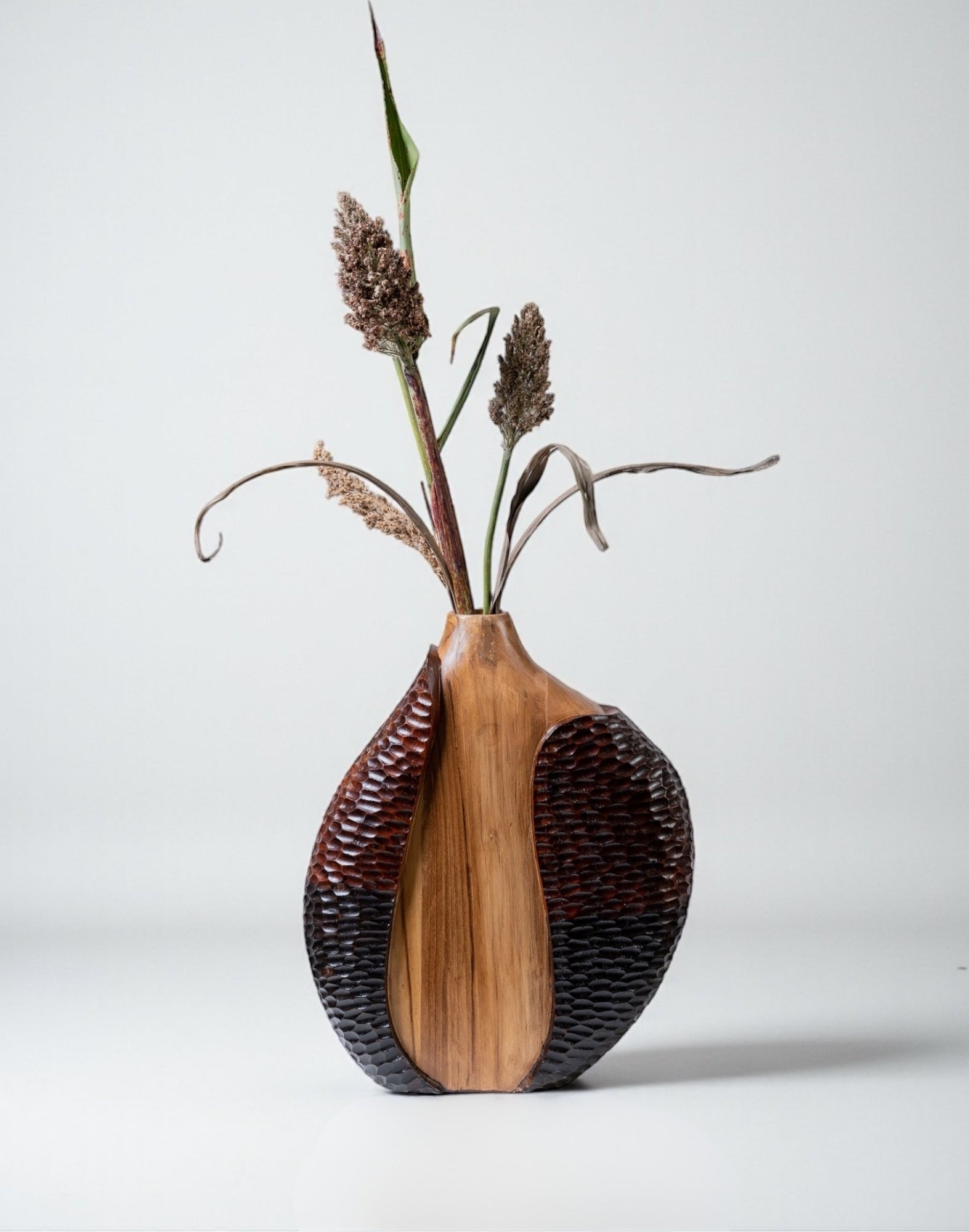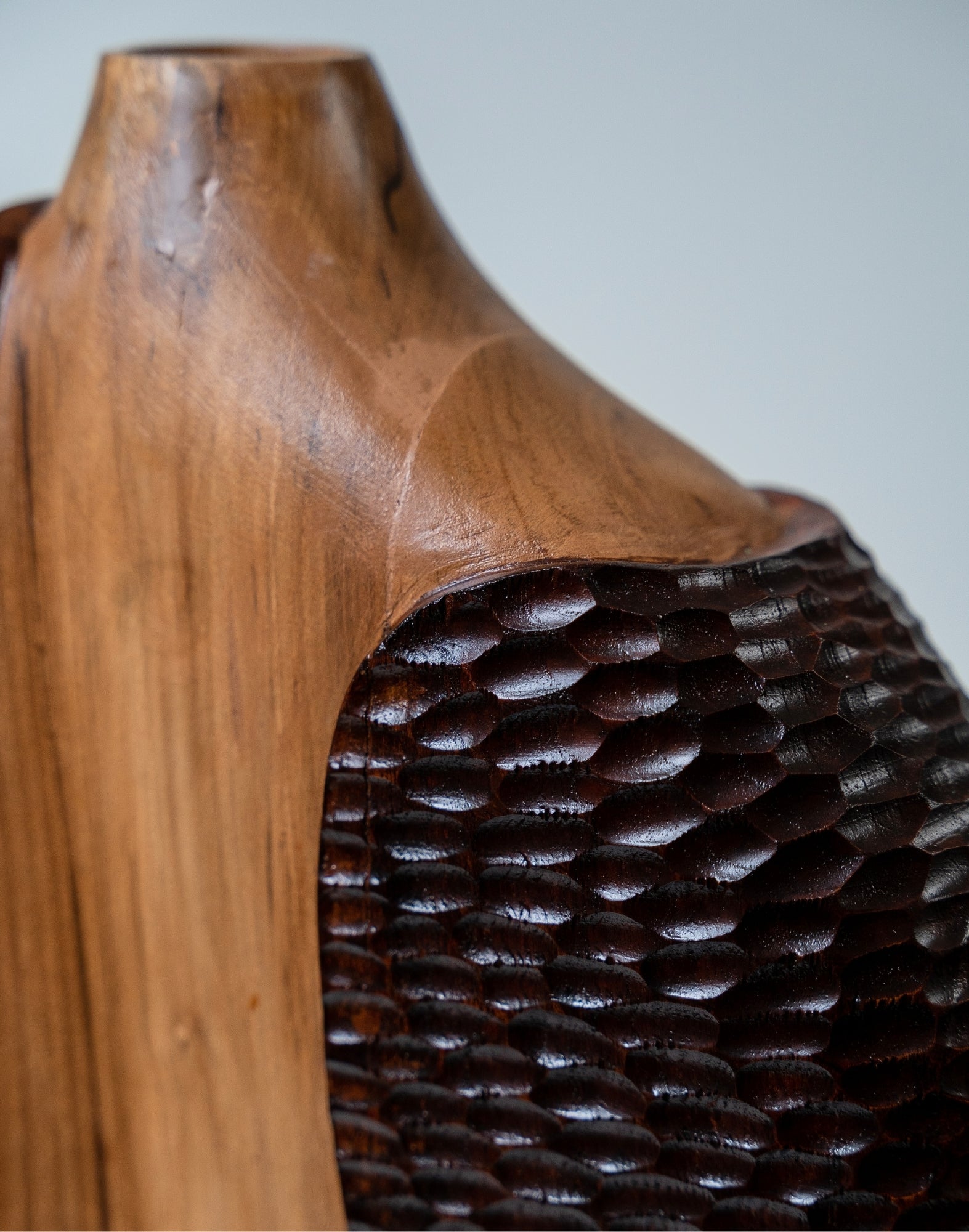 Hand-carved from teak wood, this piece is defined by its tall, tapering form that rises upward with a sense of organic fluidity. A smooth vertical plane intersects textured, carved surfaces, creating a dialogue between refinement and tactility.
