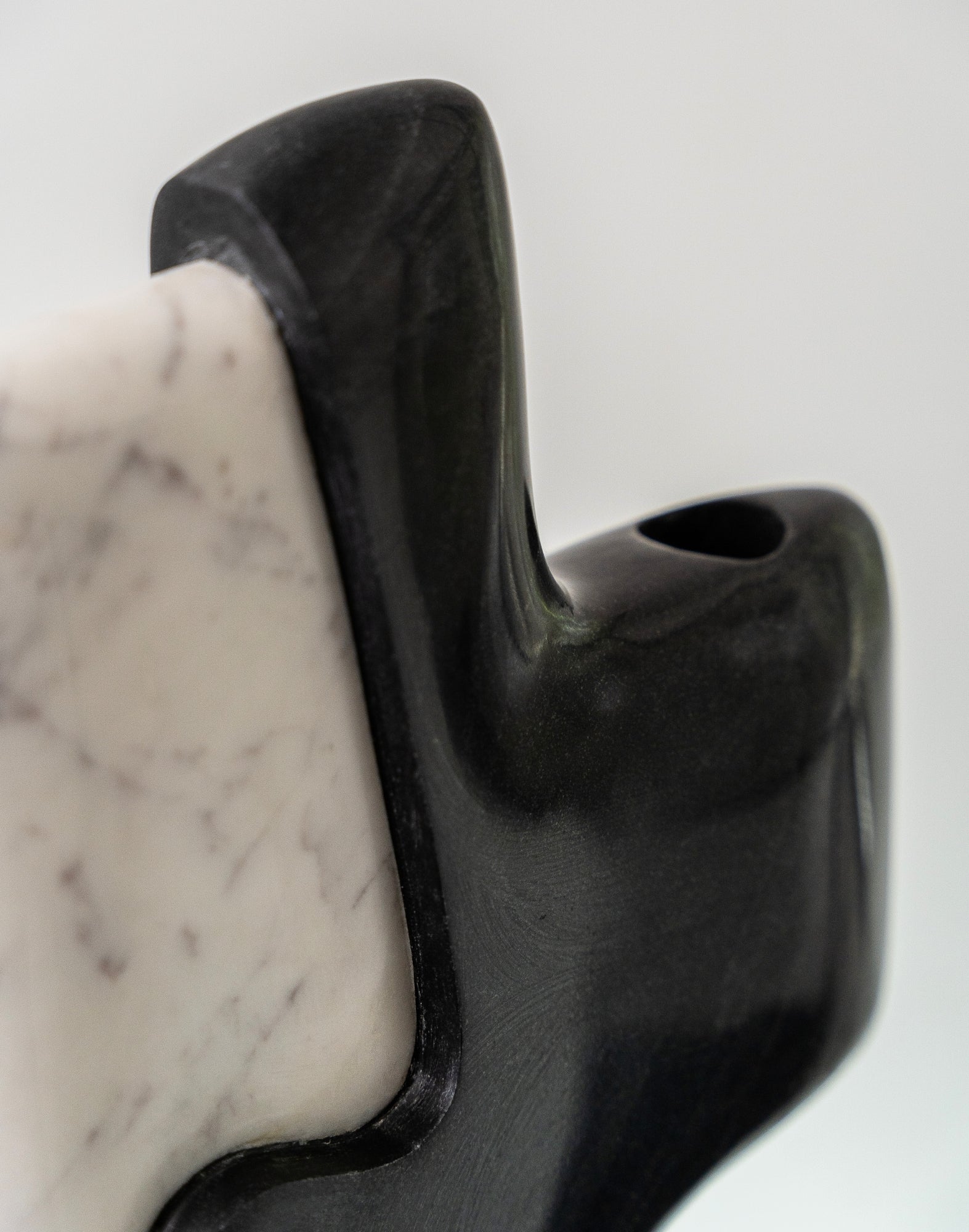 Crafted from black and white marble, this vertically sculpted piece captures a dialogue between opposites. The silhouette is defined by a clean, organic split, one side pure and linear, the other flowing with subtle curvature and material depth.