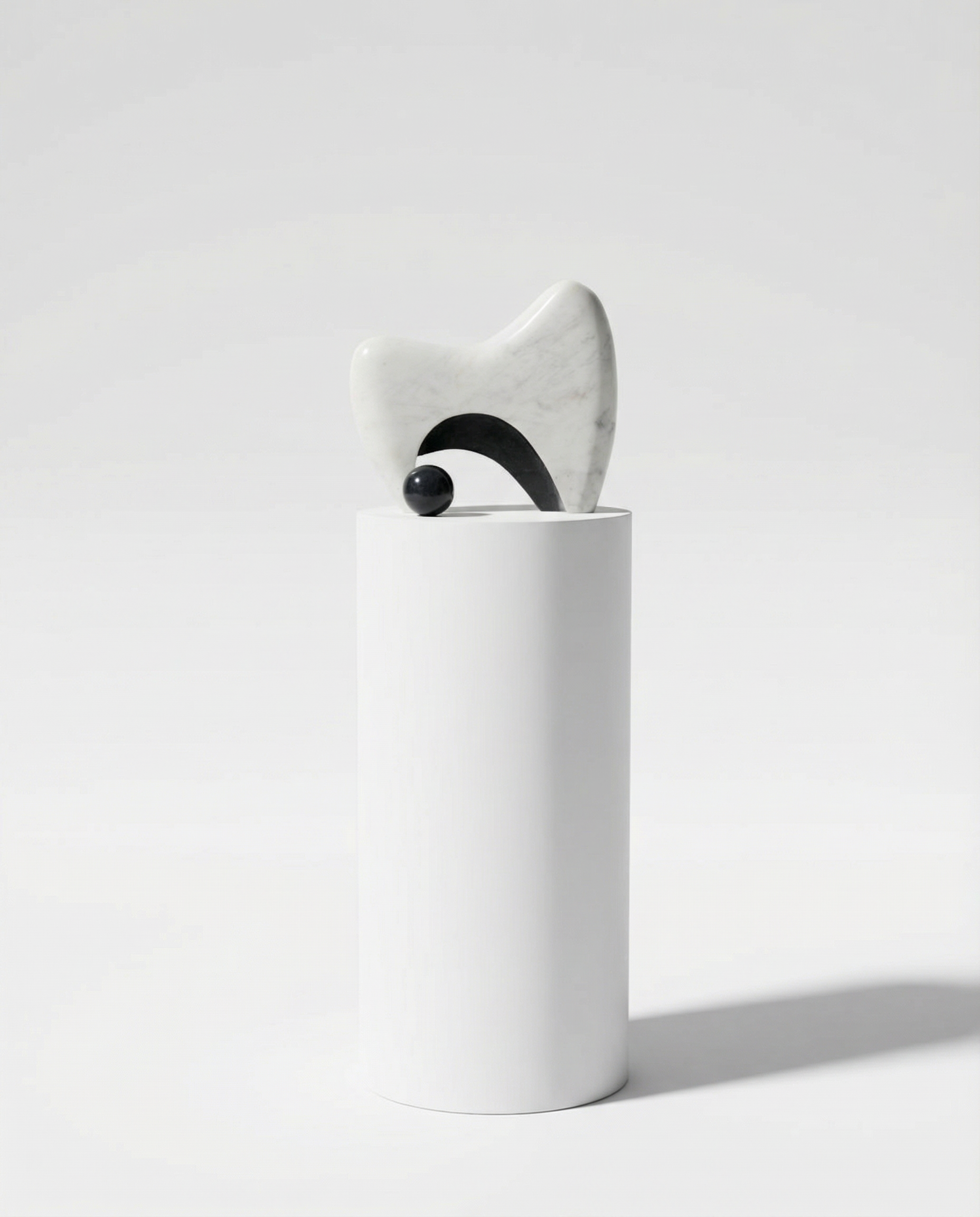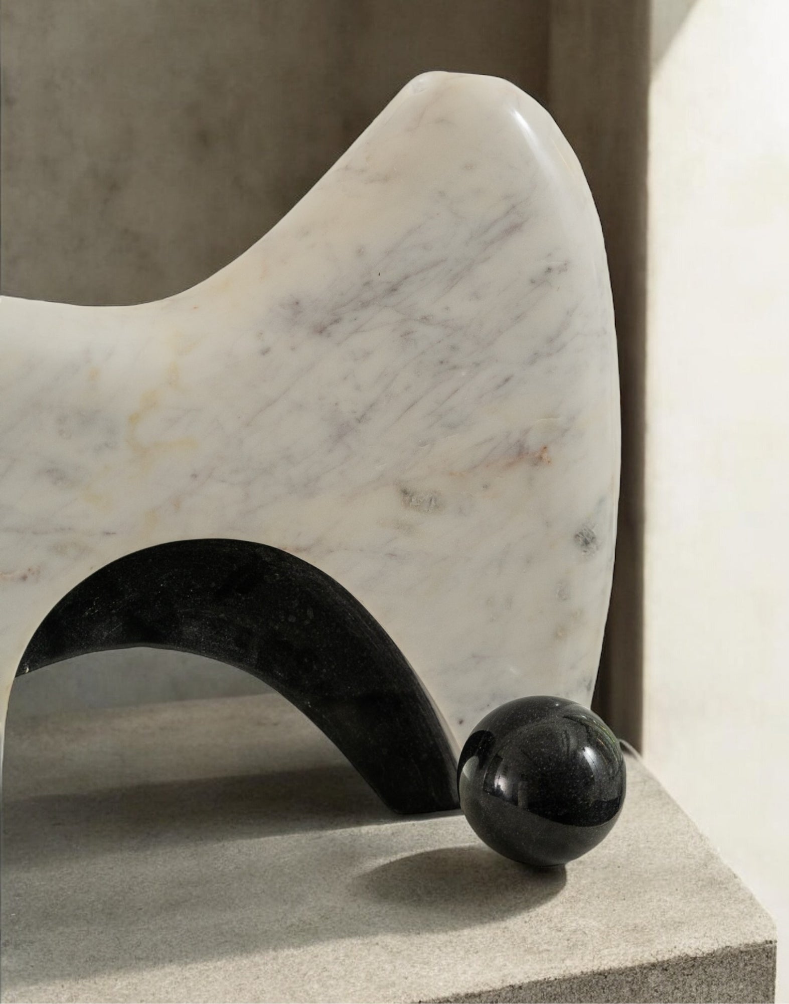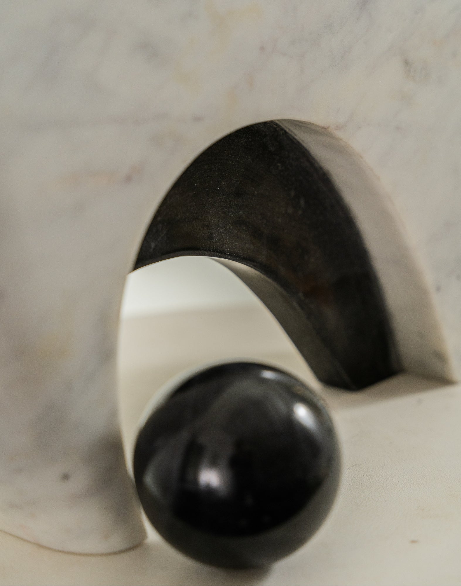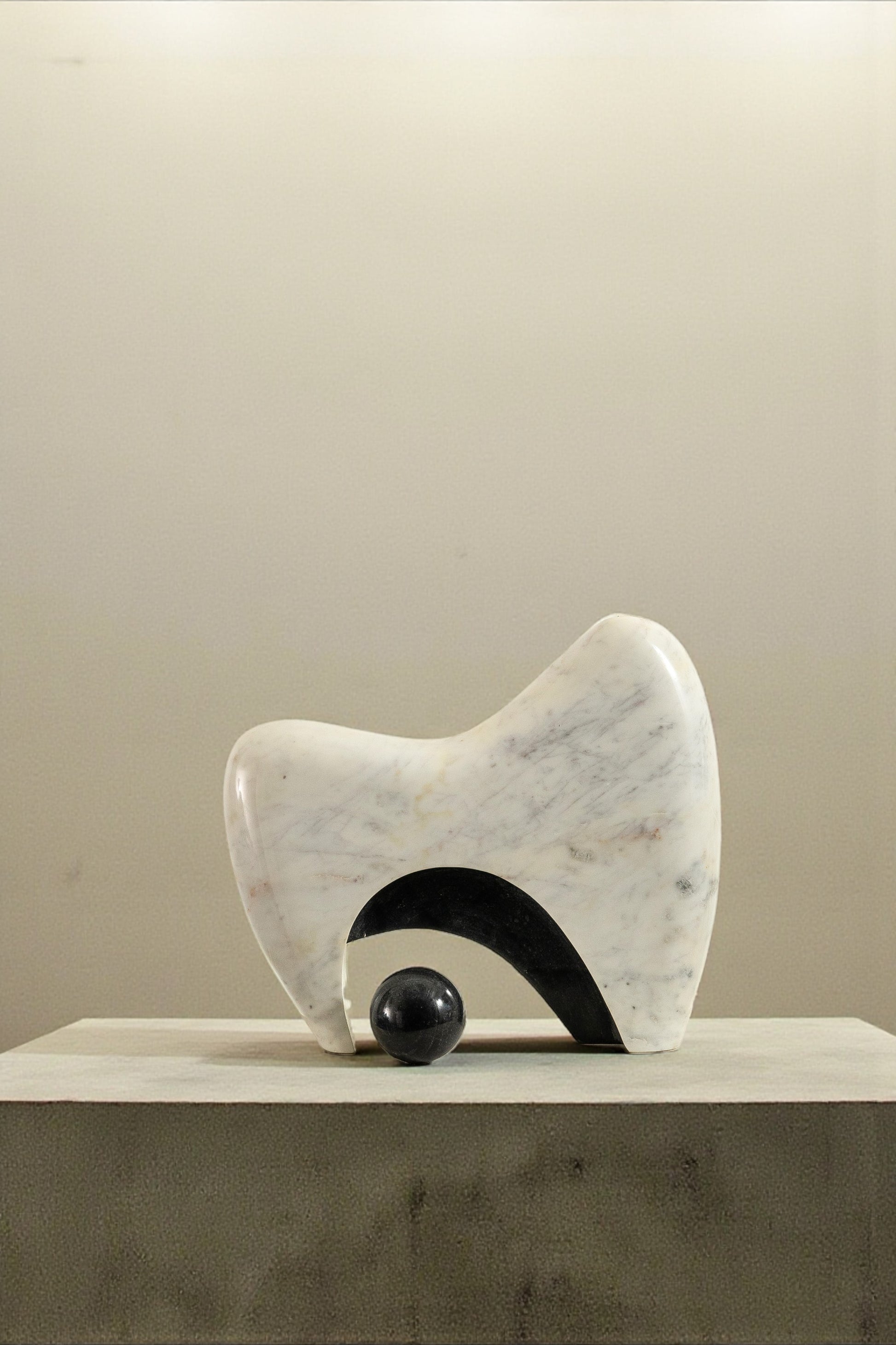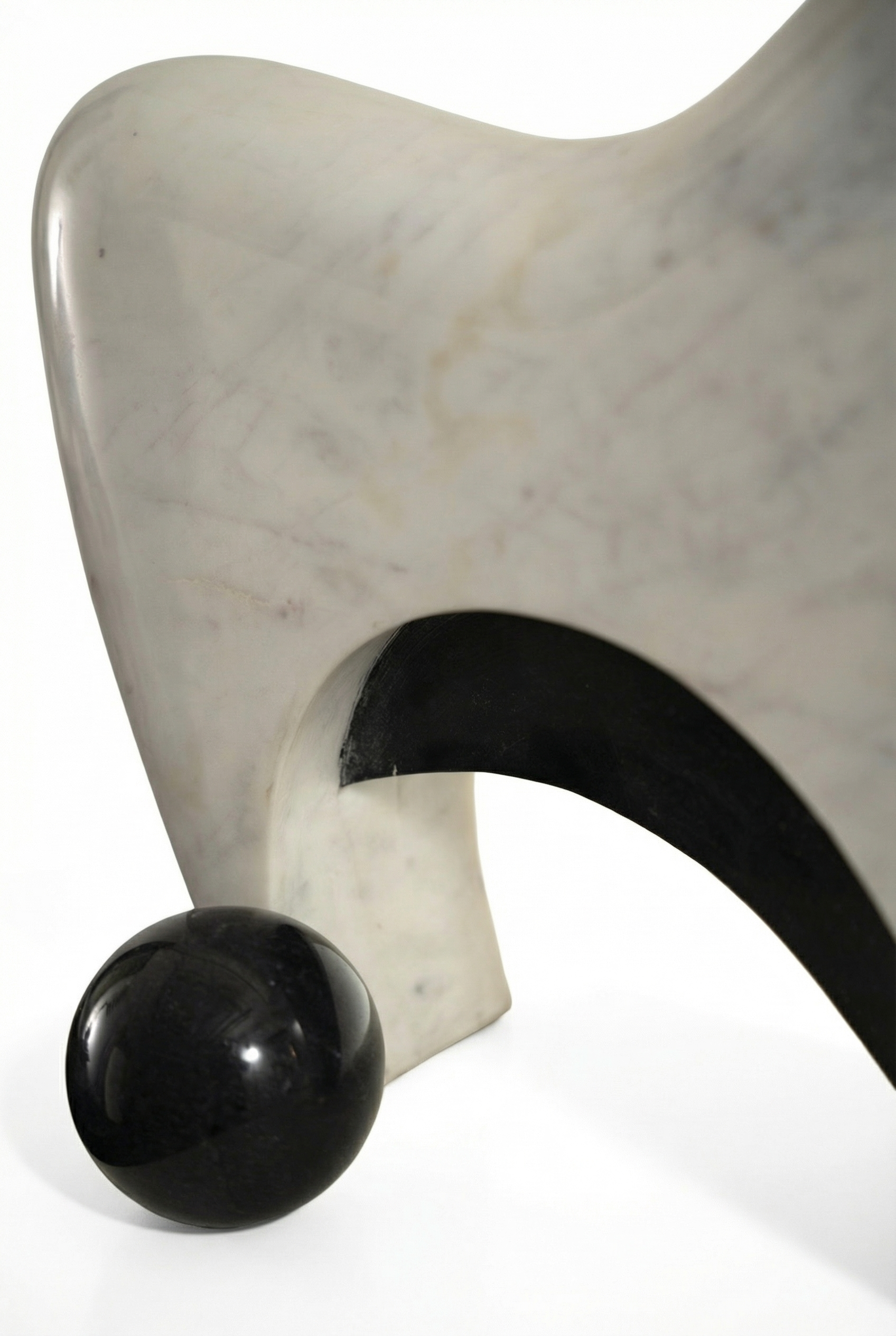 A sweeping white marble form with subtle veining is paired with a polished black marble arc and a detached sphere, creating a sculpture of contrasts. Its asymmetric profile suggests movement, while the precise pairing of materials conveys balance and refinement.