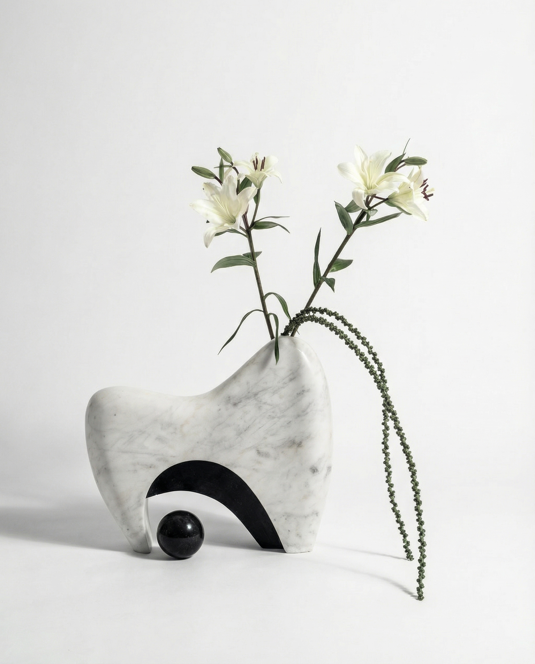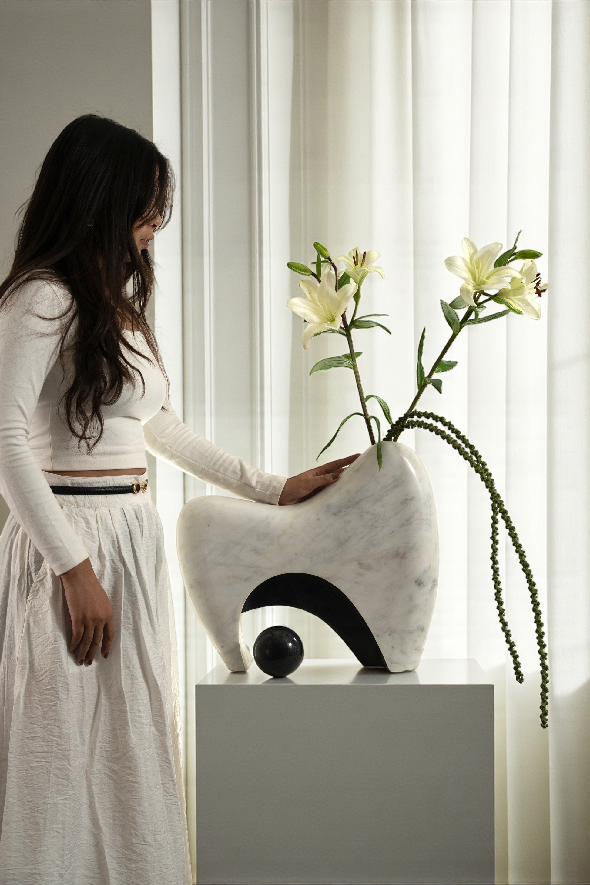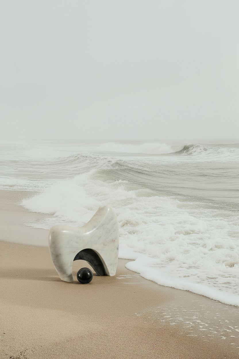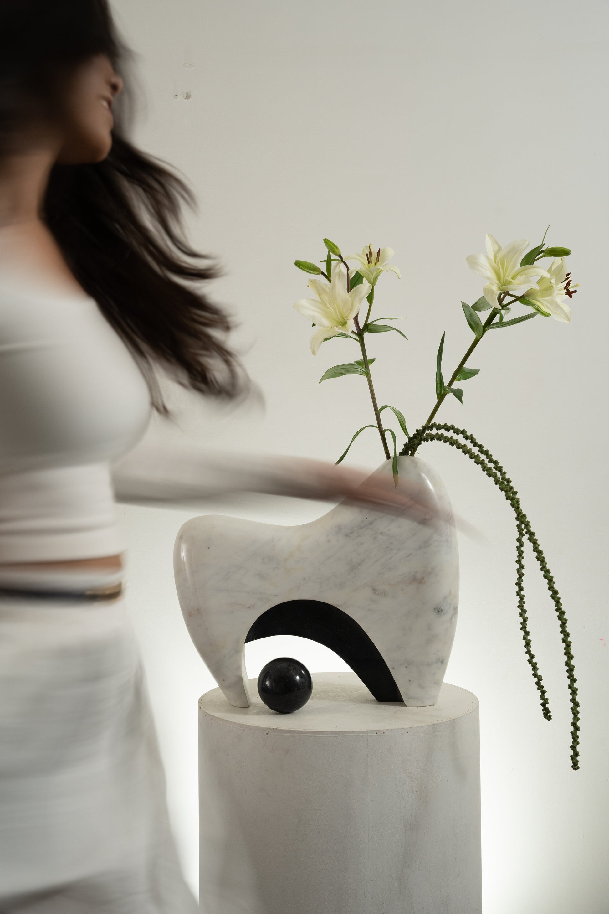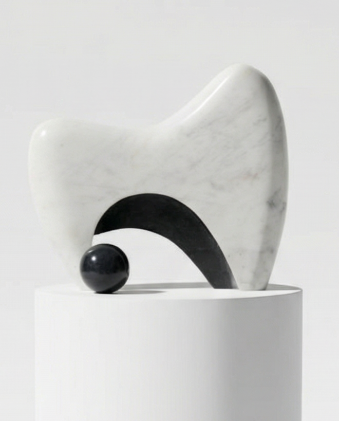 A sweeping white marble form with subtle veining is paired with a polished black marble arc and a detached sphere, creating a sculpture of contrasts. Its asymmetric profile suggests movement, while the precise pairing of materials conveys balance and refinement.