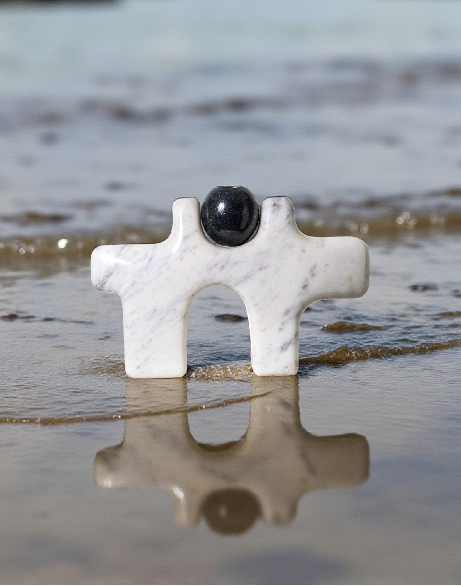 A white marble structure with twin column-like legs is punctuated by a polished black marble sphere, forming a sculptural study of contrast and proportion. The arched void introduces openness, while the smooth surfaces highlight the material’s tactile qualities.