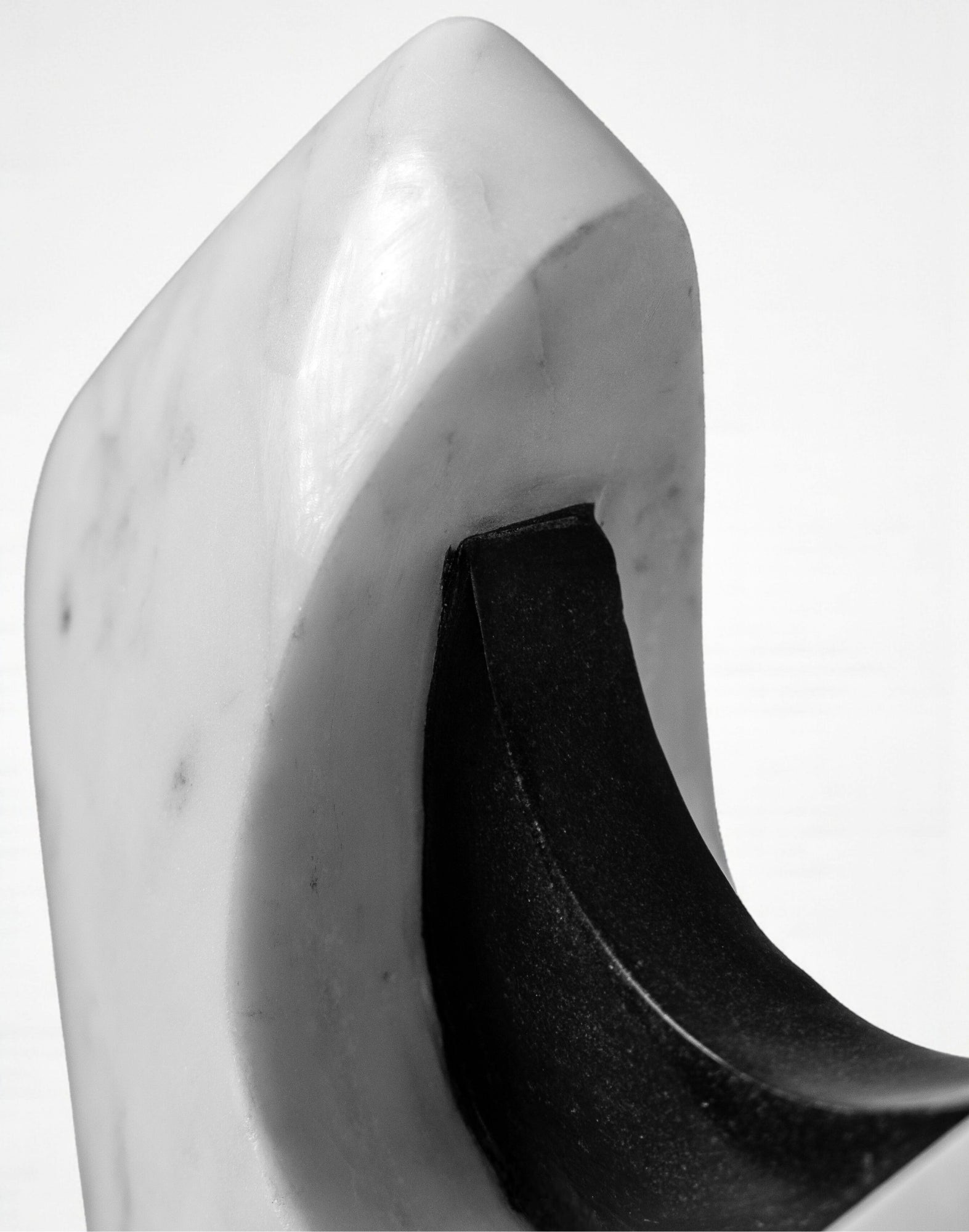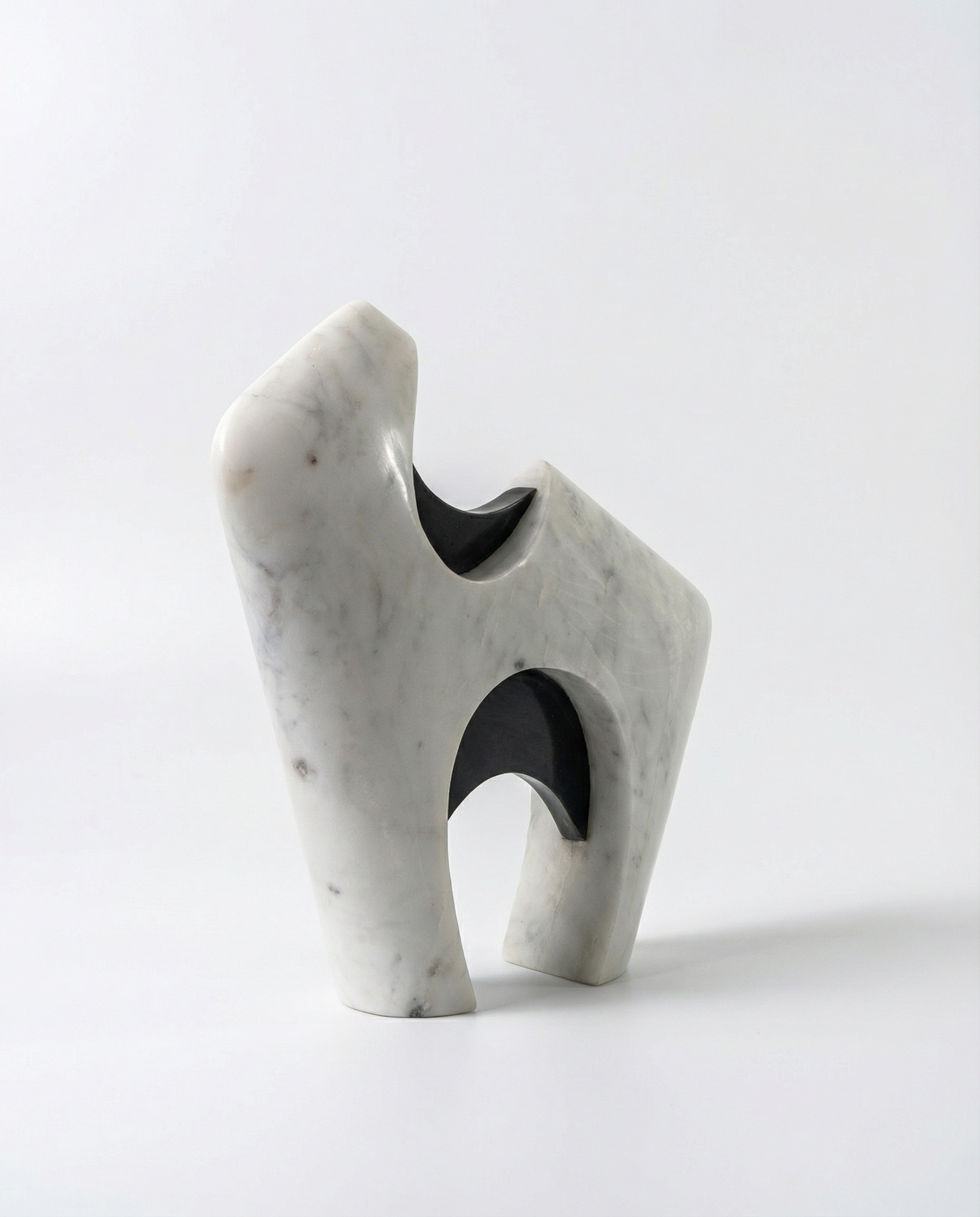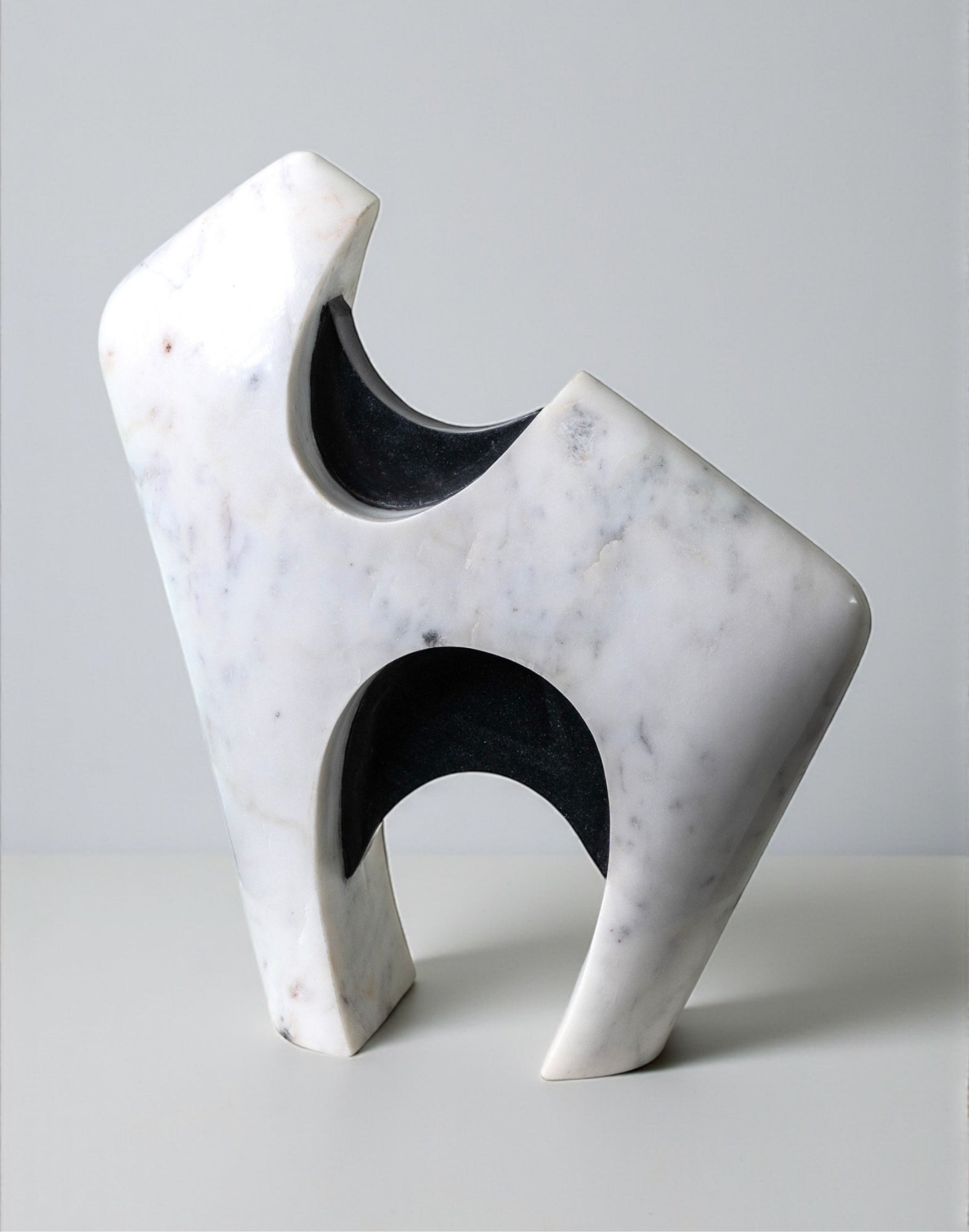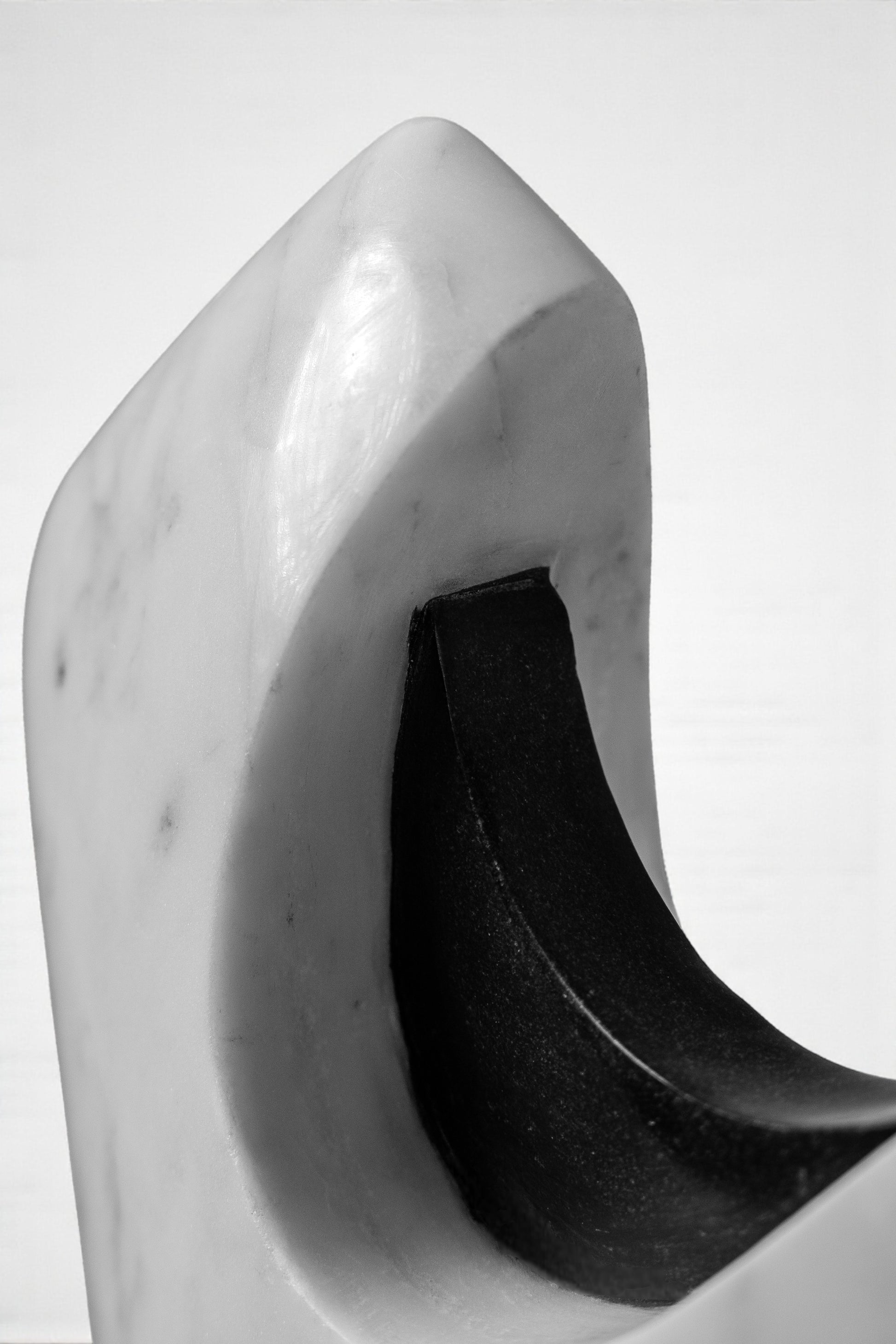 A sculptural form in smooth white marble is punctuated by polished black marble insets, creating a dynamic play of solid and hollow. The angled silhouette stands with an architectural presence, while the carved openings invite light to pass through, softening the weight of the stone.