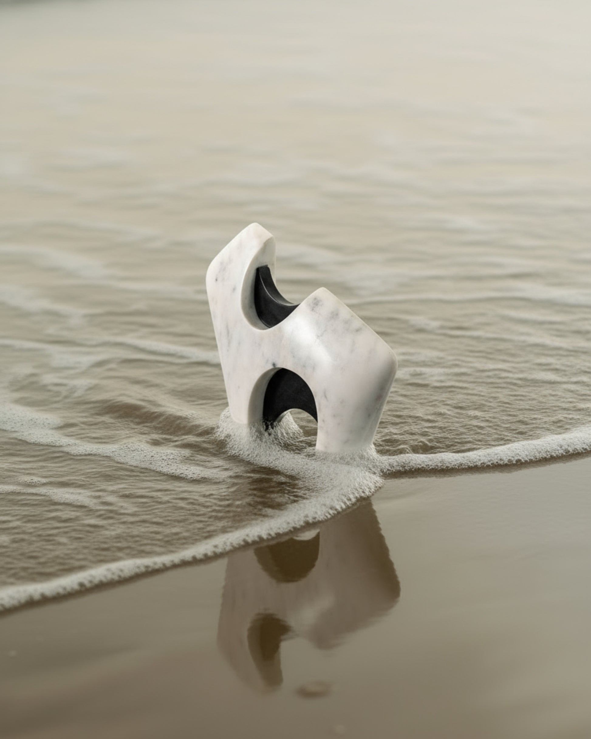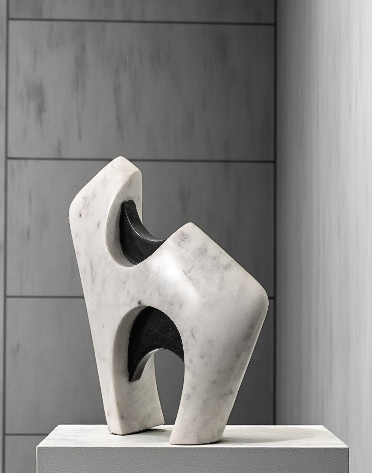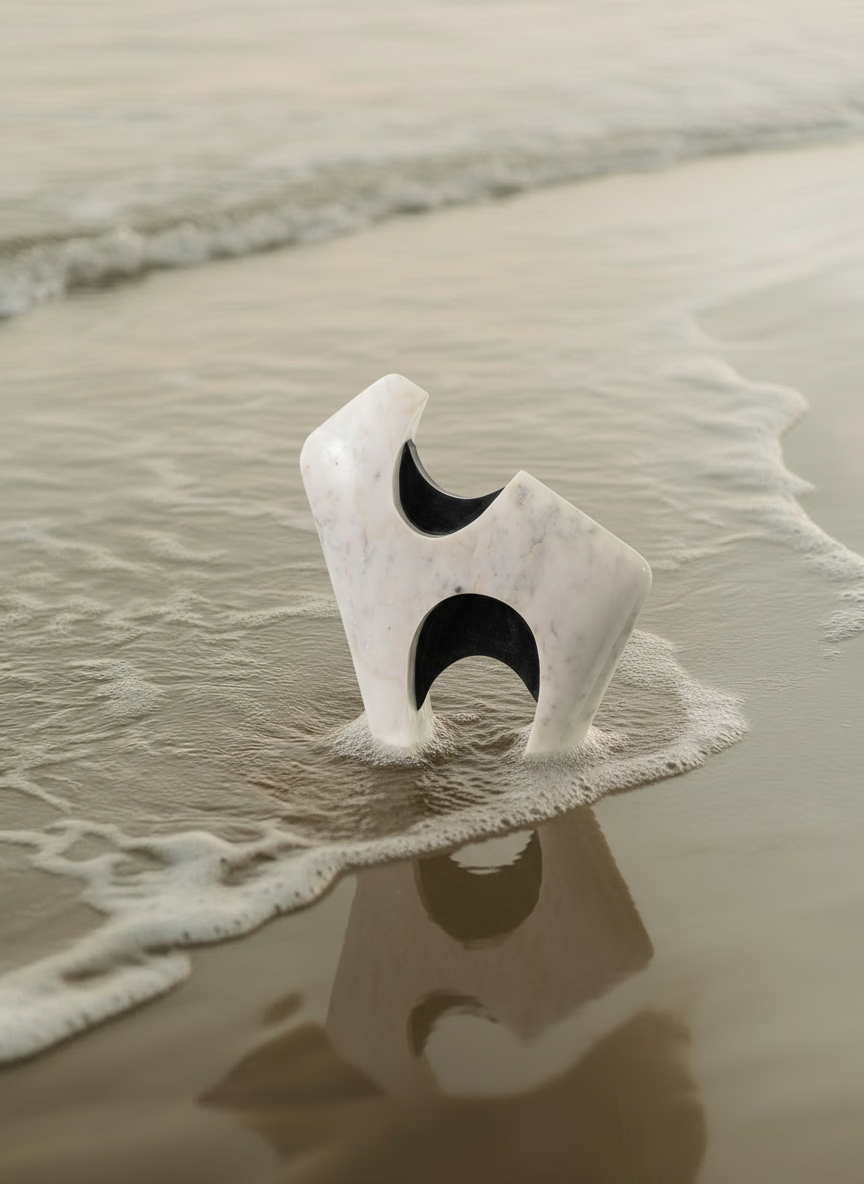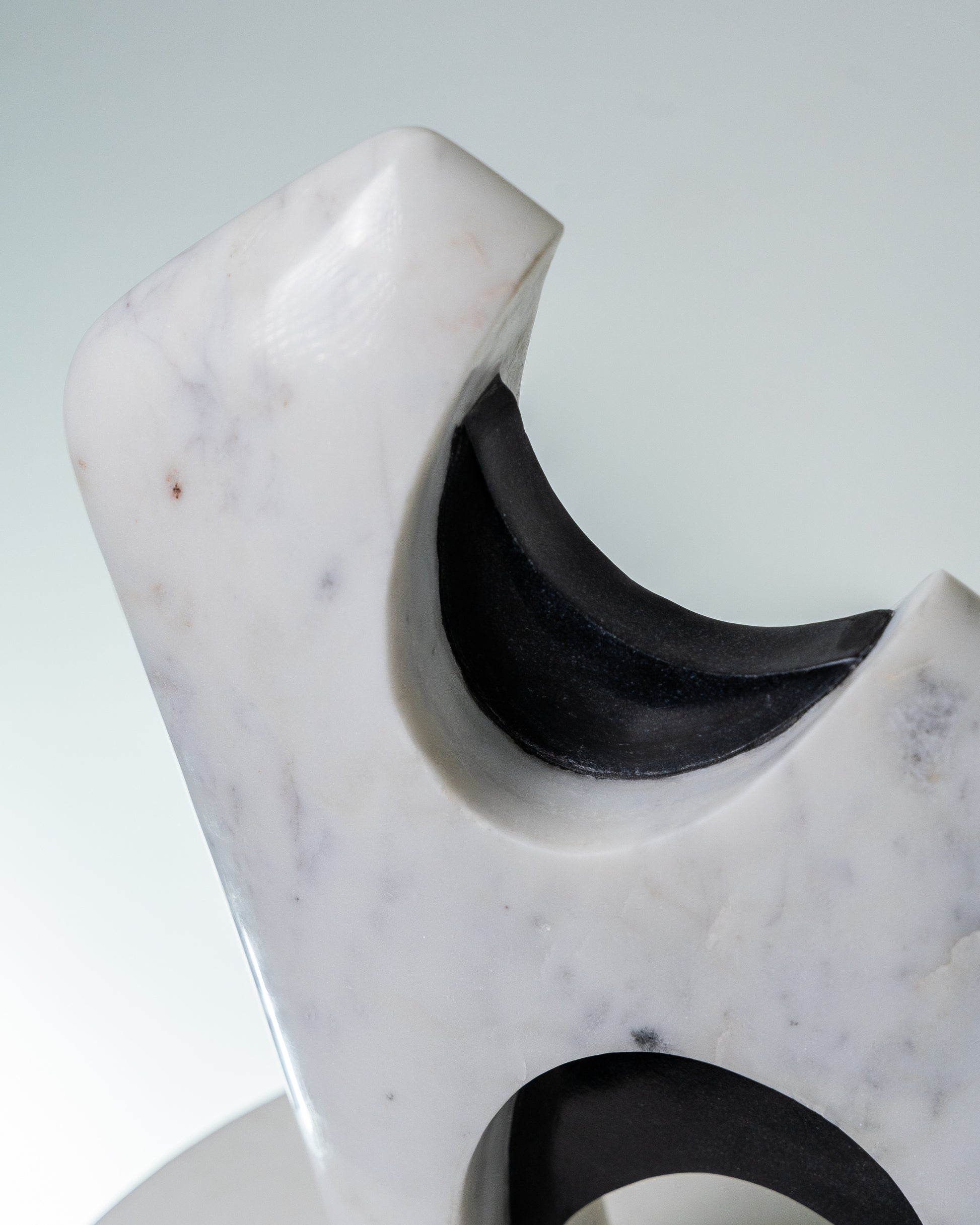 A sculptural form in smooth white marble is punctuated by polished black marble insets, creating a dynamic play of solid and hollow. The angled silhouette stands with an architectural presence, while the carved openings invite light to pass through, softening the weight of the stone.