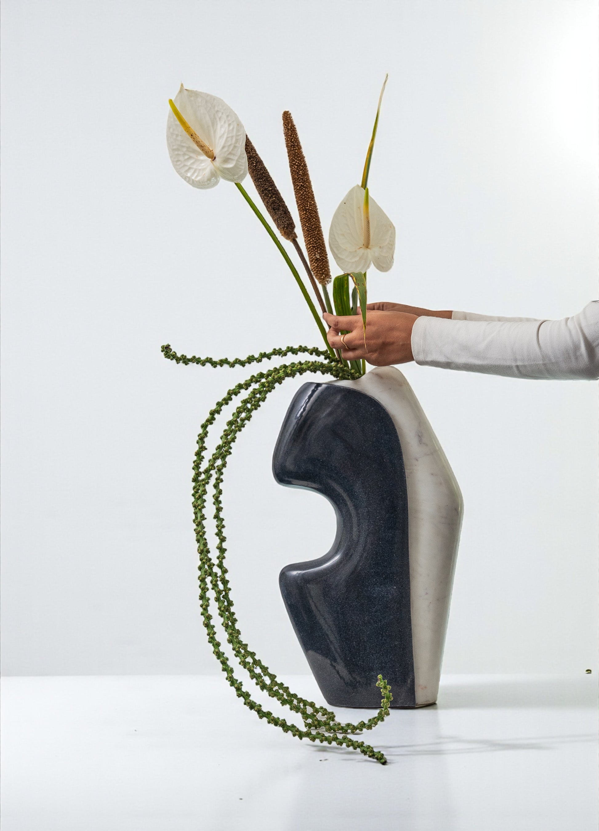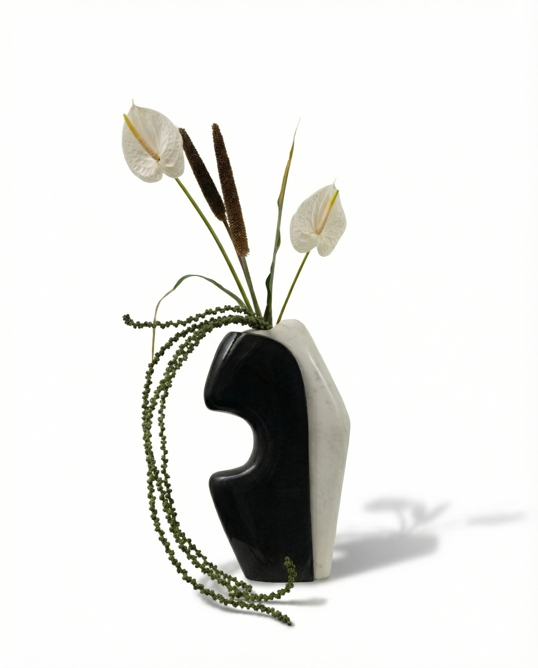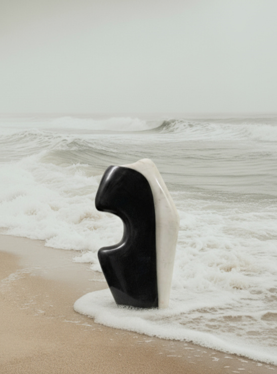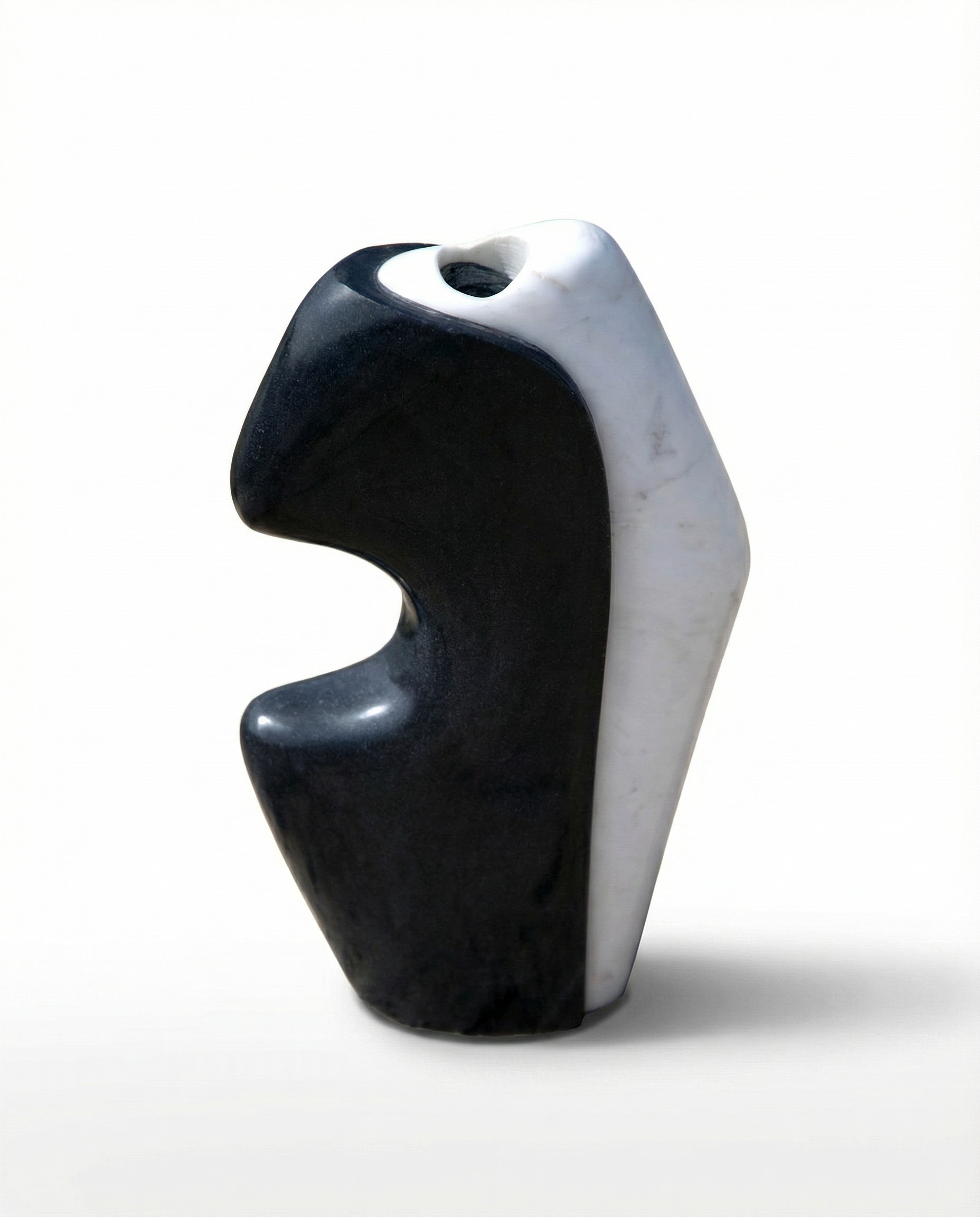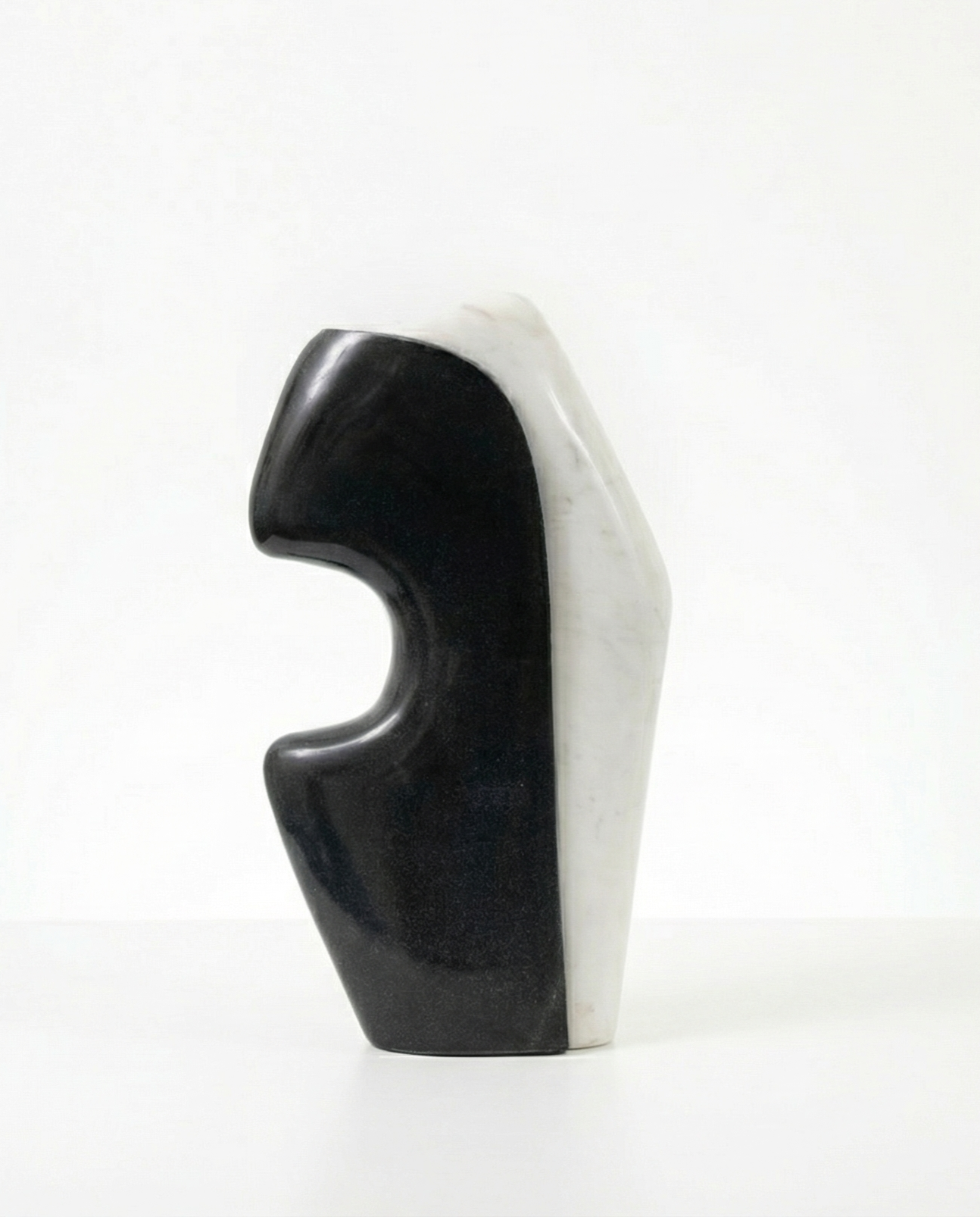 Crafted from black and white marble, this vertically sculpted object presents a striking interplay of opposites. A curved hollow runs between the two halves, softening the strong geometry and creating a natural point of visual and spatial tension.