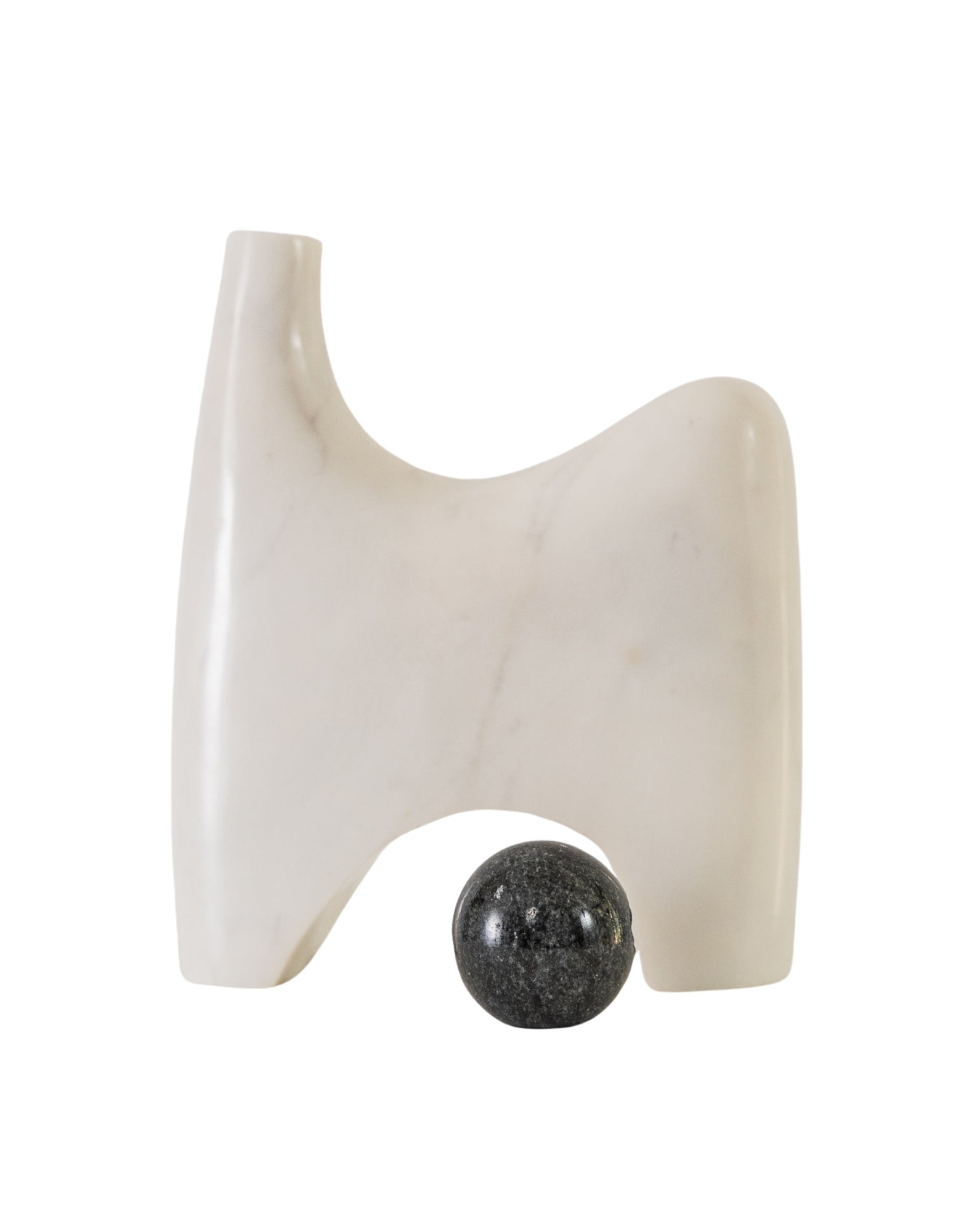 Sculpted from white marble, this piece is defined by its asymmetrical arch-like form, balanced on two grounded legs. Beneath, a polished black stone sphere rests, introducing contrast and reinforcing the dialogue between solidity and suspension.