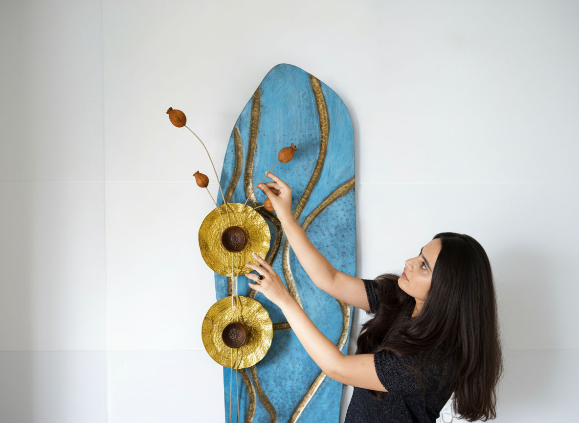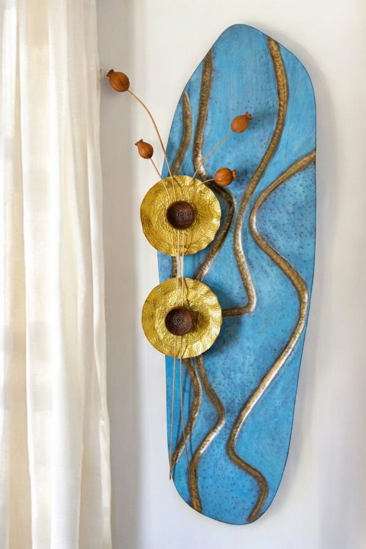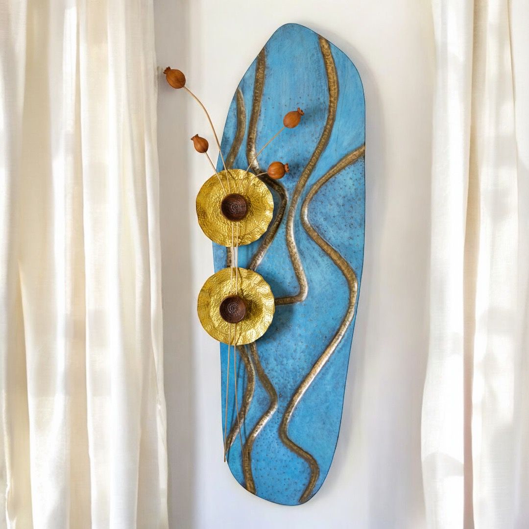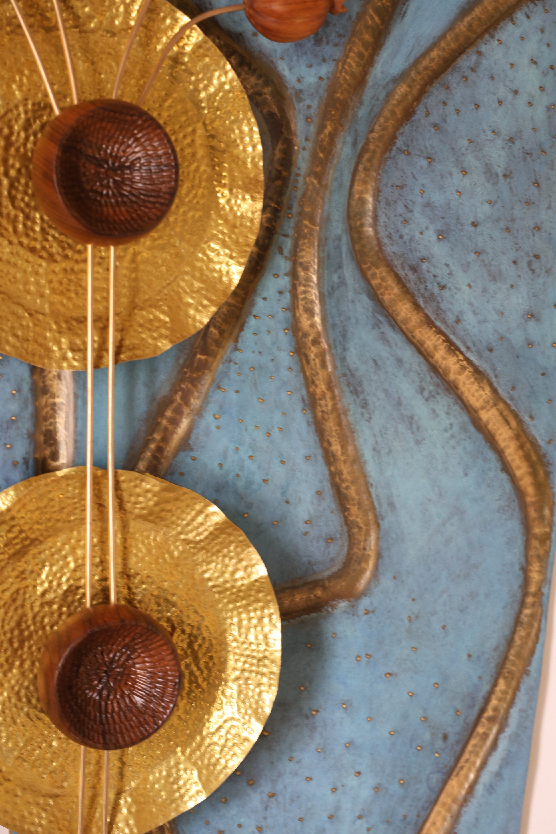 The intricate wavy lines, mimicking the gentle flow of water, blend the natural beauty of teak wood with the brass and lotus flowers, crafted from teak wood , symbolize enlightenment and spiritual growth.