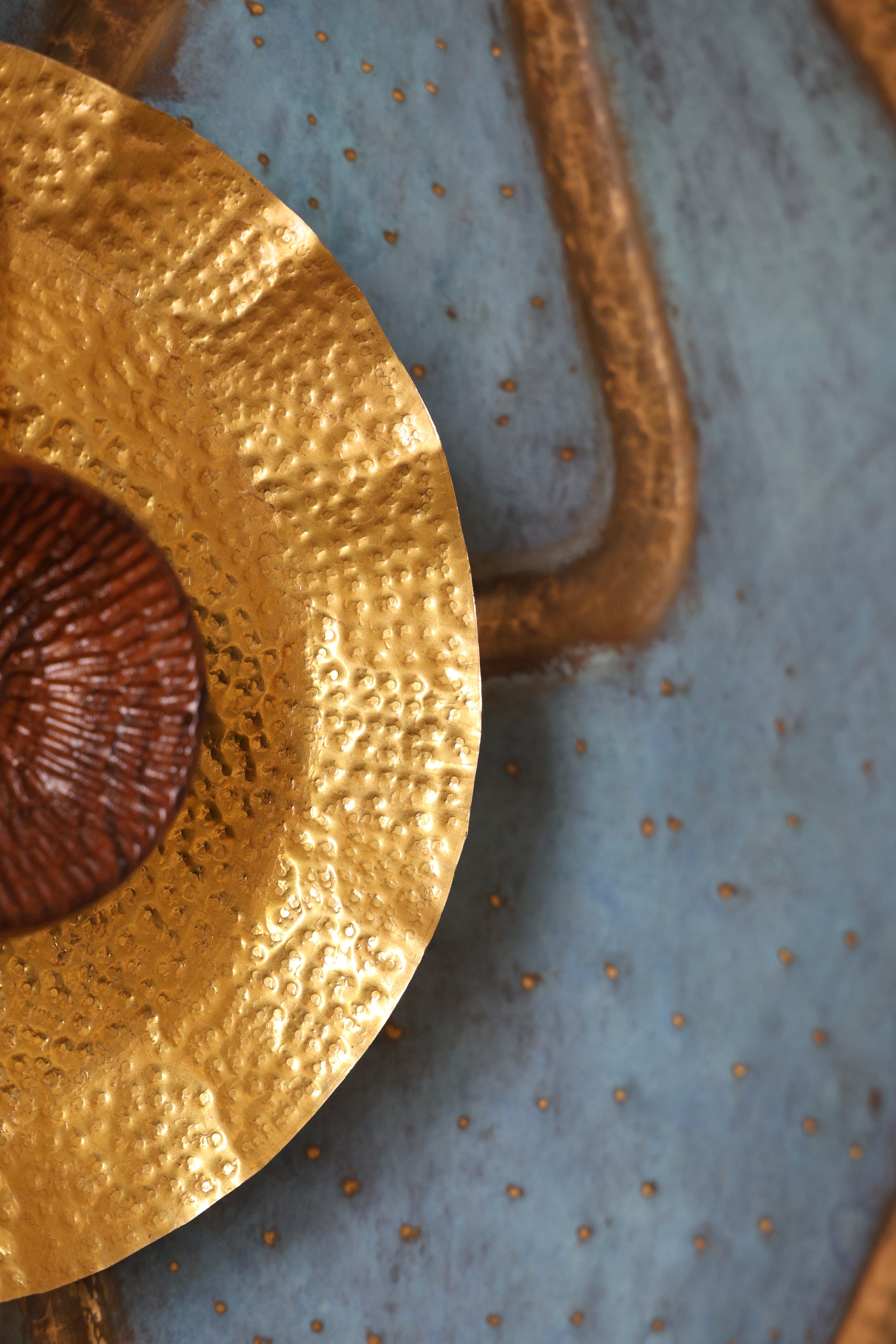 Clean with dry cloth. Natural Variation of grains and colours in wood and marble are not defects. We use reclaimed teak wood, which may have nail pots and cracks, which will be filled during polishing or kept as it is depending on the designer’s choice for the aesthetic. Brass may get dull or change colour with time or with oxidation, this is a natural tendency of the material.