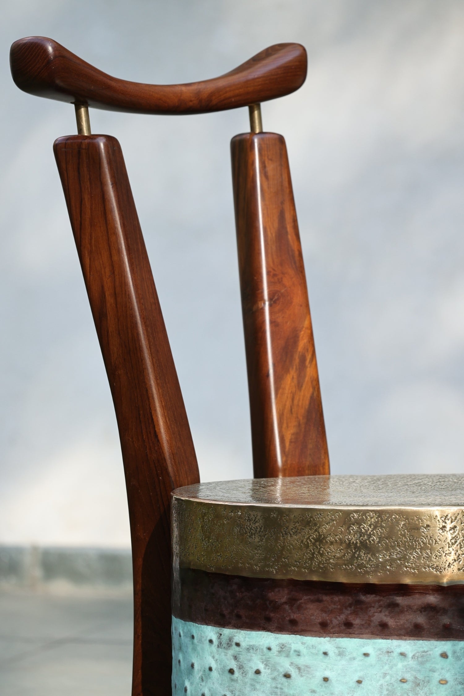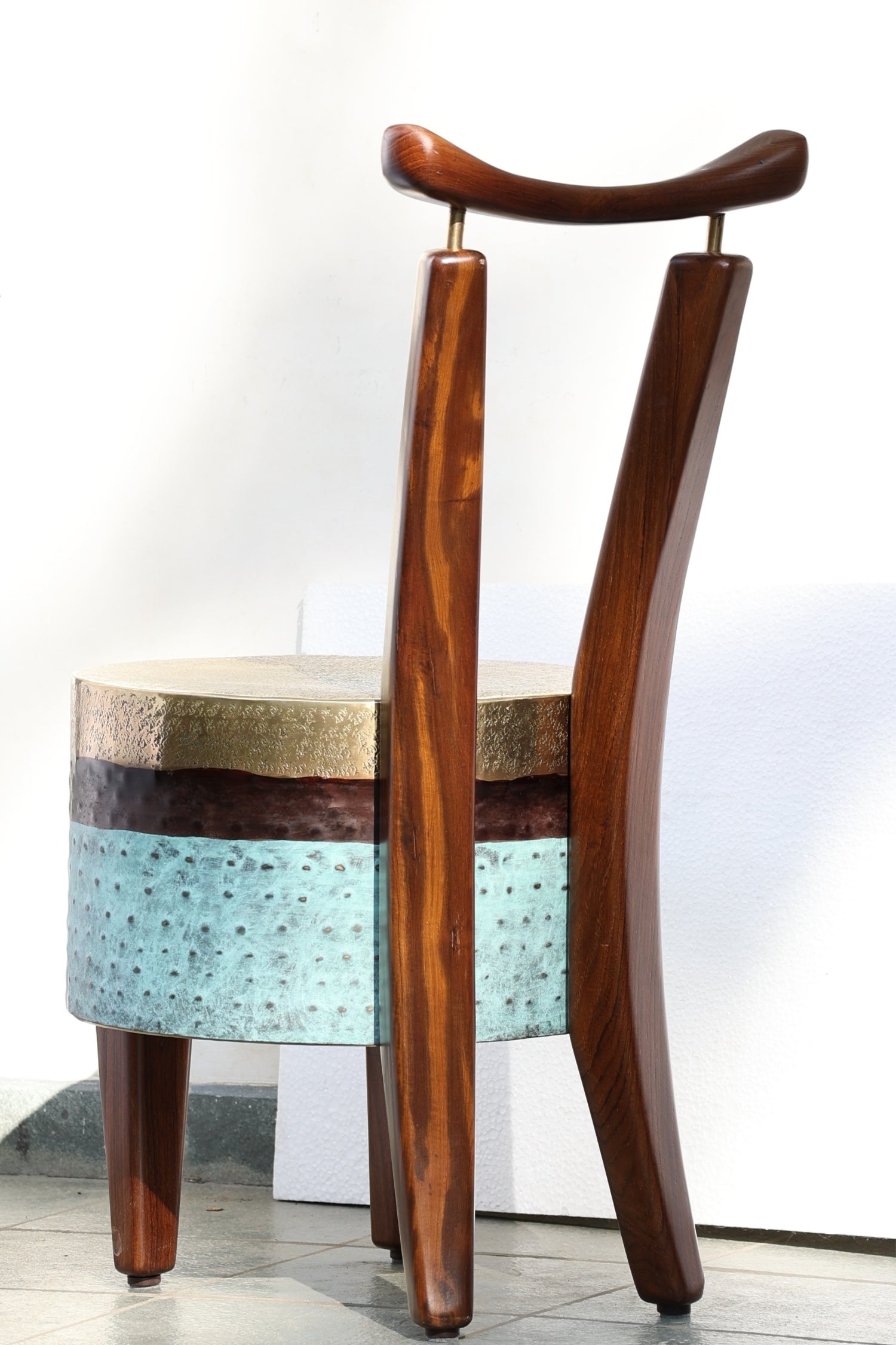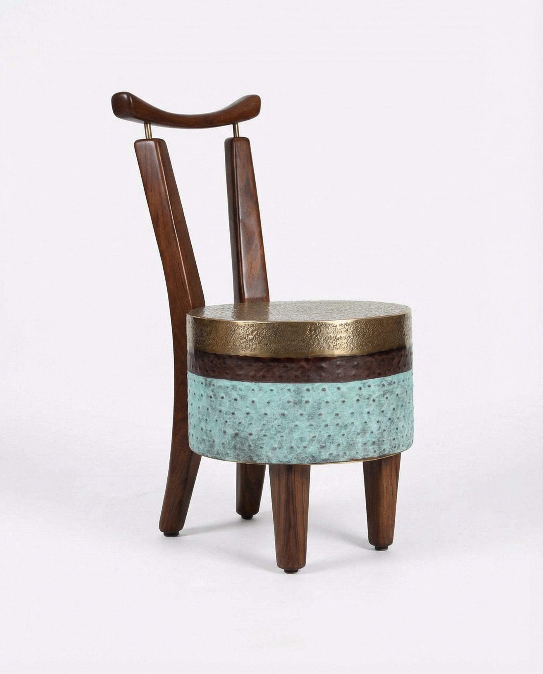 The chair stands with a bold yet graceful stance. It blends the warmth of wood with the richness of brass. The seat transitions through polished brass and earthy brown to a deep patinated green mirroring the shifting hues of a forest at dawn.