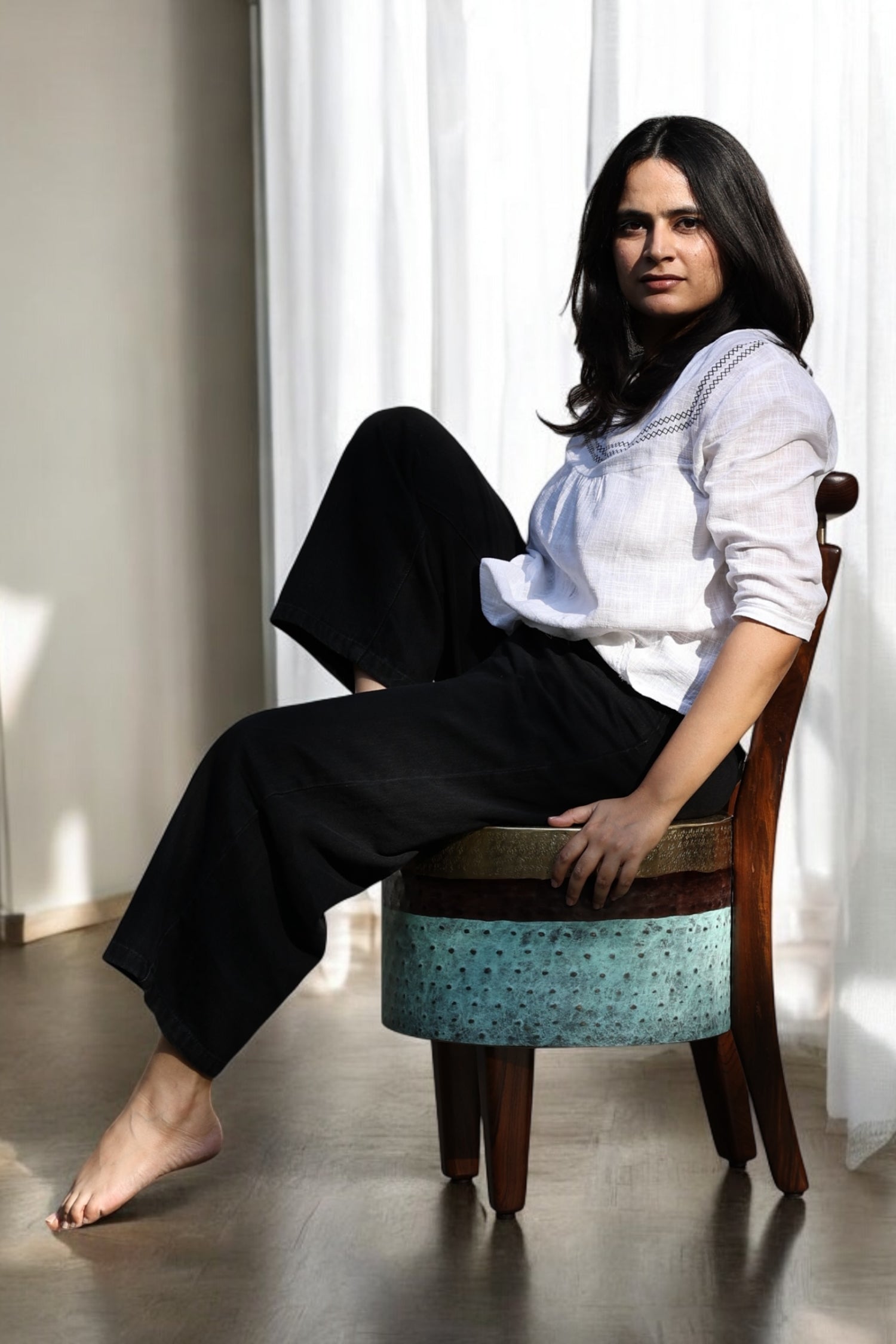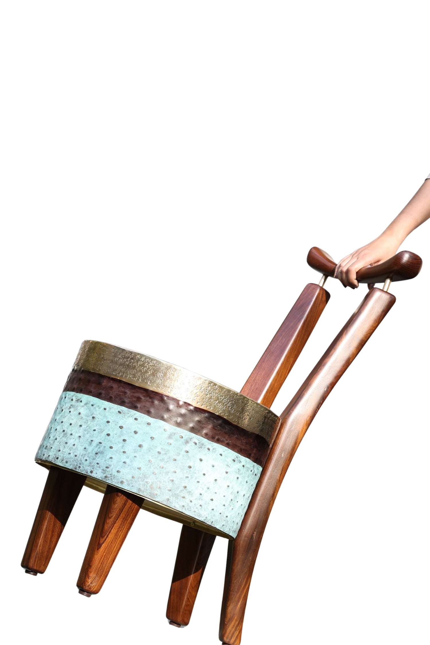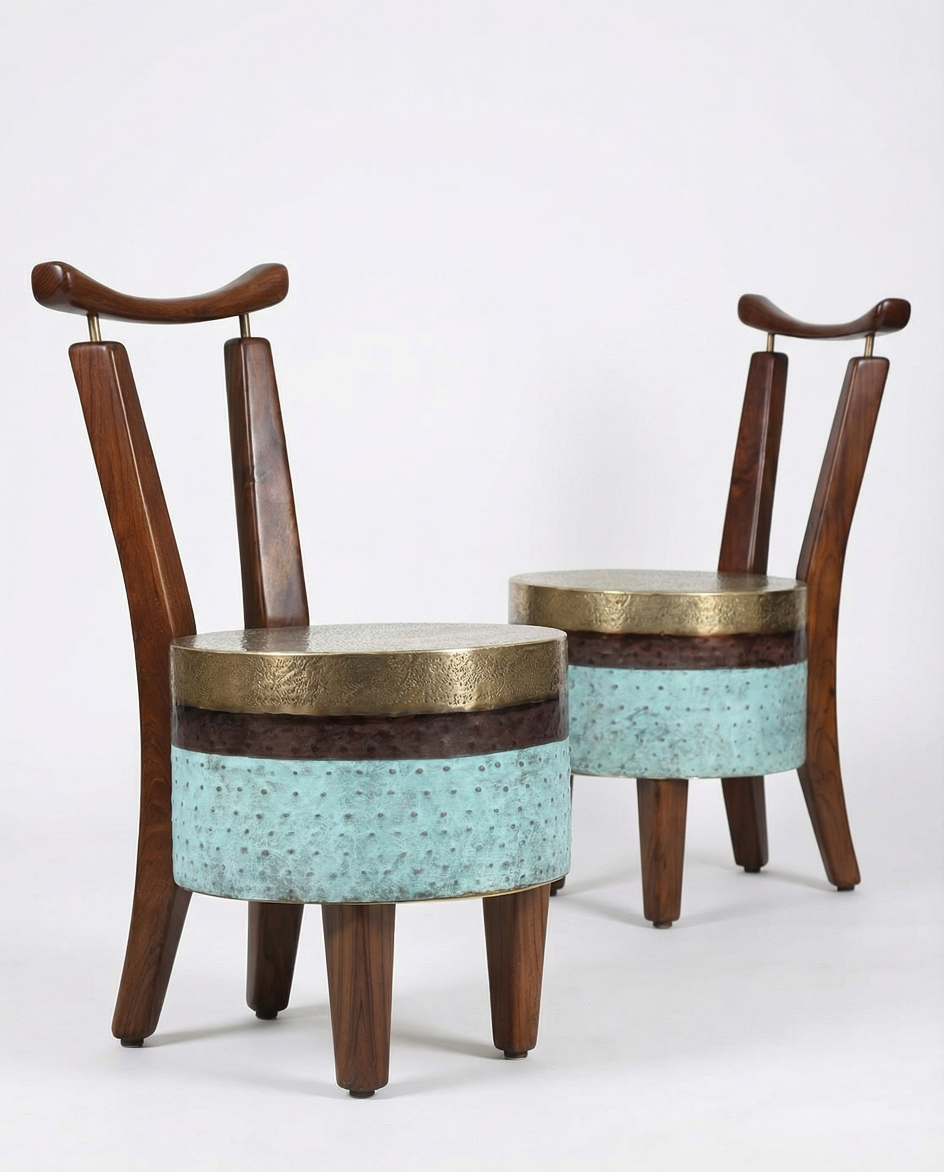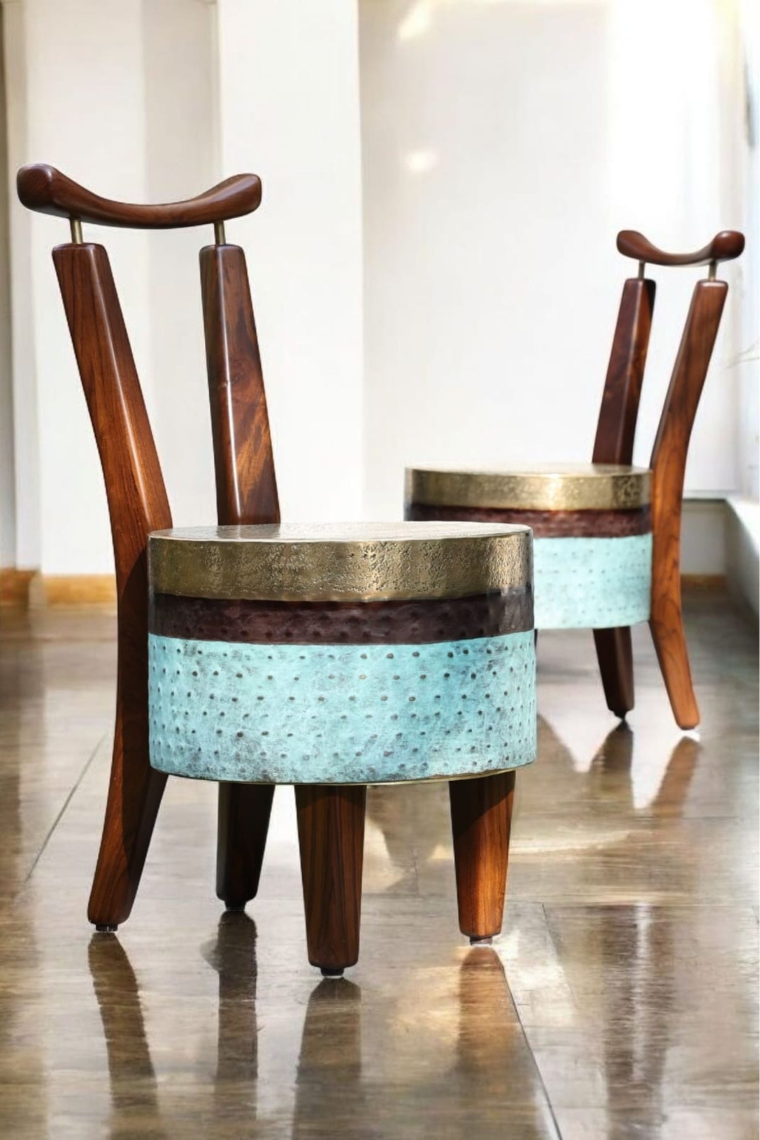 The chair stands with a bold yet graceful stance. It blends the warmth of wood with the richness of brass. The seat transitions through polished brass and earthy brown to a deep patinated green mirroring the shifting hues of a forest at dawn.
