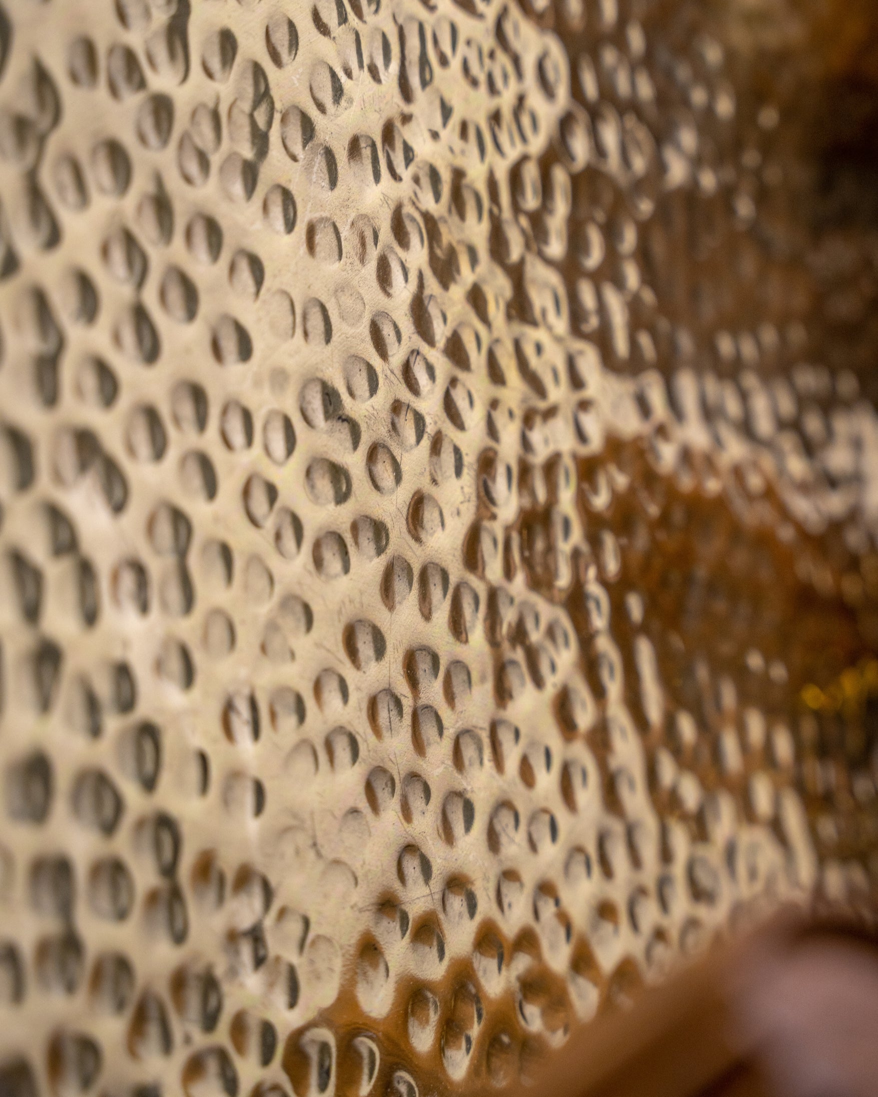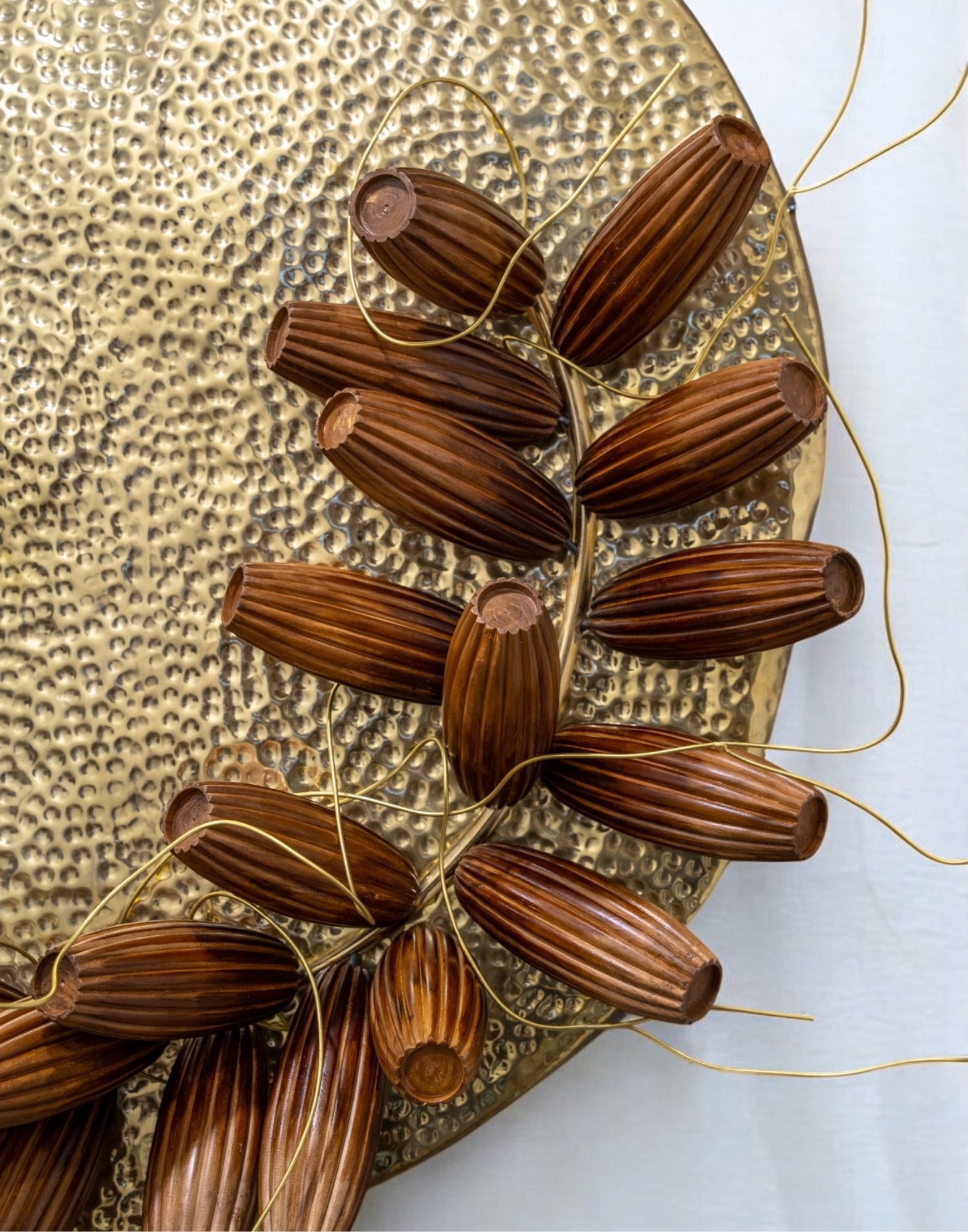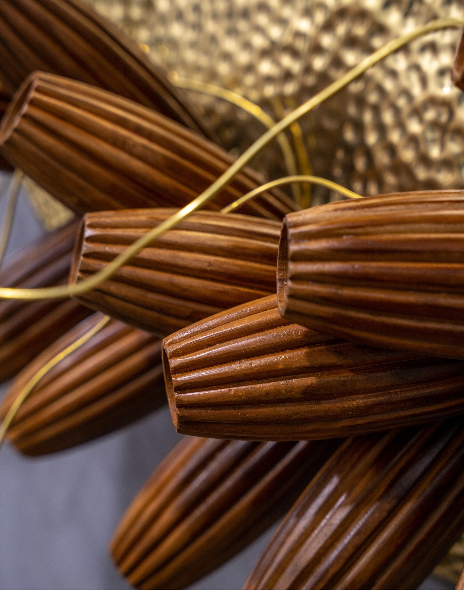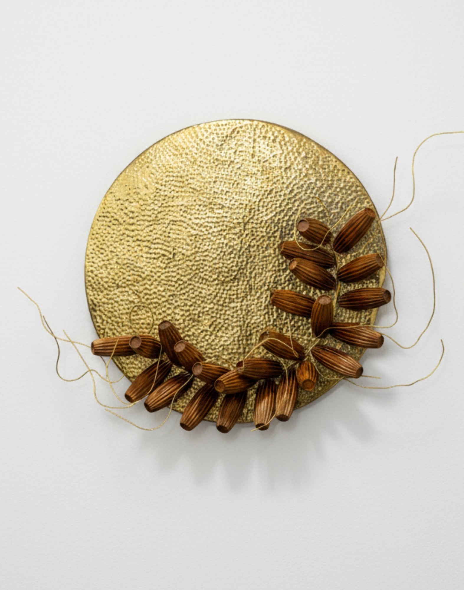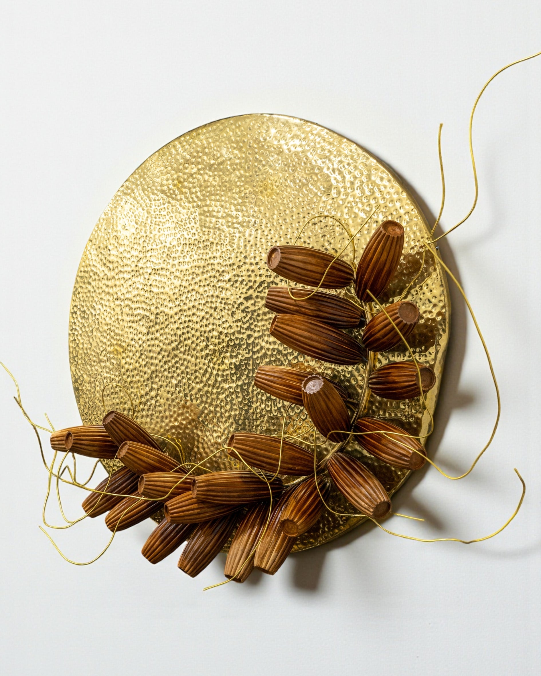 This wall art is crafted from hammered brass and wood, showcasing a perfect balance of texture and form. The radiant, hand-hammered brass disc creates a luminous backdrop, while the sculpted wooden elements bring warmth and organic detail. Together, they form a harmonious composition that blends nature with craftsmanship, making it a striking statement piece
